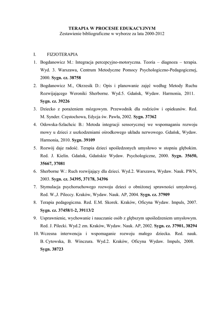 TERAPIA W PROCESIE EDUKACYJNYM Zestawienie bibliograficzne w wyborze za lata 2000-2012 I. FIZJOTERAPIA 1. Bogdanowicz M.: Integracja percepcyjno-motoryczna. Teoria – diagnoza – terapia. Wyd. 3. Warszawa, Centrum Metodyczne Pomocy Psychologiczno-Pedagogicznej, 2000. Sygn. cz. 38758 2. Bogdanowicz M., Okrzesik D.: Opis i planowanie zajęć według Metody Ruchu Rozwijającego Weroniki Sherborne. Wyd.5. Gdańsk, Wydaw. Harmonia, 2011. Sygn. cz. 39226 3. Dziecko z porażeniem mózgowym. Przewodnik dla rodziców i opiekunów. Red. M. Synder. Częstochowa, Edycja św. Pawła, 2002. Sygn. 37362 4. Odowska-Szlachcic B.: Metoda integracji sensorycznej we wspomaganiu rozwoju mowy u dzieci z uszkodzeniami ośrodkowego układu nerwowego. Gdańsk, Wydaw. Harmonia, 2010. Sygn. 39109 5. Rozwój daje radość. Terapia dzieci upośledzonych umysłowo w stopniu głębokim. Red. J. Kielin. Gdańsk, Gdańskie Wydaw. Psychologiczne, 2000. Sygn. 35650, 35667, 37081 6. Sherborne W.: Ruch rozwijający dla dzieci. Wyd.2. Warszawa, Wydaw. Nauk. PWN, 2003. Sygn. cz. 34395, 37178, 34396 7. Stymulacja psychoruchowego rozwoju dzieci o obniżonej sprawności umysłowej. Red. W.,J. Pileccy. Kraków, Wydaw. Nauk. AP, 2004. Sygn. cz. 37909 8. Terapia pedagogiczna. Red. E.M. Skorek. Kraków, Oficyna Wydaw. Impuls, 2007. Sygn. cz. 37458/1-2, 39113/2 9. Usprawnienie, wychowanie i nauczanie osób z głębszym upośledzeniem umysłowym. Red. J. Pilecki. Wyd.2 zm. Kraków, Wydaw. Nauk. AP, 2002. Sygn. cz. 37901, 38294 10. Wczesna interwencja i wspomaganie rozwoju małego dziecka. Red. nauk. B. Cytowska, B. Winczura. Wyd.2. Kraków, Oficyna Wydaw. Impuls, 2008. Sygn. 38723 II. MUZYKOTERAPIA 1. Jutrzyna E.: Terapia muzyką w teorii i praktyce tyflologicznej. Warszawa, Polski Związek Niewidomych, 2007. Sygn. cz. 38582 2. Nordoff P., Robbins C.: Terapia muzyką w pracy z dziećmi niepełnosprawnymi. Historia, metoda i praktyka. Kraków, Oficyna Wydaw. Impuls, 2008. Sygn. cz. 38083, 38364 3. Raszewska M., Kuleczka W.: Muzyka otwiera nam świat. Program muzycznych zajęć edukacyjno-terapeutycznych dla dzieci z niepełnosprawnością intelektualną w stopniu umiarkowanym i znacznym oraz dzieci z autyzmem. Gdańsk, Wydaw. Harmonia, 2009. Sygn. 39239 4. Stachyra K.: Muzykoterapia i wizualizacja w rozwijaniu kompetencji emocjonalnych studentów pedagogiki. Lublin, Wydaw. UMCS, 2009. Sygn. 38344 III. ANIMALOTERAPIA 1. Dogoterapii. Terapia kontaktowa z udziałem psów. Założenia i wykorzystanie w pracy z osobami niepełnosprawnymi. Warszawa, Przyjaciel – Fundacja Pomocy Osobom Niepełnosprawnym, 2003. Sygn. 37217 2. Franczyk A., Krajewska K., Skorupa J.: Animaloterapia. Program Przedszkolnego Klubu Animals „Cztery łapy”. Wyd.2. Kraków, Oficyna Wydaw. Impuls, 2008. Sygn. 38335 3. Kulisiewicz B.: Dogoterapia we wspomaganiu nauki i usprawnianiu techniki czytania. Kraków, Oficyna Wydaw. Impuls, 2009. Sygn. 38416 4. Kulisiewicz B.: Witaj piesku! Dogoterapia we wspomaganiu rozwoju dzieci o specjalnych potrzebach edukacyjnych. Kraków, Oficyna Wydaw. Impuls, 2007. Sygn. 38415 5. Machoś-Nikodem M.: Dogoterapeutyczny program polisensorycznej stymulacji porozumiewania się. Poradnik dla logopedów, dogoterapeutów i nauczycieli wykorzystujących terapię kontaktową w pracy z dziećmi z dysfunkcjami rozwojowymi. Warszawa, Centrum Metodyczne Pomocy Psychologiczno- Pedagogicznej, 2007. Sygn. 38763 6. Popławska A.: Pies przyjaciel i terapeuta. Program dogoterapii przeznaczony do pracy z dzieckiem niepełnosprawnym. Warszawa, Przyjaciel – Fundacja Pomocy Osobom Niepełnosprawnym, 2004. Sygn. 37218 2 IV. BIBLIOTERAPIA 1. Biblioterapia w praktyce. Poradnik dla nauczycieli, wychowawców i terapeutów. Red. E. J. Konieczna. Kraków, Oficyna Wydaw. Impuls, 2006. Sygn. cz. 37635, 37691 2. Borecka I.: Biblioterapia w edukacji czytelniczej i medialnej w szkole podstawowej i gimnazjum. Materiały dydaktyczne dla nauczycieli i bibliotekarzy. Wałbrzych, Wydaw. UNUS, 2002. Sygn. 37602 3. Borecka I., Wontorowska-Cichy niepełnosprawnego intelektualnie. S.: Biblioterapia Materiały w edukacji dydaktyczne dla dziecka nauczycieli i bibliotekarzy. Wałbrzych, Wydaw. UNUS, 2003. Sygn. 37601 4. Brutt D.: Bajki, które leczą. Cz.1-2. Gdańsk, Gdańskie Wydaw. Psychologiczne, 2006-2007. Sygn. 38970/1-2 5. Franaszczuk-Truszkowska M.: Biblioterapia dla klas IV-VI szkoły podstawowej. Gdańsk, Wydaw. Harmonia, 2006. Sygn. 39222 6. Kruszewski T.: Biblioterapia w działaniach placówek opiekuńczo-wychowawczych. Toruń, Wydaw. Edukacyjne Akapit, 2006. Sygn. 37674 7. Molicka M.: Bajki terapeutyczne. Cz.1-2. Poznań, Wydaw. Media Rodzina, 2003. Sygn. 37755/1-2, 38136/1-2 8. Molicka M.: Bajkoterapia. O lękach dzieci i nowej metodzie terapii. Poznań, Wydaw. Media Rodzina, 2002. Sygn. 38169 9. Wrona H.: Mała Zuzia. Warszawa, PARPA, 2006. Sygn. 39331 10. Wrona H.: Rodzina misiów. Warszawa, PARPA, 2005. Sygn. 39332 V. LECZENIE PRACĄ – TERAPIA ZAJĘCIOWA 1. Baum E.: Terapia zajęciowa. Warszawa, Wydaw. Fraszka Edukacyjna, 2008. Sygn. cz. 38246, 38883 2. Borowska-Beszta B.: Echa ekspresji. Kulturoterapia w andragogice specjalnej. Kraków, Oficyna Wydaw. Impuls, 2008. Sygn. 38464 3. Diagnoza i rewalidacja indywidualna dziecka ze specjalnymi potrzebami edukacyjnymi. Red. M. Klaczak, P. Majewicz. Kraków, Wydaw. Nauk. AP, 2006. Sygn. cz. 37902, 38290 4. Dziecko z zaburzeniami w rozwoju. Konteksty diagnostyczne i terapeutyczne. Red. B. Cytowska, B. Winczura. Kraków, Oficyna Wydaw. Impuls, 2005. Sygn. cz. 37407 5. Kalbarczyk M.: Świat otwarty dla niewidomych. Szanse i możliwości. Warszawa, WSiP, 2004. Sygn. 37254 3 6. Knill Ch.: Dotyk i komunikacja. Warszawa, Centrum Metodyczne Pomocy Psychologiczno-Pedagogicznej, 2009. Sygn. cz.38771 7. Kott T.: Zajęcia pozalekcyjne i terapia zajęciowa z osobami o obniżonej sprawności umysłowej. Warszawa, Wydaw. Akademii Pedagogiki Specjalnej, 2002. Sygn. cz.37626 8. Teoretyczne i praktyczne aspekty terapii pedagogiczne