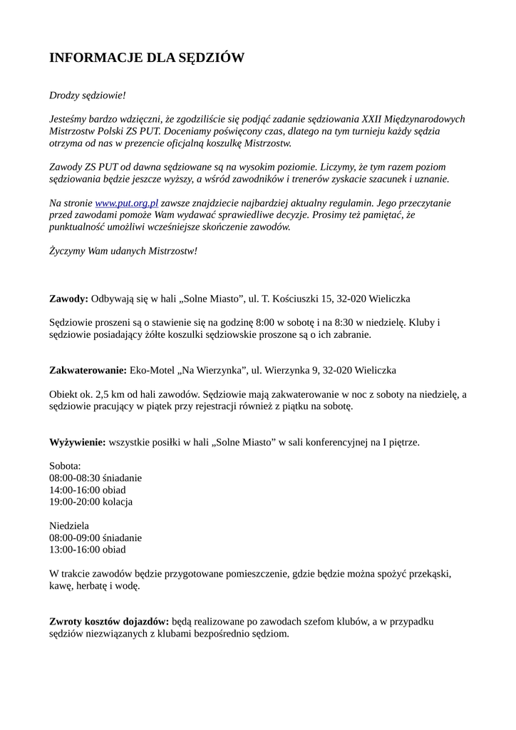 INFORMACJE DLA SĘDZIÓW Drodzy sędziowie! Jesteśmy bardzo wdzięczni, że zgodziliście się podjąć zadanie sędziowania XXII Międzynarodowych Mistrzostw Polski ZS PUT. Doceniamy poświęcony czas, dlatego na tym turnieju każdy sędzia otrzyma od nas w prezencie oficjalną koszulkę Mistrzostw. Zawody ZS PUT od dawna sędziowane są na wysokim poziomie. Liczymy, że tym razem poziom sędziowania będzie jeszcze wyższy, a wśród zawodników i trenerów zyskacie szacunek i uznanie. Na stronie www.put.org.pl zawsze znajdziecie najbardziej aktualny regulamin. Jego przeczytanie przed zawodami pomoże Wam wydawać sprawiedliwe decyzje. Prosimy też pamiętać, że punktualność umożliwi wcześniejsze skończenie zawodów. Życzymy Wam udanych Mistrzostw! Zawody: Odbywają się w hali „Solne Miasto”, ul. T. Kościuszki 15, 32-020 Wieliczka Sędziowie proszeni są o stawienie się na godzinę 8:00 w sobotę i na 8:30 w niedzielę. Kluby i sędziowie posiadający żółte koszulki sędziowskie proszone są o ich zabranie. Zakwaterowanie: Eko-Motel „Na Wierzynka”, ul. Wierzynka 9, 32-020 Wieliczka Obiekt ok. 2,5 km od hali zawodów. Sędziowie mają zakwaterowanie w noc z soboty na niedzielę, a sędziowie pracujący w piątek przy rejestracji również z piątku na sobotę. Wyżywienie: wszystkie posiłki w hali „Solne Miasto” w sali konferencyjnej na I piętrze. Sobota: 08:00-08:30 śniadanie 14:00-16:00 obiad 19:00-20:00 kolacja Niedziela 08:00-09:00 śniadanie 13:00-16:00 obiad W trakcie zawodów będzie przygotowane pomieszczenie, gdzie będzie można spożyć przekąski, kawę, herbatę i wodę. Zwroty kosztów dojazdów: będą realizowane po zawodach szefom klubów, a w przypadku sędziów niezwiązanych z klubami bezpośrednio sędziom.