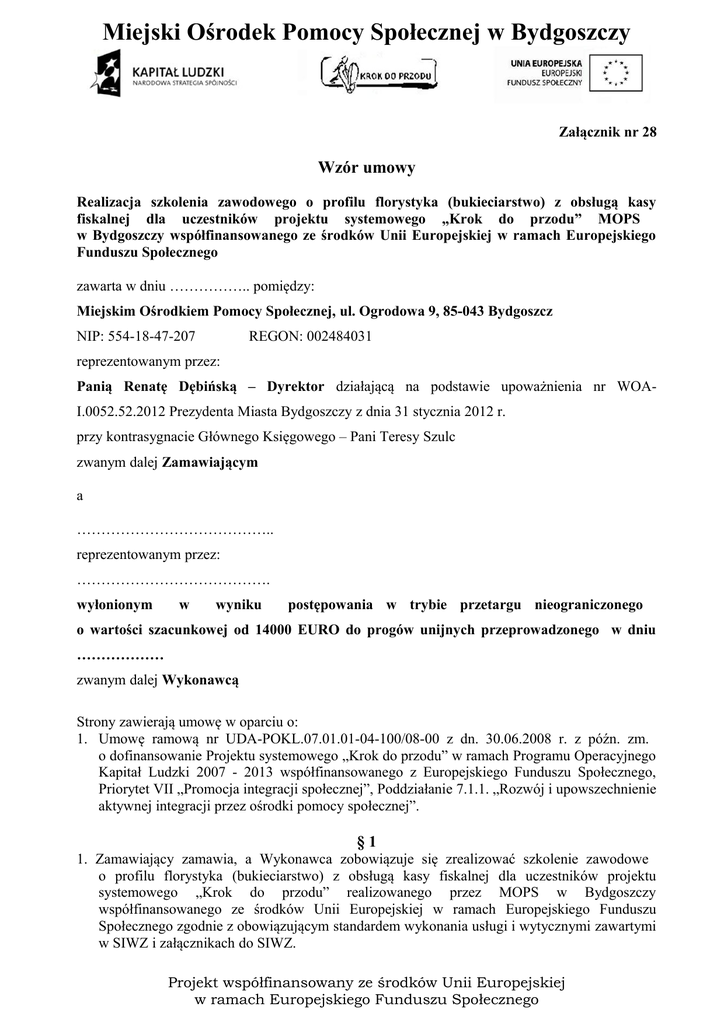 Miejski Ośrodek Pomocy Społecznej w Bydgoszczy Załącznik nr 28 Wzór umowy Realizacja szkolenia zawodowego o profilu florystyka (bukieciarstwo) z obsługą kasy fiskalnej dla uczestników projektu systemowego „Krok do przodu” MOPS w Bydgoszczy współfinansowanego ze środków Unii Europejskiej w ramach Europejskiego Funduszu Społecznego zawarta w dniu …………….. pomiędzy: Miejskim Ośrodkiem Pomocy Społecznej, ul. Ogrodowa 9, 85-043 Bydgoszcz NIP: 554-18-47-207 REGON: 002484031 reprezentowanym przez: Panią Renatę Dębińską – Dyrektor działającą na podstawie upoważnienia nr WOAI.0052.52.2012 Prezydenta Miasta Bydgoszczy z dnia 31 stycznia 2012 r. przy kontrasygnacie Głównego Księgowego – Pani Teresy Szulc zwanym dalej Zamawiającym a ………………………………….. reprezentowanym przez: …………………………………. wyłonionym w wyniku postępowania w trybie przetargu nieograniczonego o wartości szacunkowej od 14000 EURO do progów unijnych przeprowadzonego w dniu ……………… zwanym dalej Wykonawcą Strony zawierają umowę w oparciu o: 1. Umowę ramową nr UDA-POKL.07.01.01-04-100/08-00 z dn. 30.06.2008 r. z późn. zm. o dofinansowanie Projektu systemowego „Krok do przodu” w ramach Programu Operacyjnego Kapitał Ludzki 2007 - 2013 współfinansowanego z Europejskiego Funduszu Społecznego, Priorytet VII „Promocja integracji społecznej”, Poddziałanie 7.1.1. „Rozwój i upowszechnienie aktywnej integracji przez ośrodki pomocy społecznej”. §1 1. Zamawiający zamawia, a Wykonawca zobowiązuje się zrealizować szkolenie zawodowe o profilu florystyka (bukieciarstwo) z obsługą kasy fiskalnej dla uczestników projektu systemowego „Krok do przodu” realizowanego przez MOPS w Bydgoszczy współfinansowanego ze środków Unii Europejskiej w ramach Europejskiego Funduszu Społecznego zgodnie z obowiązującym standardem wykonania usługi i wytycznymi zawartymi w SIWZ i załącznikach do SIWZ. Projekt współfinansowany ze środków Unii Europejskiej w ramach Europejskiego Funduszu Społecznego 1) Liczba osób biorących udział w zajęciach do 10 osób (liczba uczestników ma charakter szacunkowy i Zamawiający nie ponosi odpowiedzialności prawnej oraz finansowej za niewykonanie szacunkowego planu ilości uczestników). 2) Zajęcia 5 razy w tygodniu (bez weekendów). 3) 8h dydaktycznych dziennie, 1 godzina dydaktyczna = 45 minut. 4) Blok zajęć teoretyczno-praktycznych wynosi 80h na 1 osobę. 2. Wykonawca zrealizuje zajęcia zgodnie z następującymi zagadnieniami: a) pielęgnacja kwiatów, narzędzia i środki techniczne, b) kompozycje z roślin suchych, sztucznych i żywych, c) dekoracje i kompozycje z kwiatów ciętych, d) kompozycje w naczyniach, e) układanie bukietów i wiązanek okolicznościowych (ślubne, komunijne, żałobne itp.), f) dekoracje i stroiki świąteczne i okolicznościowe, g) techniki barw, klejenia, drutowania, wiązania, h) techniki sprzedaży, i) obsługa kas fiskalnych. 3. W ramach umowy Wykonawca zobowiązuje się do: a) zapewnienia odzieży roboczej i środków ochrony pracy wymagane na danym stanowisku pracy, b) zapewnienia materiałów dydaktycznych do realizacji zadań bloku teoretycznego, c) zapewnienia narzędzi oraz materiałów potrzebnych do realizacji bloku praktycznego, d) potwierdzenia nabycia kwalifikacji zawodowych uczestników szkolenia stosownym zaświadczeniem o ukończeniu kursu, e) dysponowania specjalistycznymi pracowniami oraz salami dydaktycznymi dostosowanymi do realizacji zajęć według obowiązujących standardów dla grupy szkoleniowej, f) tworzenia list obecności, innego wykazu osób, które ukończyły szkolenie, imiennych poświadczeń potwierdzających odbiór materiałów dydaktycznych oraz otrzymywanych posiłków. Wszystkie dokumenty powinny być opatrzone logotypami unijnymi i projektowymi. g) zapewnienia poczęstunku oraz napojów ciepłych i zimnych w czasie trwania zajęć dla uczestników szkolenia, h) zapewnienia 2-daniowego obiadu (wraz z napojem)na 1 osobę. Na ciepły posiłek składa się: pierwsze danie – zupa o pojemności 450ml, drugie danie - porcja mięsa lub ryby o gramaturze nie mniejszej niż 200g, dodatek, np. ziemniaki, ryż, kasza, makaron o gramaturze nie mniejszej niż 200g oraz surówka o gramaturze nie mniejszej niż 100g, i) zapewnienia uczestnikom biletów na dojazdy (na zajęcia i powrót), również do i z miejsca zapewnienia opieki. Bilety powinny być wydawane w taki sposób, aby uczestnicy nie ponosili kosztów we własnym zakresie, j) miejsce realizacji: Bydgoszcz, k) zapewnienia opieki nad dziećmi do lat 7 (do 4 dzieci) oraz zabezpieczenie biletów dzieciom od lat 4 na dojazdy do miejsca zapewnienia im opieki i powrót. I. Możliwe formy zapewnienia opieki: a) Instytucja uprawniona do sprawowania opieki nad dziećmi (przedszkola, zespoły wychowania przedszkolnego, punkty przedszkolne, świetlice itp.) – opłacenie kosztów z tym związanych (czesne i wyżywienie). b) Zorganizowanie opieki zapewnionej przez osobę zatrudnioną na podstawie umowy cywilnoprawnej, np. opiekunkę, nianię, przedszkolankę itp. Projekt współfinansowany ze środków Unii Europejskiej w ramach Europejskiego Funduszu Społecznego - kwalifikacje osoby opiekującej się: wymagane jest wykształcenie edukacja przedszkolna lub pokrewne lub kurs opiekunki dziecięcej (minimum), - liczba opiekunów – co najmniej 2 osoby na grupę od 3 do 20 dzieci, - zapewnienie drugiego śniadania (jogurt, owoce, bułki itp.), napoje (ciepłe, zimne), ciepły posiłek w porze obiadowej (posiłki i napoje dostosowane do wieku dziecka) - zapewnienie odpowiednich warunków lokalowych zgodnych z wymogami BHP, sanitarnymi itd. ( Rozporządzenie Ministra Edukacji z dnia 31 sierpnia 2011 r. w sprawie rodzajów innych form wychowania przedszkolnego, warunków tworzenia i organizowania tych form oraz sposobu ich działania z późn.zm.) - zapewnienie miejsca na
