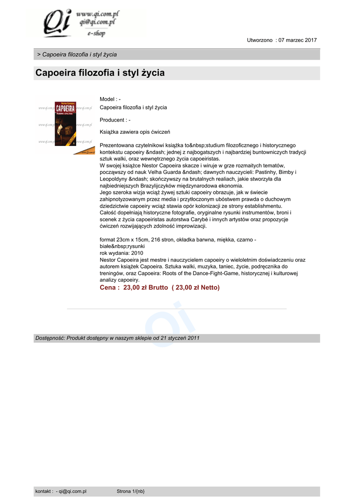 Utworzono : 07 marzec 2017 > Capoeira filozofia i styl życia Capoeira filozofia i styl życia Model : Capoeira filozofia i styl życia Producent : Książka zawiera opis ćwiczeń Prezentowana czytelnikowi książka to studium filozoficznego i historycznego kontekstu capoeiry – jednej z najbogatszych i najbardziej buntowniczych tradycji sztuk walki, oraz wewnętrznego życia capoeiristas. W swojej książce Nestor Capoeira skacze i wiruje w grze rozmaitych tematów, począwszy od nauk Velha Guarda – dawnych nauczycieli: Pastinhy, Bimby i Leopoldyny – skończywszy na brutalnych realiach, jakie stworzyła dla najbiedniejszych Brazylijczyków międzynarodowa ekonomia. Jego szeroka wizja wciąż żywej sztuki capoeiry obrazuje, jak w świecie zahipnotyzowanym przez media i przytłoczonym ubóstwem prawda o duchowym dziedzictwie capoeiry wciąż stawia opór kolonizacji ze strony establishmentu. Całość dopełniają historyczne fotografie, oryginalne rysunki instrumentów, broni i scenek z życia capoeiristas autorstwa Carybé i innych artystów oraz propozycje ćwiczeń rozwijających zdolność improwizacji. format 23cm x 15cm, 216 stron, okładka barwna, miękka, czarno białe rysunki rok wydania: 2010 Nestor Capoeira jest mestre i nauczycielem capoeiry o wieloletnim doświadczeniu oraz autorem książek Capoeira. Sztuka walki, muzyka, taniec, życie, podręcznika do treningów, oraz Capoeira: Roots of the Dance-Fight-Game, historycznej i kulturowej analizy capoeiry. Cena : 23,00 zł Brutto ( 23,00 zł Netto) i Q Dostępność: Produkt dostępny w naszym sklepie od 21 styczeń 2011 kontakt : - [email protected] Strona 1/{nb}