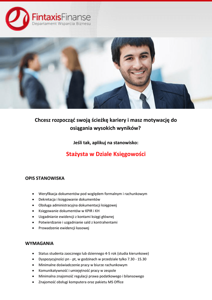 Chcesz rozpocząć swoją ścieżkę kariery i masz motywację do osiągania wysokich wyników? Jeśli tak, aplikuj na stanowisko: Stażysta w Dziale Księgowości OPIS STANOWISKA Weryfikacja dokumentów pod względem formalnym i rachunkowym Dekretacja i księgowanie dokumentów Obsługa administracyjna dokumentacji księgowej Księgowanie dokumentów w KPIR i KH Uzgadnianie ewidencji z kontami księgi głównej Potwierdzanie i uzgadnianie sald z kontrahentami Prowadzenie ewidencji kasowej WYMAGANIA Status studenta zaocznego lub dziennego 4-5 rok (studia kierunkowe) Dyspozycyjności pn - pt, w godzinach w przedziale tylko 7.30 - 15.30 Minimalne doświadczenie pracy w biurze rachunkowym Komunikatywnośd i umiejętnośd pracy w zespole Minimalna znajomośd regulacji prawa podatkowego i bilansowego Znajomośd obsługi komputera oraz pakietu MS Office Znajomośd programu księgowego, mile widziana znajomośd Optima Umiejętnośd organizacji pracy własnej i samodzielnośd w działaniu Mile widziana znajomośd języka obcego WARUNKI ZATRUDNIENIA Staż w okresie od 3 do 6 miesięcy - do ustalenia Staż w pełnym wymiarze godzin Po odbyciu stażu możliwośd kontynuacji rozwoju/pracy jako młodszy księgowy Możliwośd rozwoju w dynamicznie rozwijającej się firmie Pracę w biurze we Wrocławiu Pracę w wśród kreatywnego zespołu młodych ludzi Niezbędne narzędzia pracy Szkolenia zawodowe Osoby zainteresowane prosimy o przesłanie CV za pomocą formularza zgłoszeniowego na stronie lub bezpośrednio na adres mailowy [email protected] Prosimy o zamieszczenie: "Wyrażam zgodę na przetwarzanie moich danych osobowych zawartych w mojej ofercie pracy dla potrzeb niezbędnych do realizacji procesu rekrutacji zgodnie z ustawą z dnia 29 sierpnia 1997 r. o ochronie danych osobowych (Dz. U. z 2002 r. Nr 101, poz. 926, ze zm.)"