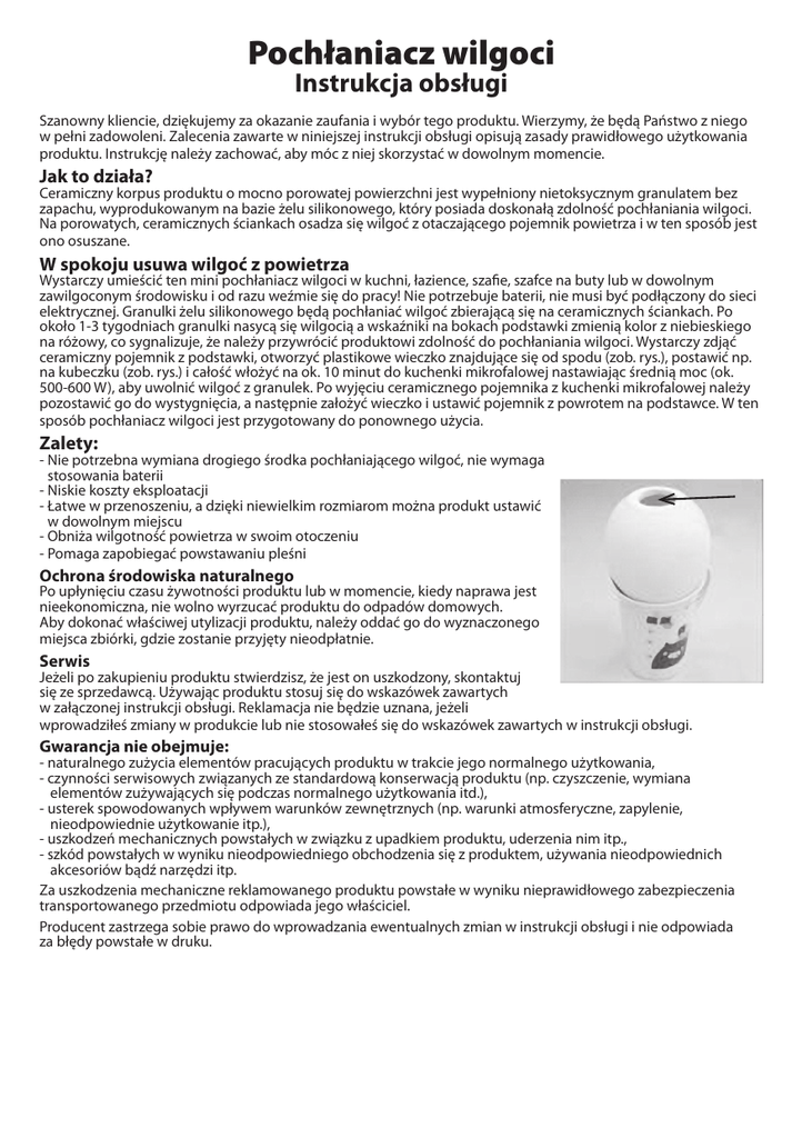 CZ Pochłaniacz wilgoci Odvlhčovač Instrukcja obsługi Návod k použití Szanowny kliencie, dziękujemy za okazanie zaufania i wybór tego produktu. Wierzymy, że będą Państwo z niego Vážený děkujeme Vám za důvěru, kterou instrukcji jste nám projevil tohoto výrobku. Věříme že s ním w pełnizákazníku, zadowoleni. Zalecenia zawarte w niniejszej obsługi nákupem opisują zasady prawidłowego użytkowania budete plně spokojen. Tentozachować, návod slouží správné používání w výrobku. Uchovejte jej pro jeho případné další produktu. Instrukcję należy abypro móc z niej skorzystać dowolnym momencie. použití. Jak to działa? Ceramiczny korpus produktu o mocno porowatej powierzchni jest wypełniony nietoksycznym granulatem bez Jak výrobek funguje? na bazie żelu silikonowego, który posiada doskonałą zdolność pochłaniania wilgoci. zapachu, wyprodukowanym Keramické, vysoce porézní tělościankach výrobku obsahuje netoxické bez zápachu na powietrza bázi silikagelu, které mají jest Na porowatych, ceramicznych osadza się wilgoć zgranule otaczającego pojemnik i w ten sposób ono osuszane. vysokou sorpční schopnost. Přes propustnou keramickou stěnu na sebe váží vzdušnou vlhkost a odvlhčují tak své okolí. W spokoju usuwa wilgoć z powietrza Wystarczy umieścić ten mini pochłaniacz wilgoci w kuchni, łazience, szafie, szafce na buty lub w dowolnym Tiše saje vlhkost ze vzduchu zawilgoconym środowisku i od razu weźmie się do pracy! Nie potrzebuje baterii, nie musi być podłączony do sieci elektrycznej. Granulki silikonowego będąv pochłaniać wilgoć zbierającą siębotníku na ceramicznych ściankach. Po Stačí umístit tento miniżelu odvlhčovač vzduchu kuchyni, koupelně, šatní skříni, nebo kdekoliv je to vlhké 1-3 tygodniach granulki nasycą się wilgocią a wskaźniki na bokach podstawki zmienią kolor z niebieskiego aokoło okamžitě se dá do práce! Žádné baterie, nebo nutnost připojení k elektrické síti. Granule silikagelu začnou přes na różowy, co sygnalizuje, że należyvlhkost przywrócić produktowi zdolność pochłaniania wilgoci. Wystarczy keramickou stěnu sát nadbytečnou ze vzduchu. Po zhruba 1-3do týdnech se granule nasytí vlhkostí azdjąć indikáceramiczny pojemnik z podstawki, otworzyć plastikowe wieczko znajdujące się od spodu (zob. rys.), postawić np. tory po stranách stojanu se změní z modré barvy na růžovou, aby bylo zřejmé, že je třeba obnovit sorpční na kubeczku (zob. rys.) i całość włożyć na ok. 10 minut do kuchenki mikrofalowej nastawiając średnią mocschop(ok. nost výrobku. Stačí pak vyjmout ze stojanu, odejmout spodní plastové víčko (viz obr.) a dát należy do 500-600 W), aby uwolnić wilgoć zkeramické granulek.tělo Po wyjęciu ceramicznego pojemnika z kuchenki mikrofalowej pozostawić trouby go do wystygnięcia, następnie wieczko ustawić z powrotem na 500-600 podstawce. W ten mikrovlnné usazené např.ado hrnečkuzałożyć (viz obr.) na cca i10 minut pojemnik při středním výkonu (cca W) aby sposób pochłaniacz wilgoci jest sorbovanou przygotowany do ponownego granule silikagelu mohli uvolnit vlhkost. Po vyjmutíużycia. z trouby, když se keramické tělo ochladí, nasaďte zpět spodní plastové víčko a vložte jej zpět do stojanu. Tím je mini-odvlhčovač znovu připraven k použití. Zalety: - Nie potrzebna wymiana drogiego środka pochłaniającego wilgoć, nie wymaga Výhody: stosowania baterii koszty eksploatacji •- Niskie Žádné drahé náhradní náplně, žádné baterie w przenoszeniu, a dzięki niewielkim rozmiarom można produkt ustawić •- Łatwe Nízkonákladové w dowolnym miejscu •- Obniża Snadno přenosnépowietrza a díky malé velikosti kamkoliv umístitelné wilgotność w swoim otoczeniu •- Pomaga Snižujezapobiegać vlhkost ve svém okolí powstawaniu pleśni • Pomáhá zabraňovat tvorbě plísní Ochrona środowiska naturalnego Po upłynięciu czasu żywotności produktu lub w momencie, kiedy naprawa jest Ochrana životního prostředí nieekonomiczna, nie wolno wyrzucać produktu do odpadów domowych. Po doby životnosti produktu nebo vnależy okamžiku, byla Abyuplynutí dokonać właściwej utylizacji produktu, oddaćkdy goby dooprava wyznaczonego neekonomická, nevhazujte do domovního odpadu. Za účelem správné miejsca zbiórki, produkt gdzie zostanie przyjęty nieodpłatnie. likvidace Serwis výrobku jej odevzdejte na určených sběrných místech, kde budou přijata zdarma. Jeżeli po zakupieniu produktu stwierdzisz, że jest on uszkodzony, skontaktuj się ze sprzedawcą. Używając produktu stosuj się do wskazówek zawartych Servis w załączonej instrukcji obsługi. Reklamacja nie będzie uznana, jeżeli zmiany w produkcie nie stosowałeś się do wskazówek w instrukcji obsługi. Vwprowadziłeś případě, že po zakoupení výrobkulub zjistíte jakoukoli závadu, kontaktujtezawartych servisní oddělení. Při použití výrobku se řiďte pokyny uvedenými v přiloženém návodu k použití. Na reklamaci nebude brán zřetel, pokud jste výrobek Gwarancja nie obejmuje: pozměnili či jste se neřídili pokynypracujących uvedenými vproduktu návodu kwpoužití. - naturalnego zużycia elementów trakcie jego normalnego użytkowania, - czynności serwisowych związanych ze standardową konserwacją produktu (np. czyszczenie, wymiana elementów zużywających się podczas normalnego użytkowania itd.), Záruka se nevztahuje usterek spowodowanych wpływemčástí warunków zewnętrznych (np.používání warunki atmosferyczne, zapylenie, -- na přirozené opotřebení funkčních výrobku v důsledku jeho nieodpowiednie użytkowanie itp.), -- na servisní zásahy související se standardní údržbou výrobku (např. čištění,uderzenia výměna dílů běžnému uszkodzeń mechanicznych powstałych w związku z upadkiem produktu, nimpodléhajících itp., … ) 