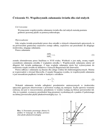 Ćwiczenie 51. Współczynnik załamania światła dla ciał stałych Cel ćwiczenia Wyznaczenie współczynnika załamania światła dla ciał stałych metodą pomiaru grubości pozornej płytki za pomocą mikroskopu. Wprowadzenie Gdy wiązka światła przechodzi przez dwa ośrodki o róŜnych własnościach optycznych, to na powierzchni granicznej częściowo zostaje odbita, częściowo zaś przechodzi do drugiego środowiska, ulegając załamaniu. Prawo załamania sin θ1 = n. sin θ 2 (1) zostało sformułowane przez Snelliusa w XVII wieku. Wielkość n jest stałą, zwaną współczynnikiem załamania ośrodka 2 względem ośrodka 1. Współczynnik załamania zaleŜy od długości fali światła padającego. Z tego względu załamanie moŜe być wykorzystane do rozłoŜenia wiązki światła na składowe o róŜnych długościach fali (barwach). Prawa odbicia i załamania są słuszne dla całego widma fal elektromagnetycznych. MoŜna je wyprowadzić z równań Maxwella. Z zasady Huygensa wynika, Ŝe współczynnik załamania n jest stosunkiem prędkości światła w kaŜdym z ośrodków n= v2 . v1 (2) Wskutek załamania światła odległości przedmiotów umieszczonych w środowisku optycznie gęstszym obserwowane z powietrza wydają się mniejsze. Szyba sprawia wraŜenie cieńszej, niŜ jest w rzeczywistości, przedmioty w wodzie wydają się bliŜsze powierzchni itd. Aby to wyjaśnić, wystarczy prześledzić bieg promieni wychodzących z punktu O połoŜonego na dolnej powierzchni płytki płaskorównoległej (rys. 1). Rys. 1. Powstanie pozornego obrazu O1 punktu O leŜącego na dolnej powierzchni płytki płaskorównoległej Promień OA prostopadły do powierzchni granicznej wychodzi bez załamania, natomiast OB tworzy z prostopadłą wewnątrz szkła kąt β, a w powietrzu kąt α, większy od β wskutek załamania. Obserwowane promienie wychodzące z płytki są rozbieŜne, ich przedłuŜenia przecinają się w punkcie O1 tworząc obraz pozorny. Odległość O1A równa h stanowi pozorną grubość płytki, podczas gdy AO = d jest grubością rzeczywistą. W naszym eksperymencie patrzymy na płytkę przez mikroskop prawie prostopadle do powierzchni płytki. Obydwa kąty α i β są w rzeczywistości małe. Dla małych kątów zachodzi sin α sin β ≈ α β ≈ tg α . tg β (3) Z zaleŜności trygonometrycznych dla trójkątów ABO oraz ABO’ otrzymujemy AB tg α d = h = = n. tg β AB h d (4) Stąd wynika sposób eksperymentalnego wyznaczenia n. Pozorną grubość płytki h wyznaczamy mierząc przesunięcie tubusa mikroskopu między połoŜeniami ostrego widzenia kresek umieszczonych na obu powierzchniach płytki. Współczynnik załamania jest stosunkiem rzeczywistej i pozornej grubości płytki. W obranej metodzie wyznaczania współczynnika załamania światła jest wykorzystywana właściwość mikroskopu, polegająca na tym, Ŝe posiada on wąski przedział głębi ostrości i znaczne powiększenie. Przesunięcie związane z nastawieniem ostrości na górną i dolną powierzchnię płytki mierzy czujnik zegarowy sprzęŜony z mechanizmem przesuwu tubusa mikroskopu. Dzięki temu moŜna łatwo i dokładnie zmierzyć grubość pozorną h. Schemat budowy mikroskopu i zasadę powstawania obrazu przedstawiono na rysunku 2. Elementami, dla których mierzymy n, są płytki płaskorównoległe ze szkła, pleksiglasu etc. Rys. 2. Schemat mikroskopu: Ob – obiektyw, Ok – okular.