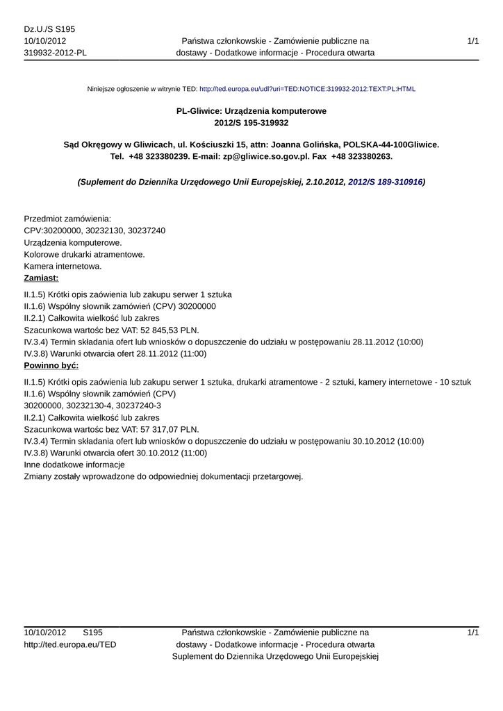 Dz.U./S S195 10/10/2012 319932-2012-PL Państwa członkowskie - Zamówienie publiczne na dostawy - Dodatkowe informacje - Procedura otwarta 1/1 Niniejsze ogłoszenie w witrynie TED: http://ted.europa.eu/udl?uri=TED:NOTICE:319932-2012:TEXT:PL:HTML PL-Gliwice: Urządzenia komputerowe 2012/S 195-319932 Sąd Okręgowy w Gliwicach, ul. Kościuszki 15, attn: Joanna Golińska, POLSKA-44-100Gliwice. Tel. +48 323380239. E-mail: [email protected]. Fax +48 323380263. (Suplement do Dziennika Urzędowego Unii Europejskiej, 2.10.2012, 2012/S 189-310916) Przedmiot zamówienia: CPV:30200000, 30232130, 30237240 Urządzenia komputerowe. Kolorowe drukarki atramentowe. Kamera internetowa. Zamiast: II.1.5) Krótki opis zaówienia lub zakupu serwer 1 sztuka II.1.6) Wspólny słownik zamówień (CPV) 30200000 II.2.1) Całkowita wielkość lub zakres Szacunkowa wartośc bez VAT: 52 845,53 PLN. IV.3.4) Termin składania ofert lub wniosków o dopuszczenie do udziału w postępowaniu 28.11.2012 (10:00) IV.3.8) Warunki otwarcia ofert 28.11.2012 (11:00) Powinno być: II.1.5) Krótki opis zaówienia lub zakupu serwer 1 sztuka, drukarki atramentowe - 2 sztuki, kamery internetowe - 10 sztuk II.1.6) Wspólny słownik zamówień (CPV) 30200000, 30232130-4, 30237240-3 II.2.1) Całkowita wielkość lub zakres Szacunkowa wartośc bez VAT: 57 317,07 PLN. IV.3.4) Termin składania ofert lub wniosków o dopuszczenie do udziału w postępowaniu 30.10.2012 (10:00) IV.3.8) Warunki otwarcia ofert 30.10.2012 (11:00) Inne dodatkowe informacje Zmiany zostały wprowadzone do odpowiedniej dokumentacji przetargowej. 10/10/2012 S195 http://ted.europa.eu/TED Państwa członkowskie - Zamówienie publiczne na dostawy - Dodatkowe informacje - Procedura otwarta Suplement do Dziennika Urzędowego Unii Europejskiej 1/1
