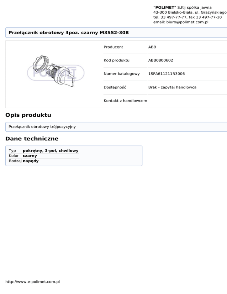 "POLIMET" S.Kij spółka jawna 43-300 Bielsko-Biała, ul. Grażyńskiego tel. 33 497-77-77, fax 33 497-77-10 email: [email protected] Przełącznik obrotowy 3poz. czarny M3SS2-30B Producent ABB Kod produktu ABB0800602 Numer katalogowy 1SFA611211R3006 Dostępność Brak - zapytaj handlowca Kontakt z handlowcem Opis produktu Przełącznik obrotowy trójpozycyjny Dane techniczne Typ pokrętny, 3-poł, chwilowy Kolor czarny Rodzaj napędy http://www.e-polimet.com.pl