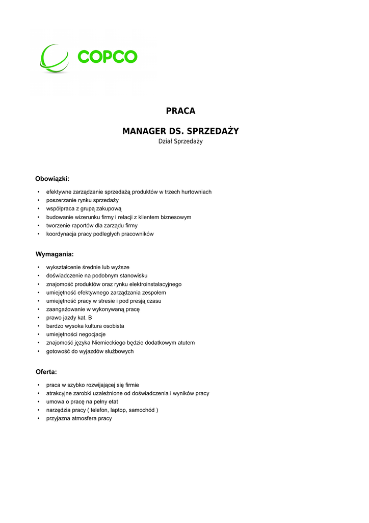 PRACA MANAGER DS. SPRZEDAŻY Dział Sprzedaży Obowiązki: • • efektywne zarządzanie sprzedażą produktów w trzech hurtowniach poszerzanie rynku sprzedaży • • • • współpraca z grupą zakupową budowanie wizerunku firmy i relacji z klientem biznesowym tworzenie raportów dla zarządu firmy koordynacja pracy podległych pracowników Wymagania: • • • • • • • • • • • wykształcenie średnie lub wyższe doświadczenie na podobnym stanowisku znajomość produktów oraz rynku elektroinstalacyjnego umiejętność efektywnego zarządzania zespołem umiejętność pracy w stresie i pod presją czasu zaangażowanie w wykonywaną pracę prawo jazdy kat. B bardzo wysoka kultura osobista umiejętności negocjacje znajomość języka Niemieckiego będzie dodatkowym atutem gotowość do wyjazdów służbowych Oferta: • • • • • praca w szybko rozwijającej się firmie atrakcyjne zarobki uzależnione od doświadczenia i wyników pracy umowa o pracę na pełny etat narzędzia pracy ( telefon, laptop, samochód ) przyjazna atmosfera pracy