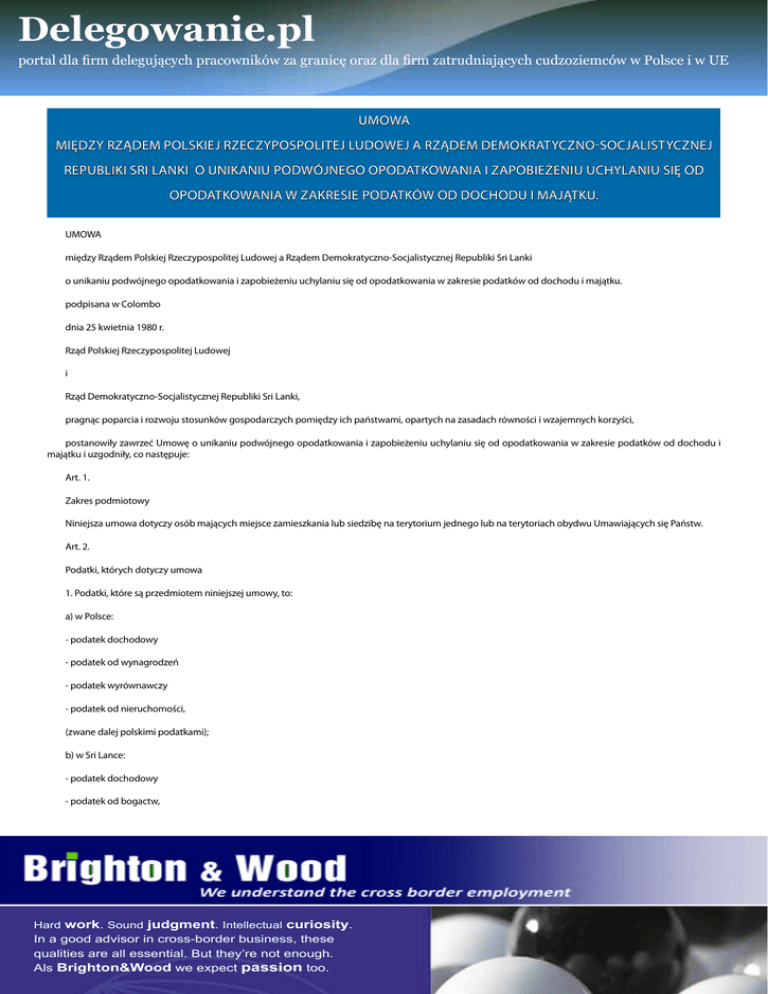 Delegowanie.pl portal dla firm delegujących pracowników za granicę oraz dla firm zatrudniających cudzoziemców w Polsce i w UE UMOWA między Rządem Polskiej Rzeczypospolitej Ludowej a Rządem Demokratyczno-Socjalistycznej Republiki Sri Lanki o unikaniu podwójnego opodatkowania i zapobieżeniu uchylaniu się od opodatkowania w zakresie podatków od dochodu i majątku. UMOWA między Rządem Polskiej Rzeczypospolitej Ludowej a Rządem Demokratyczno-Socjalistycznej Republiki Sri Lanki o unikaniu podwójnego opodatkowania i zapobieżeniu uchylaniu się od opodatkowania w zakresie podatków od dochodu i majątku. podpisana w Colombo dnia 25 kwietnia 1980 r. Rząd Polskiej Rzeczypospolitej Ludowej i Rząd Demokratyczno-Socjalistycznej Republiki Sri Lanki, pragnąc poparcia i rozwoju stosunków gospodarczych pomiędzy ich państwami, opartych na zasadach równości i wzajemnych korzyści, postanowiły zawrzeć Umowę o unikaniu podwójnego opodatkowania i zapobieżeniu uchylaniu się od opodatkowania w zakresie podatków od dochodu i majątku i uzgodniły, co następuje: Art. 1. Zakres podmiotowy Niniejsza umowa dotyczy osób mających miejsce zamieszkania lub siedzibę na terytorium jednego lub na terytoriach obydwu Umawiających się Państw. Art. 2. Podatki, których dotyczy umowa 1. Podatki, które są przedmiotem niniejszej umowy, to: a) w Polsce: - podatek dochodowy - podatek od wynagrodzeń - podatek wyrównawczy - podatek od nieruchomości, (zwane dalej polskimi podatkami); b) w Sri Lance: - podatek dochodowy - podatek od bogactw, Hard work. Sound judgment. Intellectual curiosity. In a good advisor in cross-border business, these qualities are all essential. But they’re not enough. Als Brighton&Wood we expect passion too. Delegowanie.pl portal dla firm delegujących pracowników za granicę oraz dla firm zatrudniających cudzoziemców w Polsce i w UE (zwane dalej podatkami w Sri Lance). 2. Niniejsza umowa będzie także stosowana do każdych innych podatków o rzeczywiście podobnym charakterze, ustanowionych w Polsce lub Sri Lance po dacie podpisania niniejszej umowy. Art. 3. Ogólne definicje 1. W rozumieniu niniejszej umowy, jeżeli z jej treści nie wynika inaczej: a) określenie „Polska” oznacza Polską Rzeczpospolitą Ludową, a określenie „Sri Lanka” oznacza Demokratyczno-Socjalistyczną Republikę Sri Lanki, b) określenia „Umawiające się Państwo” i „drugie Umawiające się Państwo” oznaczają Polskę i Sri Lankę, w zależności od kontekstu, c) określenia „osoba mająca miejsce zamieszkania lub siedzibę w Umawiającym się Państwie” i „osoba mająca miejsce zamieszkania lub siedzibę w drugim Umawiającym się Państwie” oznaczają osobę mającą miejsce zamieszkania lub siedzibę w Polsce albo osobę mającą miejsce zamieszkania lub siedzibę w Sri Lance w zależności od kontekstu, d) określenie „podatek” oznacza polski podatek lub podatek Sri Lanki, w zależności od kontekstu, e) określenie „osoba” oznacza osobę fizyczną, spółkę i jakiekolwiek stowarzyszenie osób, f) określenie „spółka” oznacza stowarzyszenie i jednostkę organizacyjną, która jest traktowana jako stowarzyszenie dla celów podatkowych, g) określenia „polskie przedsiębiorstwo” i „przedsiębiorstwo Sri Lanki” oznaczają odpowiednio przemysłowe lub handlowe przedsiębiorstwo prowadzone przez osobę mającą miejsce zamieszkania lub siedzibę w Polsce i przedsiębiorstwo przemysłowe lub handlowe prowadzone przez osobę mającą miejsce zamieszkania lub siedzibę w Sri Lance, a określenia „przedsiębiorstwo Umawiającego się Państwa” i „przedsiębiorstwo drugiego Umawiającego się Państwa” oznaczają polskie przedsiębiorstwo lub przedsiębiorstwo Sri Lanki, w zależności od kontekstu, h) określenie „zyski przemysłowe lub handlowe” oznaczają zyski z działalności rolnej, rybołówstwa, górniczej, bankowej, ubezpieczeniowej, również w zakresie ubezpieczenia na życie bądź realizowania działalności inwestycyjnej, a także zyski z tytułu opłat za wynajem lub z tytułu należności licencyjnych w odniesieniu do filmów fabularnych, ale z wyłączeniem dochodu w postaci dywidend, odsetek, opłat za wynajem, należności licencyjnych (innych niż opłaty za wynajem lub należności licencyjne w odniesieniu do filmów fabularnych), wynagrodzeń kierownictwa lub wynagrodzeń za pracę, i) określenie „właściwe władze” oznacza w przypadku Polski Ministra Finansów Polskiej Rzeczypospolitej Ludowej lub jego upoważnionego przedstawiciela, a w przypadku Sri Lanki - Generalnego Komisarza Dochodów Państwa. 2. Przy stosowaniu postanowień niniejszej umowy w Umawiającym się Państwie każde określenie nie zdefiniowane w inny sposób w niniejszej umowie będzie miało, jeżeli z kontekstu nie wynika inaczej, znaczenie, jakie ono posiada zgodnie z prawem tego Umawiającego się Państwa w odniesieniu do podatków, które są przedmiotem niniejszej umowy. Art. 4. Miejsce zamieszkania dla celów podatkowych 1. W rozumieniu niniejszej umowy określenia „osoba mająca miejsce zamieszkania lub siedzibę w Polsce” i „osoba mająca miejsce zamieszkania lub siedzibę w Sri Lance” oznaczają odpowiednio każdą osobę, która ma miejsce zamieszkania lub siedzibę w Polsce dla polskich celów podatkowych i nie posiada miejsca zamieszkania lub siedziby w Sri Lance dla celów podatkowych w Sri Lance, oraz każdą osobę, która ma miejsce zamieszkania lub siedzibę w Sri Lance dla celów podatkowych w Sri Lance i nie posiada miejsca zamieszkania lub siedziby w Polsce dla polskich celów podatkowych. Uważać się będzie, że spółka posiada siedzibę w Polsce, jeśli ma zarząd lub dyrekcję w Polsce i nie jest zarządzana ani kontrolowana w Sri Lance oraz nie podlega prawom Sri Lanki. Uważać się będzie, że spółka posiada siedzibę w Sri Lance, jeżeli podlega prawom Sri Lanki bądź jej działalność je