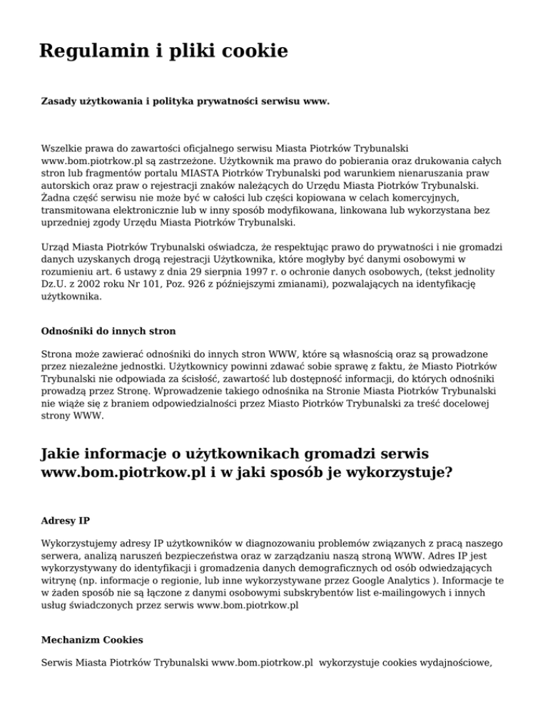 Regulamin i pliki cookie Zasady użytkowania i polityka prywatności serwisu www. Wszelkie prawa do zawartości oficjalnego serwisu Miasta Piotrków Trybunalski www.bom.piotrkow.pl są zastrzeżone. Użytkownik ma prawo do pobierania oraz drukowania całych stron lub fragmentów portalu MIASTA Piotrków Trybunalski pod warunkiem nienaruszania praw autorskich oraz praw o rejestracji znaków należących do Urzędu Miasta Piotrków Trybunalski. Żadna część serwisu nie może być w całości lub części kopiowana w celach komercyjnych, transmitowana elektronicznie lub w inny sposób modyfikowana, linkowana lub wykorzystana bez uprzedniej zgody Urzędu Miasta Piotrków Trybunalski. Urząd Miasta Piotrków Trybunalski oświadcza, że respektując prawo do prywatności i nie gromadzi danych uzyskanych drogą rejestracji Użytkownika, które mogłyby być danymi osobowymi w rozumieniu art. 6 ustawy z dnia 29 sierpnia 1997 r. o ochronie danych osobowych, (tekst jednolity Dz.U. z 2002 roku Nr 101, Poz. 926 z późniejszymi zmianami), pozwalających na identyfikację użytkownika. Odnośniki do innych stron Strona może zawierać odnośniki do innych stron WWW, które są własnością oraz są prowadzone przez niezależne jednostki. Użytkownicy powinni zdawać sobie sprawę z faktu, że Miasto Piotrków Trybunalski nie odpowiada za ścisłość, zawartość lub dostępność informacji, do których odnośniki prowadzą przez Stronę. Wprowadzenie takiego odnośnika na Stronie Miasta Piotrków Trybunalski nie wiąże się z braniem odpowiedzialności przez Miasto Piotrków Trybunalski za treść docelowej strony WWW. Jakie informacje o użytkownikach gromadzi serwis www.bom.piotrkow.pl i w jaki sposób je wykorzystuje? Adresy IP Wykorzystujemy adresy IP użytkowników w diagnozowaniu problemów związanych z pracą naszego serwera, analizą naruszeń bezpieczeństwa oraz w zarządzaniu naszą stroną WWW. Adres IP jest wykorzystywany do identyfikacji i gromadzenia danych demograficznych od osób odwiedzających witrynę (np. informacje o regionie, lub inne wykorzystywane przez Google Analytics ). Informacje te w żaden sposób nie są łączone z danymi osobowymi subskrybentów list e-mailingowych i innych usług świadczonych przez serwis www.bom.piotrkow.pl Mechanizm Cookies Serwis Miasta Piotrków Trybunalski www.bom.piotrkow.pl wykorzystuje cookies wydajnościowe, aby dostarczać zawartość najbardziej odpowiadającą zainteresowaniom użytkowników oraz w celach statystycznych: cookies google-analytics.com – statystyki dla witryny piotrkow.pl i bom.piotrkow.pl. Cokies sesyjne: phpsessid , phpcsls i ui-tabs-1 (wygasają po zakończeniu sesji). Informacje zbierane w czasie badania nie są ujawniane jakimkolwiek podmiotom trzecim ani w formie przetworzonej, ani w postaci danych źródłowych. W przeglądarce internetowej można zmienić ustawienia dotyczące cookies. Brak zmiany tych ustawień oznacza akceptację dla stosowanych tu cookies. Jak wyłączyć pliki cookie? Instrukcja w pliku do pobrania poniżej lub TUTAJ. Flash cookies - serwis WWW firmy Adobe zawiera informacje o sposobie usuwania i wyłączania plików cookie odtwarzacza Flash w konkretnych domenach: www.adobe.com/products/flashplayer/security. Należy pamiętać, że ograniczenie korzystania z plików cookie odtwarzacza Flash prawdopodobnie wpłynie na działanie aplikacji opartych na technologii Flash, zaś wyłączenie plików cookie odtwarzacza Flash na stronach www Urzędu Miasta Piotrkowa Trybunalskiego uniemożliwi odtwarzanie większości treści. Na podstawie uzyskanych informacji w szczególnych przypadkach sporządzane są zbiorcze, ogólne zestawienia statystyczne i nie są ujawniane osobom trzecim. Obejmują one zwykle informacje o oglądalności serwisu. Zestawienia te nie zawierają jednak żadnych danych pozwalających na identyfikację pojedynczych użytkowników serwisu Miasta Piotrków Trybunalski, Pasaż K. Rudowskiego 10 (zgodnie z art. 173 ust. 1 ustawy z dnia 16 lipca 2004 r. Prawo telekomunikacyjne (Dz. U. z 2004 r. Nr 171, poz. 1800). Kontakt Użytkownicy, którzy mają jakieś pytania dotyczące niniejszej deklaracji ochrony prywatności, praktyk stosowanych na tej stronie, czy też sposobów utrzymywania z nią kontaktów, proszone są o wysłanie uwag pod adres: [email protected] . Korzystając w jakikolwiek sposób z serwisów internetowych Urzędu Miasta Piotrków Trybunalski akceptujecie Państwo zasady zawarte w polityce prywatności portalu www.bom.piotrkow.pl i www.piotrkow.pl .