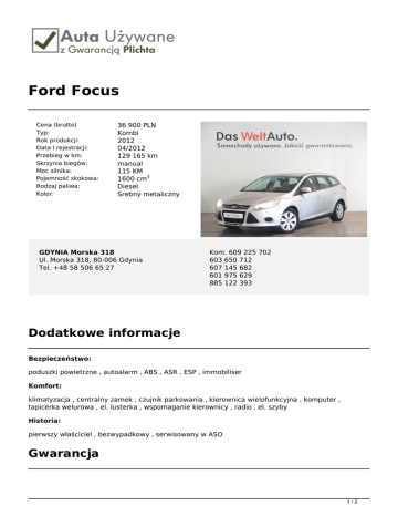 Ford Focus Cena (brutto) Typ: Rok produkcji: Data I rejestracji: Przebieg w km: Skrzynia biegów: Moc silnika: Pojemność skokowa: Rodzaj paliwa: Kolor: 36 900 PLN Kombi 2012 04/2012 129 165 km manual 115 KM 1600 cm3 Diesel Srebny metaliczny GDYNIA Morska 318 Ul. Morska 318, 80-006 Gdynia Tel. +48 58 506 65 27 Kom. 609 225 702 603 650 712 607 145 682 601 975 629 885 122 393 Dodatkowe informacje Bezpieczeństwo: poduszki powietrzne , autoalarm , ABS , ASR , ESP , immobiliser Komfort: klimatyzacja , centralny zamek , czujnik parkowania , kierownica wielofunkcyjna , komputer , tapicerka welurowa , el. lusterka , wspomaganie kierownicy , radio , el. szyby Historia: pierwszy właściciel , bezwypadkowy , serwisowany w ASO Gwarancja 1/2 Szanowni Państwo, Pragniemy Państwa poinformować, iż firma Plichta – Autoryzowany Dealer Škoda Auto prowadzi skup oraz sprzedaż samochodów używanych wszystkich marek, oferując także samochody używane z gwarancją objęte programem „Auta używane z Gwarancją Plichta”. W ramach programu „Auta Używane z Gwarancją Plichta ” każdy Klient otrzymuje atrakcyjny pakiet zniżek pozwalający zoptymalizować koszty eksploatacji samochodu: -50% na serwis klimatyzacji -50% na ustawienie zbieżności -50% na kosmetykę auta -50% na ścieżkę diagnostyczną -25% na wymiany oleju -25% na zakup opon + 5zł na sezon za hotelowanie opon -15% na części i akcesoria Oferujemy również kompleksową obsługę w zakresie finansowania i ubezpieczenia: - kredyty już od 4,99% - leasingi i kredyty bez zaświadczeń - uproszczone procedury – decyzja już od 30 min. - atrakcyjne pakiety AC/OC/NW/ASS wiodących firm ubezpieczeniowych Możliwość pozostawienia dotychczas użytkowanego auta w rozliczeniu – BEZPŁATNA WYCENA!!! Zapraszamy wszystkich Klientów na jazdę próbną wybranym autem. Numer oferty: E244 Informacja nie stanowi oferty w rozumieniu art. 66 KC. Podane dane mają charakter wyłącznie informacyjny. 2/2 Powered by TCPDF (www.tcpdf.org)