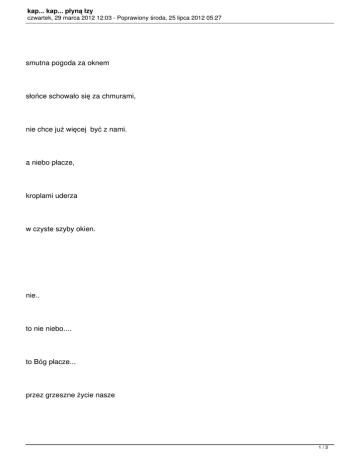 kap... kap... płyną łzy czwartek, 29 marca 2012 12:03 - Poprawiony środa, 25 lipca 2012 05:27 smutna pogoda za oknem słońce schowało się za chmurami, nie chce już więcej być z nami. a niebo płacze, kroplami uderza w czyste szyby okien. nie.. to nie niebo.... to Bóg płacze... przez grzeszne życie nasze 1/3 kap... kap... płyną łzy czwartek, 29 marca 2012 12:03 - Poprawiony środa, 25 lipca 2012 05:27 drzewa w smutku głowy chylą, przed Bogiem chylą... W taką pogodę smutną duszę moją sprawy z przeszłości niepokoją... bardzo niepokoją... a łzy... a łzy kap... kap...kap... 2/3 kap... kap... płyną łzy czwartek, 29 marca 2012 12:03 - Poprawiony środa, 25 lipca 2012 05:27 strumieniem płyną... - Viagra forum which is best generic Cut viagra tablet Brand levitra price Cialis use by women Generic cialis buy hong kong Viagra cialis wholesale Propecia muscle building Cheapest propecia prescription Buying viagra pharmacy Buy kamagra delhi Can you get viagra online Cheap kamagra generic viagra uk 3/3
