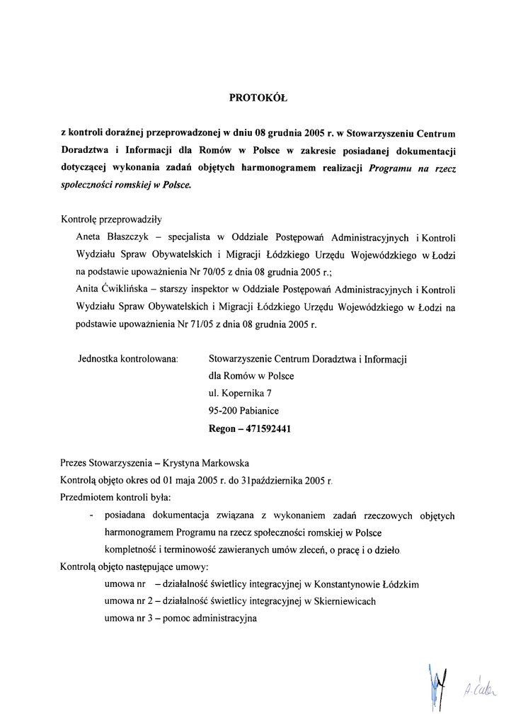 Kontrol,\. obj~to okres od 01 maja 2005 r. do 31 paidziemika
