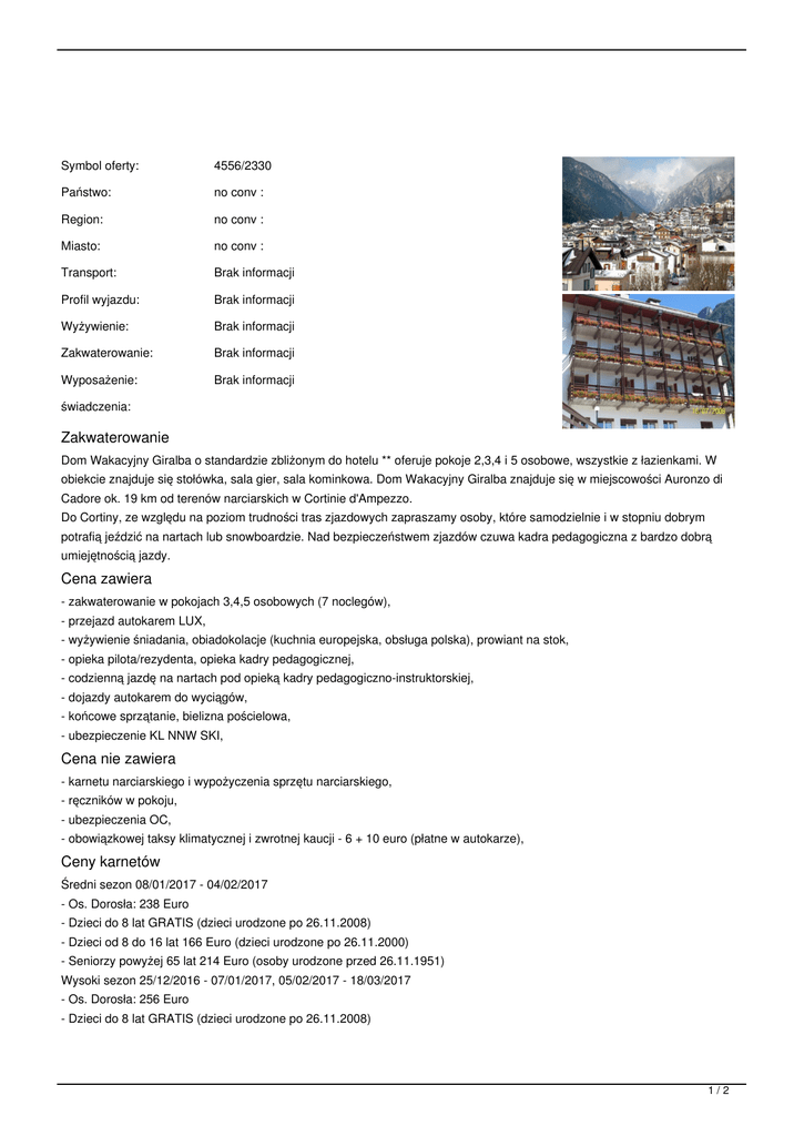 Symbol oferty: 4556/2330 Państwo: no conv : Region: no conv : Miasto: no conv : Transport: Brak informacji Profil wyjazdu: Brak informacji Wyżywienie: Brak informacji Zakwaterowanie: Brak informacji Wyposażenie: Brak informacji świadczenia: Zakwaterowanie Dom Wakacyjny Giralba o standardzie zbliżonym do hotelu ** oferuje pokoje 2,3,4 i 5 osobowe, wszystkie z łazienkami. W obiekcie znajduje się stołówka, sala gier, sala kominkowa. Dom Wakacyjny Giralba znajduje się w miejscowości Auronzo di Cadore ok. 19 km od terenów narciarskich w Cortinie d'Ampezzo. Do Cortiny, ze względu na poziom trudności tras zjazdowych zapraszamy osoby, które samodzielnie i w stopniu dobrym potrafią jeździć na nartach lub snowboardzie. Nad bezpieczeństwem zjazdów czuwa kadra pedagogiczna z bardzo dobrą umiejętnością jazdy. Cena zawiera - zakwaterowanie w pokojach 3,4,5 osobowych (7 noclegów), - przejazd autokarem LUX, - wyżywienie śniadania, obiadokolacje (kuchnia europejska, obsługa polska), prowiant na stok, - opieka pilota/rezydenta, opieka kadry pedagogicznej, - codzienną jazdę na nartach pod opieką kadry pedagogiczno-instruktorskiej, - dojazdy autokarem do wyciągów, - końcowe sprzątanie, bielizna pościelowa, - ubezpieczenie KL NNW SKI, Cena nie zawiera - karnetu narciarskiego i wypożyczenia sprzętu narciarskiego, - ręczników w pokoju, - ubezpieczenia OC, - obowiązkowej taksy klimatycznej i zwrotnej kaucji - 6 + 10 euro (płatne w autokarze), Ceny karnetów Średni sezon 08/01/2017 - 04/02/2017 - Os. Dorosła: 238 Euro - Dzieci do 8 lat GRATIS (dzieci urodzone po 26.11.2008) - Dzieci od 8 do 16 lat 166 Euro (dzieci urodzone po 26.11.2000) - Seniorzy powyżej 65 lat 214 Euro (osoby urodzone przed 26.11.1951) Wysoki sezon 25/12/2016 - 07/01/2017, 05/02/2017 - 18/03/2017 - Os. Dorosła: 256 Euro - Dzieci do 8 lat GRATIS (dzieci urodzone po 26.11.2008) 1/2 - Dzieci od 8 do 16 lat 180 Euro (dzieci urodzone po 26.11.2000) - Seniorzy powyżej 65 lat 231 Euro (osoby urodzone przed 26.) Uwagi - trzeba zabrać ze sobą, ręczniki, termos oraz KASK!!! Uczestnicy obozu muszą posiadać przynajmniej podstawowe umiejętności jazdy na nartach lub snowboardzie!! - Do autokaru można zabrać 1 duży bagaż (do 20kg), 1 podręczny (do 5kg), 1 parę nart lub 1deskę snowboardową. Nie zabieramy zgrzewek z napojami, - Karnety można wykupić na miejscu: indywidualnie w kasach wyciągów lub za pośrednictwem biura na warunkach przedstawionych przez pilota/rezydenta, - Dojazdy autokarem na stoki narciarskie organizowane są tak aby maksymalnie wykorzystać czas pracy wyciągów (wyjazd ok. 8.30, powrót ok. 17.00), - Ubezpieczenie nie obejmuje zachorowań wynikłych z chorób przewlekłych oraz wypadków narciarskich pod wpływem alkoholu i poza trasami narciarskimi, - Internet w miejscach zakwaterowania nie jest przeznaczony do działalności komercyjnej i zawodowej, - Każdy uczestnik musi dostarczyć na zbiórkę wypełnioną kartę kwalifikacyjną. Kopię karty prosimy dostarczyć do biura do 3 tyg. przed wyjazdem. Bez karty dziecko nie może pojechać na obóz (dlatego prosimy o dostarczenie nam kopii, aby dziecko mogło jechać nawet jeśli rodzice zapomną karty), - Każde dziecko które wyjeżdża na kolonię lub obóz za granicą musi posiadać ważny DOWÓD OSOBISTY LUB PASZPORT!!! Zalecamy również posiadanie karty EKUZ (Karta Europejskiego Ubezpieczenia Zdrowotnego wydawanej w oddziałach wojewódzkich NFZ), - Istnieje możliwość wykupienia dodatkowego ubezpieczenia Kosztów Imprezy Turystycznej pokrywającego koszty rezygnacji z wyjazdu w przypadku wystąpienia sytuacji losowych (np. choroby dziecka). Ubezpieczenie to można wykupić nie później niż 5 dni po dokonaniu rezerwacji. W celu uzyskania dodatkowych informacji prosimy o kontakt z biurem, - Połączenia antenowe z innych miejscowości odbywają się przy min. 8 osobach. Potwierdzenie połączeń antenowych odbywa się na 7 dni przed datą rozpoczęcia imprezy. Na trasach dojazdowych w Polsce połączenia mogą być realizowane mikrobusami lub transportem publicznym pod opieką osoby dorosłej i po wcześniejszej rezerwacji miejsc przez Organizatora imprezy. TERMINY: CENNIK: Długość pobytu: dni Grupa cenowa: Waluta: PLN Aktualne ceny z systemu S.A.R.T. (-) - cena usługi, podatku kalkulowana przy osobie lub gratis (*) - kwota wliczona w cenę standardową 2/2