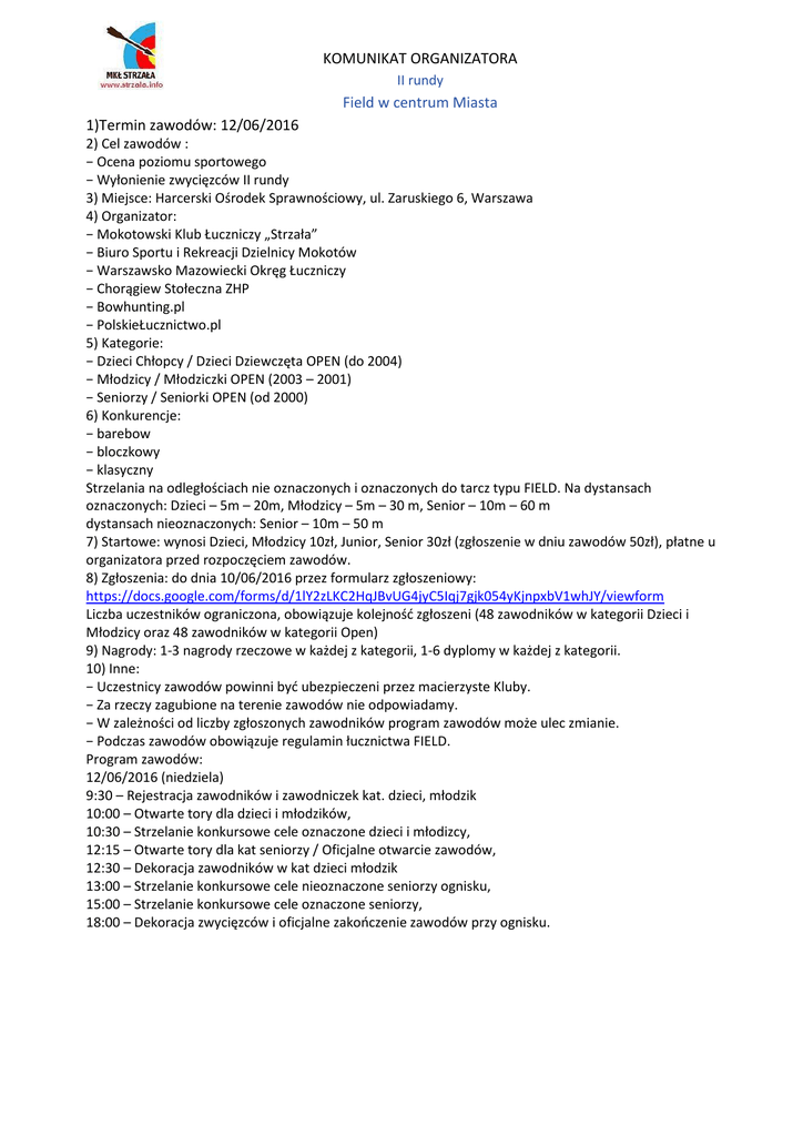 KOMUNIKAT ORGANIZATORA II rundy Field w centrum Miasta 1)Termin zawodów: 12/06/2016 2) Cel zawodów : − Ocena poziomu sportowego − Wyłonienie zwycięzców II rundy 3) Miejsce: Harcerski Ośrodek Sprawnościowy, ul. Zaruskiego 6, Warszawa 4) Organizator: − Mokotowski Klub Łuczniczy „Strzała” − Biuro Sportu i Rekreacji Dzielnicy Mokotów − Warszawsko Mazowiecki Okręg Łuczniczy − Chorągiew Stołeczna ZHP − Bowhunting.pl − PolskieŁucznictwo.pl 5) Kategorie: − Dzieci Chłopcy / Dzieci Dziewczęta OPEN (do 2004) − Młodzicy / Młodziczki OPEN (2003 – 2001) − Seniorzy / Seniorki OPEN (od 2000) 6) Konkurencje: − barebow − bloczkowy − klasyczny Strzelania na odległościach nie oznaczonych i oznaczonych do tarcz typu FIELD. Na dystansach oznaczonych: Dzieci – 5m – 20m, Młodzicy – 5m – 30 m, Senior – 10m – 60 m dystansach nieoznaczonych: Senior – 10m – 50 m 7) Startowe: wynosi Dzieci, Młodzicy 10zł, Junior, Senior 30zł (zgłoszenie w dniu zawodów 50zł), płatne u organizatora przed rozpoczęciem zawodów. 8) Zgłoszenia: do dnia 10/06/2016 przez formularz zgłoszeniowy: https://docs.google.com/forms/d/1lY2zLKC2HqJBvUG4jyC5Iqj7gjk054yKjnpxbV1whJY/viewform Liczba uczestników ograniczona, obowiązuje kolejność zgłoszeni (48 zawodników w kategorii Dzieci i Młodzicy oraz 48 zawodników w kategorii Open) 9) Nagrody: 1-3 nagrody rzeczowe w każdej z kategorii, 1-6 dyplomy w każdej z kategorii. 10) Inne: − Uczestnicy zawodów powinni być ubezpieczeni przez macierzyste Kluby. − Za rzeczy zagubione na terenie zawodów nie odpowiadamy. − W zależności od liczby zgłoszonych zawodników program zawodów może ulec zmianie. − Podczas zawodów obowiązuje regulamin łucznictwa FIELD. Program zawodów: 12/06/2016 (niedziela) 9:30 – Rejestracja zawodników i zawodniczek kat. dzieci, młodzik 10:00 – Otwarte tory dla dzieci i młodzików, 10:30 – Strzelanie konkursowe cele oznaczone dzieci i młodizcy, 12:15 – Otwarte tory dla kat seniorzy / Oficjalne otwarcie zawodów, 12:30 – Dekoracja zawodników w kat dzieci młodzik 13:00 – Strzelanie konkursowe cele nieoznaczone seniorzy ognisku, 15:00 – Strzelanie konkursowe cele oznaczone seniorzy, 18:00 – Dekoracja zwycięzców i oficjalne zakończenie zawodów przy ognisku.