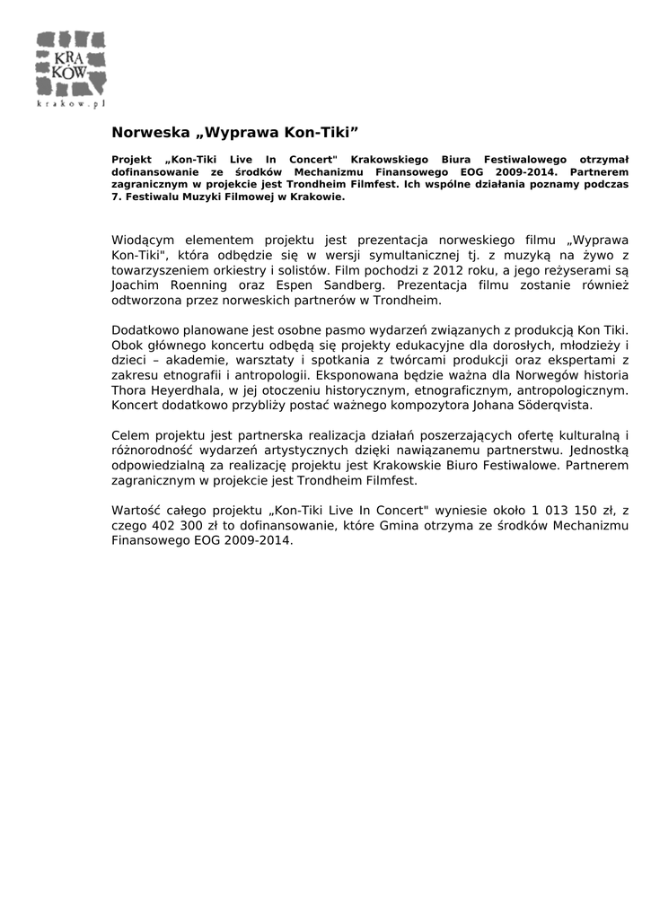 Norweska „Wyprawa Kon-Tiki” Projekt „Kon-Tiki Live In Concert" Krakowskiego Biura Festiwalowego otrzymał dofinansowanie ze środków Mechanizmu Finansowego EOG 2009-2014. Partnerem zagranicznym w projekcie jest Trondheim Filmfest. Ich wspólne działania poznamy podczas 7. Festiwalu Muzyki Filmowej w Krakowie. Wiodącym elementem projektu jest prezentacja norweskiego filmu „Wyprawa Kon-Tiki", która odbędzie się w wersji symultanicznej tj. z muzyką na żywo z towarzyszeniem orkiestry i solistów. Film pochodzi z 2012 roku, a jego reżyserami są Joachim Roenning oraz Espen Sandberg. Prezentacja filmu zostanie również odtworzona przez norweskich partnerów w Trondheim. Dodatkowo planowane jest osobne pasmo wydarzeń związanych z produkcją Kon Tiki. Obok głównego koncertu odbędą się projekty edukacyjne dla dorosłych, młodzieży i dzieci – akademie, warsztaty i spotkania z twórcami produkcji oraz ekspertami z zakresu etnografii i antropologii. Eksponowana będzie ważna dla Norwegów historia Thora Heyerdhala, w jej otoczeniu historycznym, etnograficznym, antropologicznym. Koncert dodatkowo przybliży postać ważnego kompozytora Johana Söderqvista. Celem projektu jest partnerska realizacja działań poszerzających ofertę kulturalną i różnorodność wydarzeń artystycznych dzięki nawiązanemu partnerstwu. Jednostką odpowiedzialną za realizację projektu jest Krakowskie Biuro Festiwalowe. Partnerem zagranicznym w projekcie jest Trondheim Filmfest. Wartość całego projektu „Kon-Tiki Live In Concert" wyniesie około 1 013 150 zł, z czego 402 300 zł to dofinansowanie, które Gmina otrzyma ze środków Mechanizmu Finansowego EOG 2009-2014. Powered by TCPDF (www.tcpdf.org)