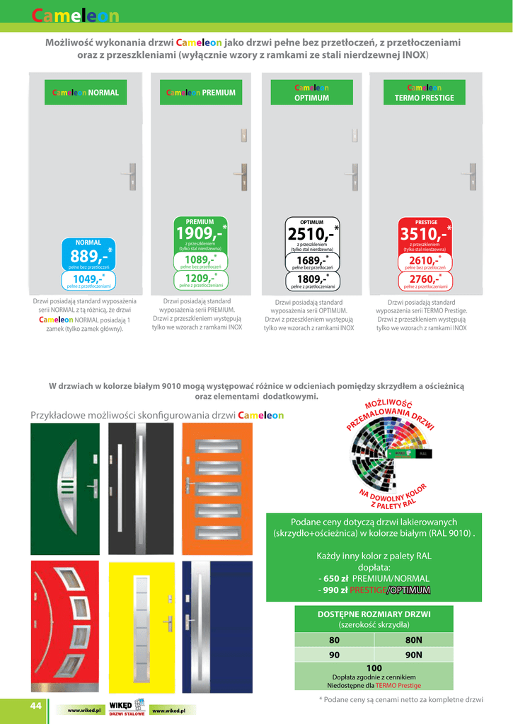 Cameleon Możliwość wykonania drzwi Cameleon jako drzwi pełne bez przetłoczeń, z przetłoczeniami oraz z przeszkleniami (wyłącznie wzory z ramkami ze stali nierdzewnej INOX) Cameleon NORMAL NORMAL 889,- * pełne bez przetłoczeń 1049,-* pełne z przetłoczeniami Drzwi posiadają standard wyposażenia serii NORMAL z tą różnicą, że drzwi Cameleon NORMAL posiadają 1 zamek (tylko zamek główny). Cameleon PREMIUM Cameleon OPTIMUM PREMIUM OPTIMUM 1909,- * PRESTIGE 2510,- z przeszkleniem (tylko stal nierdzewna) 3510,-* * z przeszkleniem (tylko stal nierdzewna) 1089,-* z przeszkleniem (tylko stal nierdzewna) 1689,-* pełne bez przetłoczeń 2610,-* pełne bez przetłoczeń 1209,-* pełne bez przetłoczeń 1809,-* pełne z przetłoczeniami Drzwi posiadają standard wyposażenia serii PREMIUM. Drzwi z przeszkleniem występują tylko we wzorach z ramkami INOX Cameleon TERMO PRESTIGE 2760,-* pełne z przetłoczeniami pełne z przetłoczeniami Drzwi posiadają standard wyposażenia serii OPTIMUM. Drzwi z przeszkleniem występują tylko we wzorach z ramkami INOX Drzwi posiadają standard wyposażenia serii TERMO Prestige. Drzwi z przeszkleniem występują tylko we wzorach z ramkami INOX W drzwiach w kolorze białym 9010 mogą występować różnice w odcieniach pomiędzy skrzydłem a ościeżnicą oraz elementami dodatkowymi. MOŻ EM RZ NA RZ W I P Przykładowe możliwości skonfigurowania drzwi Cameleon LIWOŚĆ ALOWANIA D OR DOWOLNY KOL Z PALET Y R AL Podane ceny dotyczą drzwi lakierowanych (skrzydło+ościeżnica) w kolorze białym (RAL 9010) . Każdy inny kolor z palety RAL dopłata: - 650 zł PREMIUM/NORMAL - 990 zł PRESTIGE/OPTIMUM DOSTĘPNE ROZMIARY DRZWI (szerokość skrzydła) 80 80N 90 90N 100 Dopłata zgodnie z cennikiem Niedostępne dla TERMO Prestige 44 * Podane ceny są cenami netto za kompletne drzwi www.wiked.pl www.wiked.pl