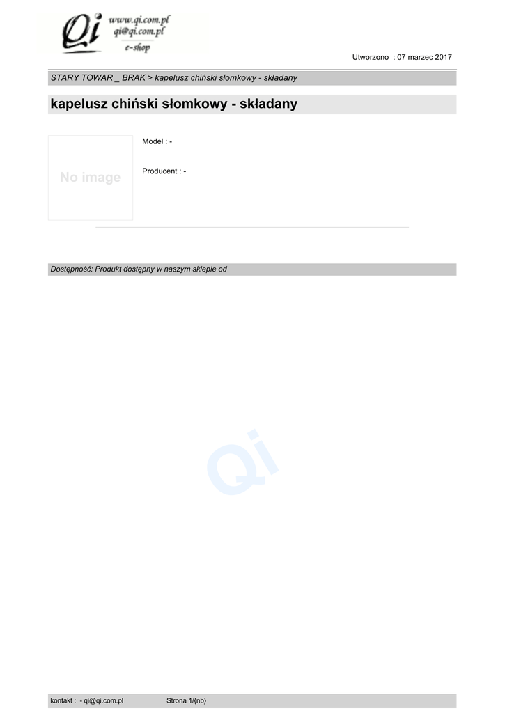 Utworzono : 07 marzec 2017 STARY TOWAR _ BRAK > kapelusz chiński słomkowy - składany kapelusz chiński słomkowy - składany Model : - No image Producent : - Dostępność: Produkt dostępny w naszym sklepie od i Q kontakt : - [email protected] Strona 1/{nb}