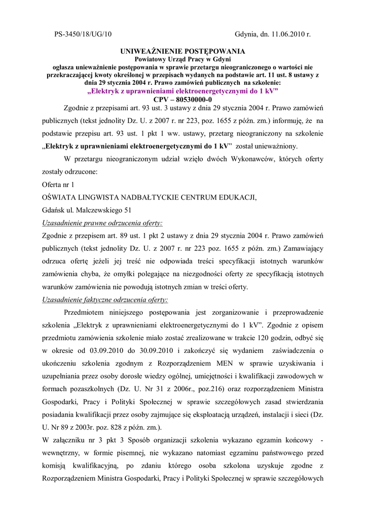 PS-3450/18/UG/10 Gdynia, dn. 11.06.2010 r. UNIWEAŻNIENIE POSTĘPOWANIA Powiatowy Urząd Pracy w Gdyni ogłasza unieważnienie postępowania w sprawie przetargu nieograniczonego o wartości nie przekraczającej kwoty określonej w przepisach wydanych na podstawie art. 11 ust. 8 ustawy z dnia 29 stycznia 2004 r. Prawo zamówień publicznych na szkolenie: „Elektryk z uprawnieniami elektroenergetycznymi do 1 kV” CPV – 80530000-0 Zgodnie z przepisami art. 93 ust. 3 ustawy z dnia 29 stycznia 2004 r. Prawo zamówień publicznych (tekst jednolity Dz. U. z 2007 r. nr 223, poz. 1655 z późn. zm.) informuję, że na podstawie przepisu art. 93 ust. 1 pkt 1 ww. ustawy, przetarg nieograniczony na szkolenie „Elektryk z uprawnieniami elektroenergetycznymi do 1 kV” został unieważniony. W przetargu nieograniczonym udział wzięło dwóch Wykonawców, których oferty zostały odrzucone: Oferta nr 1 OŚWIATA LINGWISTA NADBAŁTYCKIE CENTRUM EDUKACJI, Gdańsk ul. Malczewskiego 51 Uzasadnienie prawne odrzucenia oferty: Zgodnie z przepisem art. 89 ust. 1 pkt 2 ustawy z dnia 29 stycznia 2004 r. Prawo zamówień publicznych (tekst jednolity Dz. U. z 2007 r. nr 223 poz. 1655 z późn. zm.) Zamawiający odrzuca ofertę jeżeli jej treść nie odpowiada treści specyfikacji istotnych warunków zamówienia chyba, że omyłki polegające na niezgodności oferty ze specyfikacją istotnych warunków zamówienia nie powodują istotnych zmian w treści oferty. Uzasadnienie faktyczne odrzucenia oferty: Przedmiotem niniejszego postępowania jest zorganizowanie i przeprowadzenie szkolenia „Elektryk z uprawnieniami elektroenergetycznymi do 1 kV”. Zgodnie z opisem przedmiotu zamówienia szkolenie miało zostać zrealizowane w trakcie 120 godzin, odbyć się w okresie od 03.09.2010 do 30.09.2010 i zakończyć się wydaniem zaświadczenia o ukończeniu szkolenia zgodnym z Rozporządzeniem MEN w sprawie uzyskiwania i uzupełniania przez osoby dorosłe wiedzy ogólnej, umiejętności i kwalifikacji zawodowych w formach pozaszkolnych (Dz. U. Nr 31 z 2006r., poz.216) oraz rozporządzeniem Ministra Gospodarki, Pracy i Polityki Społecznej w sprawie szczegółowych zasad stwierdzania posiadania kwalifikacji przez osoby zajmujące się eksploatacją urządzeń, instalacji i sieci (Dz. U. Nr 89 z 2003r. poz. 828 z późn. zm.). W załączniku nr 3 pkt 3 Sposób organizacji szkolenia wykazano egzamin końcowy - wewnętrzny, w formie pisemnej, nie wykazano natomiast egzaminu państwowego przed komisją kwalifikacyjną, po zdaniu którego osoba szkolona uzyskuje zgodne z Rozporządzeniem Ministra Gospodarki, Pracy i Polityki Społecznej w sprawie szczegółowych zasad stwierdzania posiadania kwalifikacji przez osoby zajmujące się eksploatacją urządzeń, instalacji i sieci (Dz. U. Nr 89 z 2003r. poz. 828 z późn. zm.) zaświadczenie niezbędne do pracy jako elektryk. Egzamin ten nie został również wykazany w załączniku nr 7 Harmonogramie szkolenia, mimo, że w treści SIWZ był taki wymóg. Informacja o tym egzaminie została zawarta jedynie w załączniku nr 3 pkt 8 - Sposób sprawdzania efektów szkolenia, w tym ocena końcowa uczestnika szkolenia (np. w formie egzaminu, testu, itp.), bez wskazania jednak terminu tego egzaminu. W związku z brakiem terminu egzaminu państwowego w harmonogramie szkolenia oferta uznana został za niezgodną z przedmiotem zamówienia ponieważ miał się on odbyć w okresie trwania szkolenia, a nie po nim. Oferta nr 2 ELBLĄSKI UNWERSYTET ROBOTNICZY, Elbląg ul. 1 Maja 54 Uzasadnienie prawne odrzucenia oferty: Zgodnie z przepisem art. 89 ust. 1 pkt 2 ustawy z dnia 29 stycznia 2004 r. Prawo zamówień publicznych (tekst jednolity Dz. U. z 2007 r. nr 223 poz. 1655 z późn. zm.) Zamawiający odrzuca ofertę jeżeli jej treść nie odpowiada treści specyfikacji istotnych warunków zamówienia chyba, że omyłki polegające na niezgodności oferty ze specyfikacją istotnych warunków zamówienia nie powodują istotnych zmian w treści oferty. Uzasadnienie faktyczne odrzucenia oferty brak potwierdzenia strony nr 9 i 31 – załącznik nr 4 Zobowiązanie do współpracy, za zgodność z oryginałem, co było wymagane w pkt V.15 SIWZ, brak podpisu na str. 8 oferty, co było wymagane w pkt V.10 SIWZ, w załączniku nr 5 – Informacja o szkoleniach o tematyce zgodnej z profilem zamówienia, realizowanych w ostatnich 3 latach, nie podano nazw szkoleń’ które zostały zrealizowane przez Wykonawcę, co było wymagane w treści SIWZ i co uniemożliwia zbadanie zgodności tematycznej przeprowadzonych szkoleń z profilem zamówienia, w załączniku nr 7 Harmonogram szkolenia, wykazano, że w dniu 23.09.2010 i 30.09.2010 zajęcia będą trwały 2 godziny, szkolenie zostanie przeprowadzone w trakcie 18 dni zajęć, w drugim tygodniu szkolenia będzie zajęć mniej niż 30 godzin a w ostatnim mniej niż 24, co jest niezgodne z pkt III. 6 SIWZ; dodatkowo nie podano godzin zajęć i przerw. Ponad to brak jest dat na stronach 9, 11 i 12 oraz w załączniku nr 6 kalkulacja szkolenia nie wyrażono kwot słownie. Proszę o potwierdzenie odbioru faksu poprzez odesłanie faksu z dopiskiem „odebrałem i zapoznałem się w dniu………..”.