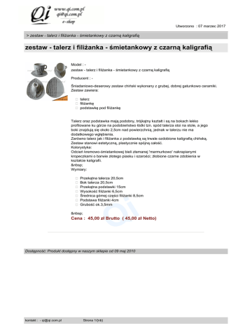 Utworzono : 07 marzec 2017 > zestaw - talerz i filiżanka - śmietankowy z czarną kaligrafią zestaw - talerz i filiżanka - śmietankowy z czarną kaligrafią Model : zestaw - talerz i filiżanka - śmietankowy z czarną kaligrafią Producent : Śniadaniowo-deserowy zestaw chiński wykonany z grubej, dobrej gatunkowo ceramiki. Zestaw zawiera: � talerz � filiżankę � podstawkę pod filiżankę Talerz oraz podstawka mają podobny, trójkątny kształt i są na bokach lekko profilowane ku górze na podobieństwo łódki tzn. spód talerza stoi na stole, a jego boki znajdują się około 2,5cm nad powierzchnią, jednak w talerzu nie ma dodatkowego wgłębienia. Zarówno talerz jak i filiżanka z podstawką są trwale ozdobione kaligrafią chińską. Zestaw stanowi estetyczną, plastycznie spójną całość. Kolorystyka: Odcień kremowo-śmietankowej bieli złamanej 'marmurkowo' nakrapianymi kropeczkami o barwie złotego piasku i szarości; żłobione czarne zdobienia w kształcie kaligrafii. Wymiary: � Przekątna talerza 20,5cm � Bok talerza 20,5cm � Przekątna podstawki 15cm � Wysokość filiżanki 6,5cm � Średnica górnej części filiżanki 8,5cm � Podstawa filiżanki 4cm � Grubość ok.3,5mm i Q Cena : 45,00 zł Brutto ( 45,00 zł Netto) Dostępność: Produkt dostępny w naszym sklepie od 09 maj 2010 kontakt : - [email protected] Strona 1/{nb}