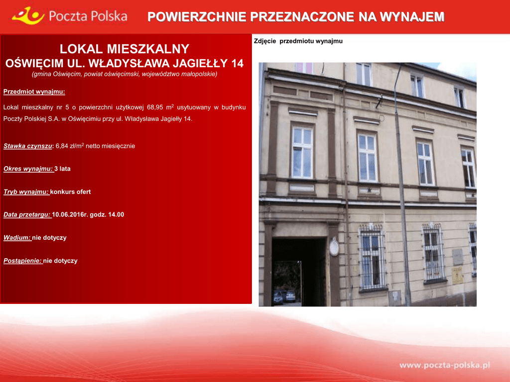 POWIERZCHNIE PRZEZNACZONE NA WYNAJEM - LOKAL MIESZKALNY OŚWIĘCIM UL. WŁADYSŁAWA JAGIEŁŁY 14 (gmina Oświęcim, powiat oświęcimski, województwo małopolskie) Przedmiot wynajmu: Lokal mieszkalny nr 5 o powierzchni użytkowej 68,95 m2 usytuowany w budynku Poczty Polskiej S.A. w Oświęcimiu przy ul. Władysława Jagiełły 14. Stawka czynszu: 6,84 zł/m2 netto miesięcznie Okres wynajmu: 3 lata Tryb wynajmu: konkurs ofert Data przetargu: 10.06.2016r. godz. 14.00 Wadium: nie dotyczy Postąpienie: nie dotyczy Zdjęcie przedmiotu wynajmu i zlokalizuj na mapie Opis przedmiotu wynajmu: Lokal mieszkalny usytuowany jest na II piętrze budynku stanowiącego własność Poczty Polskiej S.A. Lokal mieszkalny Nr 5 składa się z następujących pomieszczeń: 1 pokój 12,37 m², 2 pokój 20,19 m², kuchnia 12,01 m², korytarz o powierzchni 19,07 m2, łazienka o powierzchni 4,26 m2, WC 1,05 m2. Łączna powierzchnia lokalu mieszkalnego wynosi 68,95 m2. W/w lokal obecnie stanowi pustostan. Do lokalu mieszkalnego przynależy piwnica o powierzchni użytkowej 3,00 m2. Lokal wyposażony w instalacje: elektryczna, wodną, kanalizacyjną , gazową i centralnego ogrzewania. Niezależnie od czynszu Najemca będzie ponosił opłaty za pobór wody i odprowadzanie ścieków , odpady komunalne oraz opłatę za centralne ogrzewanie w formie zaliczki. Opis nieruchomości: Miejscowość Oświęcim Ulica, nr budynku Władysława Jagiełły 14 Powierzchnia budynku, w których zlokalizowany jest przedmiot wynajmu 1466,00 m2 Nr działki ewidencyjnej, obręb 225/6 i 2552 Obręb 1 Oświęcim Księga wieczysta, Sąd Rejonowy, Nr Wydziału KR1E/00005446/7 Sąd Rejonowy w Oświęcimiu V Wydział Ksiąg Wieczystych Stan prawny gruntu Stan prawny uregulowany. Lokalizacja i dostępność komunikacyjna: Nieruchomość położona jest w Oświęcimiu przy ul. Władysława Jagiełły 14 niedaleko centrum. Budynek usytuowany jest w terenie zabudowy mieszkalnousługowej. Dojazd do nieruchomości przebiega drogą o nawierzchni asfaltowej. Dostępność komunikacyjna jest bardzo dobra, lokalizacja bardzo dobra, korzystne wyeksponowanie nieruchomości przy drodze głównej. Opis nieruchomości: Budynek PP SA jest budynkiem wybudowanym w technologii tradycyjnej, jest murowany trzykondygnacyjny, przykryty dwuspadowym dachem, pokrytym blachą. Budynek jest w średnim stanie technicznym. OBWIESZCZENIE O PRZETARGU NA NAJEM LOKALU MIESZKALNEGO Wynajmujący: POCZTA POLSKA S.A. z siedzibą w Warszawie, 00-940 Warszawa, ul. Rodziny Hiszpańskich 8 Prowadzący przetarg: Poczta Polska S.A., Pion Infrastruktury Obszar Operacyjny ds. Nieruchomości w Krakowie, ul. Westerplatte 20 31-045 Kraków Miejsce przetargu: ul. Moniuszki 1 35-017 Rzeszów pokój Nr 7 Wydział Zarządzania Nieruchomościami Termin obowiązywania umowy najmu – 3 lata. Charakterystyka przedmiotu najmu: Lokal mieszkalny usytuowany na II piętrze budynku Urzędu Pocztowego. Pomieszczenia lokalu mieszkalnego to: 1 pokój 12,37 m², 2 pokój 20,19 m², kuchnia 12,01 m², korytarz o powierzchni 19,07 m2, łazienka o powierzchni 4,26 m2, WC 1,05 m2. Łączna powierzchnia lokalu mieszkalnego wynosi 68,95 m2. W/w lokal obecnie stanowi pustostan. Do lokalu mieszkalnego przynależy piwnica o powierzchni użytkowej 3,00 m2. Minimalna stawka czynszu netto dla w/w lokalu wynosi: 6,84 zł/m2 netto miesięcznie (słownie: sześć złotych 84/100 gr. za metr kwadratowy). Postąpienia: nie dotyczy Wadium: nie dotyczy Termin składania ofert: 10.06.2016r. godzina 14.00 (Oferty należy składać w zaklejonej kopercie w pokoju nr 7 w budynku przy ul. Moniuszki 1 35- 017 Rzeszów z napisem na kopercie „postępowanie na najem lokalu mieszkalnego Nr 5 w Oświęcimiu przy ul. Władysława Jagiełły 14 . Otwarcie ofert następuje w następnym dniu roboczym tj. 13.06.2016r. godz. 12.00 Warunkiem przystąpienia do konkursu ofert jest: Złożenie przez Oferenta oświadczenia o zapoznaniu się z projektem umowy najmu i przyjęciu zawartych zapisów bez zastrzeżeń, jak również oświadczenie, że zapoznał się ze stanem technicznym przedmiotu najmu. Złożenie oferty w podanym terminie. Informacje dodatkowe: Okres wiązania ofert wynosi 90 dni. Jedna złożona oferta wystarcza do odbycia postępowania. W związku z faktem, iż wartość rynkowa części nieruchomości przekracza równowartość w złotych 50 000 euro na dokonanie czynności prawnej – najem części nieruchomości – wymagana jest (zgodnie z art. 5a ustawy z dnia 8 sierpnia 1996 r. o zasadach wykonywania uprawnień przysługujących Skarbowi Państwa, Dz. U. 1996 Nr 106, poz. 493 ze zm.), zgoda ministra właściwego do spraw Skarbu Państwa. Termin oględzin pomieszczeń można uzgodnić w dni powszednie w godz. 8.00- 15.00 po uprzednim kontakcie z pracownikiem merytorycznym Panią Agnieszką Pawlik tel. 12 410 60 46 kom. 504 701 157 Pomieszczenia można oglądać do dnia 07.06.2016r. Z projektem umowy najmu można się zapoznać pod adresem: ul. Moniuszki 1 35-017 Rzeszów pokój nr 7 Wydział Zarządzania Nieruchomościami. Możliwość e-mailowego przesłania projektu umowy. POCZTA POLSKA S.A. ZASTRZEGA SOBIE PRAWO UNIEWAŻNIENIA PRZETARGU W KAŻDYM CZASIE BEZ PODANIA PRZYCZYN I PONOSZENIA SKUTKÓW PRAWNYCH I FINANSOWYCH Z TEGO TYTUŁU. Formularz zgłoszenia uczestnictwa w przetargu Dotyczy wynajmu części nieruchomości: Lokal mieszkalny nr 5 o powierzchni użytkowej 68,95 m2 wraz z pomieszczeniem przynależnym – piwnica o pow. 3,00 m2 , usytuowany na II piętrze w budynku PP SA w miejscowości Oświęcim ul. Władysława Jagiełły 14. Czas trwania umowy najmu – 3 lata. Dane uczestnika przetargu: Imię i nazwisko/Firma: …………………………………………………………………………………………………………………………………….…… Adres zamieszkania/Adres Firmy: …………………………………………………………………………………………………