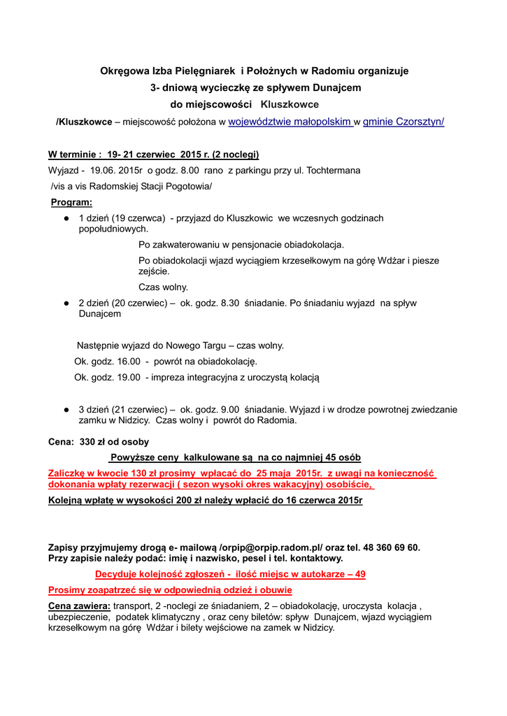 Okręgowa Izba Pielęgniarek i Położnych w Radomiu organizuje 3- dniową wycieczkę ze spływem Dunajcem do miejscowości Kluszkowce /Kluszkowce – miejscowość położona w województwie małopolskim w gminie Czorsztyn/ W terminie : 19- 21 czerwiec 2015 r. (2 noclegi) Wyjazd - 19.06. 2015r o godz. 8.00 rano z parkingu przy ul. Tochtermana /vis a vis Radomskiej Stacji Pogotowia/ Program: 1 dzień (19 czerwca) - przyjazd do Kluszkowic we wczesnych godzinach popołudniowych. Po zakwaterowaniu w pensjonacie obiadokolacja. Po obiadokolacji wjazd wyciągiem krzesełkowym na górę Wdżar i piesze zejście. Czas wolny. 2 dzień (20 czerwiec) – ok. godz. 8.30 śniadanie. Po śniadaniu wyjazd na spływ Dunajcem Następnie wyjazd do Nowego Targu – czas wolny. Ok. godz. 16.00 - powrót na obiadokolację. Ok. godz. 19.00 - impreza integracyjna z uroczystą kolacją 3 dzień (21 czerwiec) – ok. godz. 9.00 śniadanie. Wyjazd i w drodze powrotnej zwiedzanie zamku w Nidzicy. Czas wolny i powrót do Radomia. Cena: 330 zł od osoby Powyższe ceny kalkulowane są na co najmniej 45 osób Zaliczkę w kwocie 130 zł prosimy wpłacać do 25 maja 2015r. z uwagi na konieczność dokonania wpłaty rezerwacji ( sezon wysoki okres wakacyjny) osobiście, Kolejną wpłatę w wysokości 200 zł należy wpłacić do 16 czerwca 2015r Zapisy przyjmujemy drogą e- mailową /[email protected]/ oraz tel. 48 360 69 60. Przy zapisie należy podać: imię i nazwisko, pesel i tel. kontaktowy. Decyduje kolejność zgłoszeń - ilość miejsc w autokarze – 49 Prosimy zoapatrzeć się w odpowiednią odzież i obuwie Cena zawiera: transport, 2 -noclegi ze śniadaniem, 2 – obiadokolację, uroczysta kolacja , ubezpieczenie, podatek klimatyczny , oraz ceny biletów: spływ Dunajcem, wjazd wyciągiem krzesełkowym na górę Wdżar i bilety wejściowe na zamek w Nidzicy.