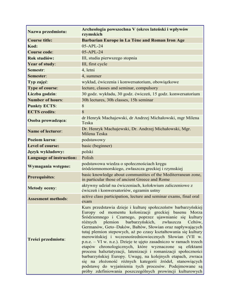 Nazwa przedmiotu: Course title: Kod: Course code: Rok studiów: Year of study: Semestr: Semester: Typ zajęć: Type of course: Liczba godzin: Number of hours: Punkty ECTS: ECTS credits: Osoba prowadząca: Name of lecturer: Poziom kursu: Level of course: Język wykładowy: Language of instruction: Wymagania wstępne: Prerequisites: Metody oceny: Assesment methods: Treści przedmiotu: Archeologia powszechna V (okres lateński i wpływów rzymskich Barbarian Europe in La Tène and Roman Iron Age 05-APL-24 05-APL-24 III, studia pierwszego stopnia III, first cycle 4, letni 4, summer wykład, ćwiczenia i konwersatorium, obowiązkowe lecture, classes and seminar, compulsory 30 godz. wykładu, 30 godz. ćwiczeń, 15 godz. konwersatorium 30h lectures, 30h classes, 15h seminar 8 8 dr Henryk Machajewski, dr Andrzej Michałowski, mgr Milena Teska Dr. Henryk Machajewski, Dr. Andrzej Michałowski, Mgr. Milena Teska podstawowy basic (beginner) polski Polish podstawowa wiedza o społecznościach kręgu śródziemnomorskiego, zwłaszcza greckiej i rzymskiej basic knowledge about communities of the Mediterranean zone, in particular those of ancient Greece and Rome aktywny udział na ćwiczeniach, kolokwium zaliczeniowe z ćwiczeń i konwersatoriów, egzamin ustny active class participation, lecture and seminar exams, final oral exam Kurs przedstawia dzieje i kulturę społeczeństw barbarzyńskiej Europy od momentu kolonizacji greckiej basenu Morza Śródziemnego i Czarnego, poprzez ujawnianie się kultury różnych plemion barbarzyńskich, zwłaszcza Celtów, Germanów, Geto–Daków, Bałtów, Słowian oraz napływających tutaj plemion stepowych, aż po czasy kształtowania się kultury merowińskiej i wczesnośredniowiecznych Słowian (VII w. p.n.e. – VI w. n.e.). Dzieje te ujęto zasadniczo w ramach trzech etapów chronologicznych, które wyznaczone są efektami procesu halsztatyzacji, latenizacji i romanizacji społeczności barbarzyńskiej Europy. Uwagę, na kolejnych etapach, zwraca się na złożoność różnych kategorii źródeł, stanowiących podstawę do wyjaśnienia tych procesów. Podejmowane są próby zdefiniowania poszczególnych prowincji kulturowych Course contents: Cele i efekty kształcenia: Europy barbarzyńskiej, a w związku z tym przeprowadza się analizę tzw. kultur archeologicznych i jej wyznaczników. Na tym tle uwzględnia się kwestie podstaw gospodarczych, stosunków społecznych i kultury symbolicznej. Osobnym zagadnieniem pozostaje próba nakreślenia, wykorzystując źródła językowe, pisane, archeologiczne i antropologiczne, wybranych aspektów procesu etnogenezy różnych społeczności barbarzyńskiej Europy. The course aims to present history and culture of the Barbarian Europe from the moment of the Greek colonization of the Mediterranean and Black Sea basins through the emergence of different Barbarian tribes, in particular the Celts, the Germans, the Geto-Dacians, the Balts, and the Slavs in addition to steppe tribes up to the emergence of the Merovingians and early Medieval Slavs (7th century BC – 6th century AD). This history is generally divided into three chronological stages that are marked by the consequences of the Hallstatt, La Tène, and Roman influences, respectively on local Barbarian communities of Europe. The course will particularly focus upon a complexity of archaeological evidence making possible to explain this process. It will be aimed at defining different culture provinces of the Barbarian Europe by detailed analysis of so-called archaeological cultures and their material culture. Consequently, this will lead to presenting their economic foundations, social structure and symbolic culture. Additional issue involves an attempt to address selected aspects of ethnogenesis of different communities of the Barbarian Europe by looking at linguistic, written, archaeological, and anthropological evidence. Słuchacz kursu: 1) uzyskuje gruntowną wiedzę o: dziejach społeczności barbarzyńskiej Europy w dobie ich kontaktowania się ze społeczeństwami kultury śródziemnomorskiej; kwestii metod i źródeł wykorzystywanych przy formułowaniu kwestionariusza pytań dotyczących barbarzyńskiej Europy; aktualnych kierunkach badań nad społecznościami barbarzyńskiej Europy, w tym szczególnie na terenie Polski; 2) rozumie: znaczenie przemian społecznych i kulturowych dokonujących się w Europie u schyłku starożytności i wynikających stąd konsekwencji dla społeczności wczesnośredniowiecznych; specyfikę bazy źródłowej, z której czerpie refleksję o Europie u schyłku starożytności; złożoność pojęcia tzw. kultury archeologicznej i trudności z jej egzemplifikacją podmiotową; 3) posiada umiejętność: rozumienia różnych terminologii kulturowych, podmiotowych, zwłaszcza określenia „wspólnota komunikatywna”, chronologicznych; posługiwania się tymi terminami; wyjaśniania procesów etnogenetycznych; rozróżnienia „przedmiot” a „podmiot” w badaniach kultury barbarzyńskiej Europy; doboru źródeł dla realizowania w Objectives and learning outcomes: Zalecana literatura: Recommended reading: przyszłości swoich prac dyplomowych; konstruowania wniosków o procesach przemian kulturowo – osadniczych; umiejętność podejmowania dyskusji o problemach badań nad społecznościami barbarzyńskiej Europy. Student: 1) will gain the basic knowledge of: history of local communities of the Barbarian Europe as regards their contacts with societies from the Mediterranean zone; methods and material evidence used for studies of the Barbarian Europe; contemporary approaches to studies of the Barbarian Europe communities, in particular those inhabiting Poland; 2) will gain the understanding of: significance of social and cultural transformations in Europe towards the end of antiquity and their consequences for early Medieval communities; peculiarity of material culture influencing our understanding of Europe in this perio