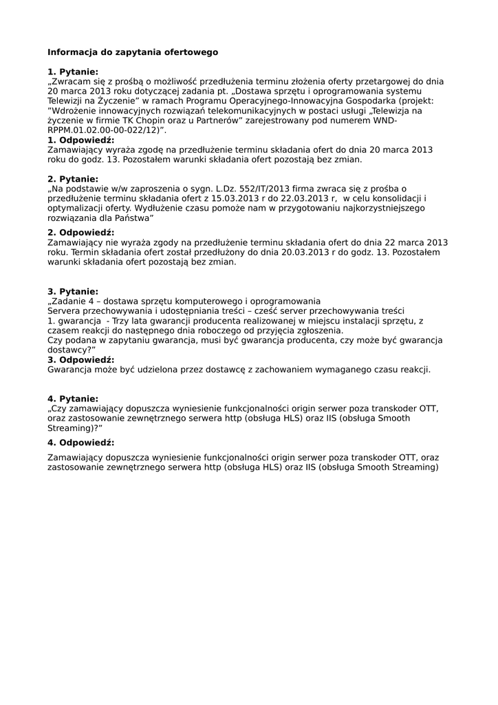 Informacja do zapytania ofertowego 1. Pytanie: „Zwracam się z prośbą o możliwość przedłużenia terminu złożenia oferty przetargowej do dnia 20 marca 2013 roku dotyczącej zadania pt. „Dostawa sprzętu i oprogramowania systemu Telewizji na Życzenie” w ramach Programu Operacyjnego-Innowacyjna Gospodarka (projekt: ”Wdrożenie innowacyjnych rozwiązań telekomunikacyjnych w postaci usługi „Telewizja na życzenie w firmie TK Chopin oraz u Partnerów” zarejestrowany pod numerem WNDRPPM.01.02.00-00-022/12)”. 1. Odpowiedź: Zamawiający wyraża zgodę na przedłużenie terminu składania ofert do dnia 20 marca 2013 roku do godz. 13. Pozostałem warunki składania ofert pozostają bez zmian. 2. Pytanie: „Na podstawie w/w zaproszenia o sygn. L.Dz. 552/IT/2013 firma zwraca się z prośba o przedłużenie terminu składania ofert z 15.03.2013 r do 22.03.2013 r, w celu konsolidacji i optymalizacji oferty. Wydłużenie czasu pomoże nam w przygotowaniu najkorzystniejszego rozwiązania dla Państwa” 2. Odpowiedź: Zamawiający nie wyraża zgody na przedłużenie terminu składania ofert do dnia 22 marca 2013 roku. Termin składania ofert został przedłużony do dnia 20.03.2013 r do godz. 13. Pozostałem warunki składania ofert pozostają bez zmian. 3. Pytanie: „Zadanie 4 – dostawa sprzętu komputerowego i oprogramowania Servera przechowywania i udostępniania treści – cześć server przechowywania treści 1. gwarancja - Trzy lata gwarancji producenta realizowanej w miejscu instalacji sprzętu, z czasem reakcji do następnego dnia roboczego od przyjęcia zgłoszenia. Czy podana w zapytaniu gwarancja, musi być gwarancja producenta, czy może być gwarancja dostawcy?” 3. Odpowiedź: Gwarancja może być udzielona przez dostawcę z zachowaniem wymaganego czasu reakcji. 4. Pytanie: „Czy zamawiający dopuszcza wyniesienie funkcjonalności origin serwer poza transkoder OTT, oraz zastosowanie zewnętrznego serwera http (obsługa HLS) oraz IIS (obsługa Smooth Streaming)?” 4. Odpowiedź: Zamawiający dopuszcza wyniesienie funkcjonalności origin serwer poza transkoder OTT, oraz zastosowanie zewnętrznego serwera http (obsługa HLS) oraz IIS (obsługa Smooth Streaming)