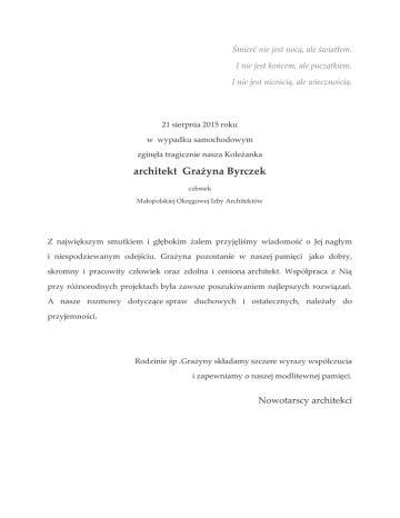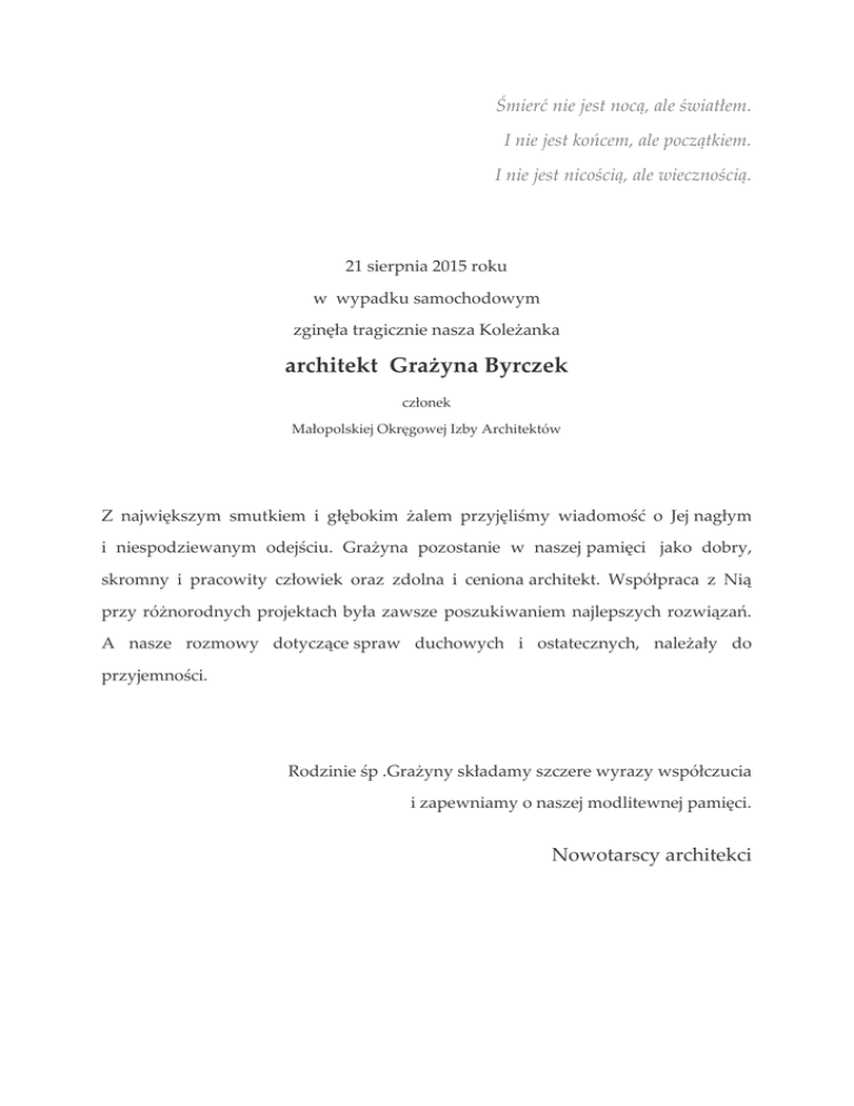 Śmierć nie jest nocą, ale światłem. I nie jest końcem, ale początkiem. I nie jest nicością, ale wiecznością. 21 sierpnia 2015 roku w wypadku samochodowym zginęła tragicznie nasza Koleżanka architekt Grażyna Byrczek członek Małopolskiej Okręgowej Izby Architektów Z największym smutkiem i głębokim żalem przyjęliśmy wiadomość o Jej nagłym i niespodziewanym odejściu. Grażyna pozostanie w naszej pamięci jako dobry, skromny i pracowity człowiek oraz zdolna i ceniona architekt. Współpraca z Nią przy różnorodnych projektach była zawsze poszukiwaniem najlepszych rozwiązań. A nasze rozmowy dotyczące spraw duchowych i ostatecznych, należały do przyjemności. Rodzinie śp .Grażyny składamy szczere wyrazy współczucia i zapewniamy o naszej modlitewnej pamięci. Nowotarscy architekci