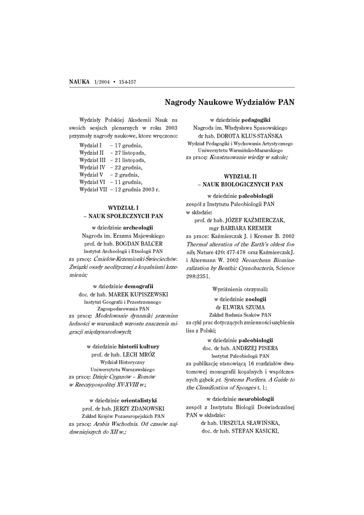 NAUKA 1/2004 • 154-157 Nagrody Naukowe Wydziałów PAN Wydziały Polskiej Akademii Nauk na swoich sesjach plenarnych w roku 2003 przyznały nagrody naukowe, ktore wręczono: Wydział I ! 17 grudnia, Wydział II ! 27 listopada, Wydział III ! 21 listopada, Wydział IV ! 22 grudnia, Wydział V ! 2 grudnia, Wydział VI ! 11 grudnia, Wydział VII ! 12 grudnia 2003 r. WYDZIAŁ I – NAUK SPOŁECZNYCH PAN w dziedzinie archeologii Nagroda im. Erazma Majewskiego prof. dr hab. BOGDAN BALCER Instytut Archeologii i Etnologii PAN za pracę: Ćmielów-Krzemionki-Świeciechów. Związki osady neolitycznej z kopalniami krzemienia; w dziedzinie demografii doc. dr hab. MAREK KUPISZEWSKI Instytut Geografii i Przestrzennego Zagospodarowania PAN za pracę: Modelowanie dynamiki przemian ludności w warunkach wzrostu znaczenia migracji międzynarodowych; w dziedzinie historii kultury prof. dr hab. LECH MRÓZ Wydział Historyczny Uniwersytetu Warszawskiego za pracę: Dzieje Cyganów – Romów w Rzeczypospolitej XV-XVIII w.; w dziedzinie orientalistyki prof. dr hab. JERZY ZDANOWSKI Zakład Krajów Pozaeuropejskich PAN za pracę: Arabia Wschodnia. Od czasów najdawniejszych do XII w.; w dziedzinie pedagogiki Nagroda im. Władysława Spasowskiego dr hab. DOROTA KLUS-STAŃSKA Wydział Pedagogiki i Wychowania Artystycznego Uniwersytetu Warmińsko-Mazurskiego za pracę: Konstruowanie wiedzy w szkole; WYDZIAŁ II – NAUK BIOLOGICZNYCH PAN w dziedzinie paleobiologii zespół z Instytutu Paleobiologii PAN w składzie: prof. dr hab. JÓZEF KAŹMIERCZAK, mgr BARBARA KREMER za prace: Kaźmierczak J. i Kremer B. 2002 Thermal alteration of the Earth’s oldest fossils, Nature 420: 477-478 oraz Kaźmierczak J. i Altermann W. 2002 Neoarchean Biomineralization by Benthic Cyanobacteria, Science 298:2351. Wyróżnienia otrzymali: w dziedzinie zoologii dr ELWIRA SZUMA Zakład Badania Ssaków PAN za cykl prac dotyczących zmienności uzębienia lisa z Polski; w dziedzinie paleobiologii doc. dr hab. ANDRZEJ PISERA Instytut Paleobiologii PAN za publikację stanowiącą 16 rozdziałów dwutomowej monografii kopalnych i współczesnych gąbek pt. Systema Porifera. A Guide to the Classification of Sponges t. 1; w dziedzinie neurobiologii zespół z Instytutu Biologii Doświadczalnej PAN w składzie: dr hab. URSZULA SŁAWIŃSKA, doc. dr hab. STEFAN KASICKI, Nagrody Naukowe Wydziałów PAN 155 dr ROZANA DJAVADIAN, dr HENRYK MAJCZYŃSKI za cykl prac pt.: Działanie i plastyczność sieci neuronalnych rdzenia kręgowego; w dziedzinie astronomii Nagroda im. Stefana Pieńkowskiego dr ARKADIUSZ OLECH w dziedzinie biologii komórki zespół z Instytutu Biologii Doświadczalnej PAN w składzie: prof. dr hab. BOŻENA KAMIŃSKA-KACZMAREK, dr BEATA PYRZYŃSKA, dr IZABELA FIGIEL-OŻÓG, dr GRAŻYNA MOSIENIAK, mgr IWONA CIECHOMSKA, mgr MAGDALENA DZIEMBOWSKA, mgr AGATA ŻUPAŃSKA za cykl prac pt.: Molekularne mechanizmy programowanej śmierci komórek indukowanej przez cyklosporynę A; w dziedzinie zoologii zespół z Akademii Podlaskiej w Siedlcach w składzie: prof. dr hab. BARBARA JEZIERSKA, dr MAŁGORZATA WITESKA za książkę: Metal Toxicity to Fish, za cykl prac poświęconych gwiazdom typu RR Lyrae w gromadach kulistych; w dziedzinie chemii Nagroda im. Włodzimierza Kołosa dr hab. KAROL GRELA w dziedzinie botaniki dr ANDRZEJ CHLEBICKI Instytut Botaniki PAN za pracę: Biogeographic relationships between fungi and selected glacial relict plants. WYDZIAŁ III — NAUK MATEMATYCZNYCH, FIZYCZNYCH I CHEMICZNYCH PAN w dziedzinie fizyki Nagroda Naukowa im. Marii Skłodowskiej-Curie za rok 2003 prof. dr hab. STANISŁAW JADACH Instytut Fizyki Jądrowej im. Henryka Niewodniczańskiego PAN za cykl prac o zastosowaniu modelowania stochastycznego w kwantowej teorii pola; Centrum Astronomiczne im. Mikołaja Kopernika PAN Instytut Chemii Organicznej PAN za cykl prac naukowych pt. Poszukiwania nowych katalizatorów oraz badanie metatezy alkenów i alkinów; w dziedzinie matematyki Nagroda im. Wacława Sierpińskiego Prof. dr hab. ADAM DOLIWA Wydział Matematyki i Informatyki Uniwersytetu Warmińsko-Mazurskiego za cykl prac pt. Całkowalna geometria dyskretna. WYDZIAŁ IV — NAUK TECHNICZNYCH PAN w dziedzinie mechaniki Nagroda im. Bohdana Stefanowskiego dr hab. inż. DARIUSZ MIKIELEWICZ Wydział Mechaniczny Politechniki Gdańskiej za cykl prac: Modelowanie wymiany pędu i ciepła w dwufazowym przepływie pęcherzykowym; w dziedzinie elektroniki dr hab. inż. ANDRZEJ DZIEDZIC Wydział Elektroniki Mikrosystemów i Fotoniki Politechniki Wrocławskiej za cykl prac: Niestandardowe metody charakteryzacji oraz nowe rozwiązania konstrukcyjno-technologiczne grubowarstwowych elementów i podzespołów biernych; w dziedzinie inżynierii materiałowej dr inż. DARIUSZ KATA Wydział Inżynierii Materiałowej i Ceramiki AGH 156 Nagrody Naukowe Wydziałów PAN za cykl prac obejmujących zaawansowane procesy spalania proszków metalicznych prowadzące do otrzymywania materiałów ceramicznych wykorzystywanych jako podłoża dla układów elektronicznych; w dziedzinie informatyki dr hab. inż. ANDRZEJ JASZKIEWICZ Instytut Informatyki Politechniki Poznańskiej za pracę Multiple Objective Metaheuristic Algorithms for Combinatorial Optimization; w dziedzinie budownictwa dr inż. DARIUSZ ŁYDŹBA Wydział Budownictwa Lądowego i Wodnego Politechniki Wrocławskiej za pracę: Zastosowania metody asymptotycznej homogenizacji w mechanice gruntów i skał; w dziedzinie budowy maszyn–eksploatacji dr hab. inż. ARKADIUSZ MĘŻYK Katedra Mechaniki Stosowanej Politechniki Śląskiej za pracę: Analiza i kształtowanie cech dynamicznych napędów elektromechanicznych. WYDZIAŁ V — NAUK ROLNICZYCH, LEŚNYCH I WETERYNARYJNYCH PAN w dziedzinie weterynarii zespół z Instytutu Fizjologii i Żywienia Zwierząt im. Jana Kielanowskiego PAN w Jabłonnie w składzie: prof. dr hab. JOLANTA POLKOWSKA dr ANNA WÓJCIK-GŁADYSZ dr MARTA WAŃKOWSKA za pracę: Regulacja funkcjonowania układu go