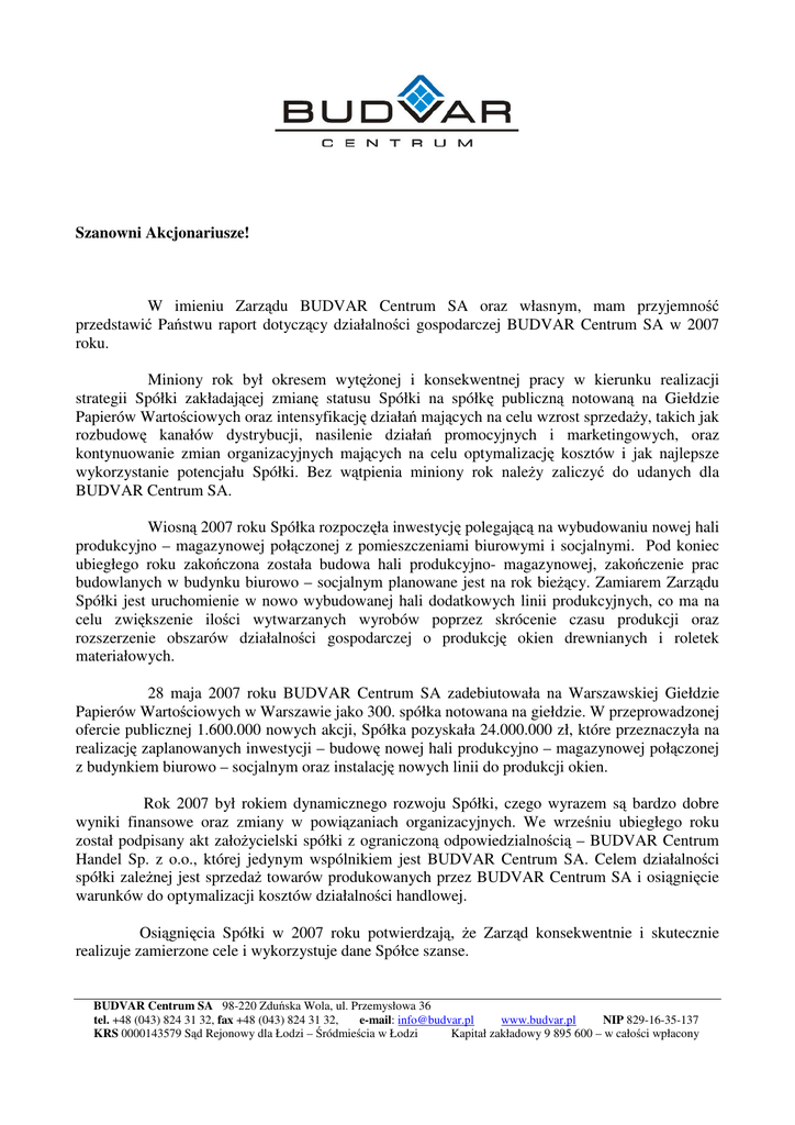 Szanowni Akcjonariusze! W imieniu Zarz du BUDVAR Centrum SA oraz własnym, mam przyjemno przedstawi Pa stwu raport dotycz cy działalno ci gospodarczej BUDVAR Centrum SA w 2007 roku. Miniony rok był okresem wyt onej i konsekwentnej pracy w kierunku realizacji strategii Spółki zakładaj cej zmian statusu Spółki na spółk publiczn notowan na Giełdzie Papierów Warto ciowych oraz intensyfikacj działa maj cych na celu wzrost sprzeda y, takich jak rozbudow kanałów dystrybucji, nasilenie działa promocyjnych i marketingowych, oraz kontynuowanie zmian organizacyjnych maj cych na celu optymalizacj kosztów i jak najlepsze wykorzystanie potencjału Spółki. Bez w tpienia miniony rok nale y zaliczy do udanych dla BUDVAR Centrum SA. Wiosn 2007 roku Spółka rozpocz ła inwestycj polegaj c na wybudowaniu nowej hali produkcyjno – magazynowej poł czonej z pomieszczeniami biurowymi i socjalnymi. Pod koniec ubiegłego roku zako czona została budowa hali produkcyjno- magazynowej, zako czenie prac budowlanych w budynku biurowo – socjalnym planowane jest na rok bie cy. Zamiarem Zarz du Spółki jest uruchomienie w nowo wybudowanej hali dodatkowych linii produkcyjnych, co ma na celu zwi kszenie ilo ci wytwarzanych wyrobów poprzez skrócenie czasu produkcji oraz rozszerzenie obszarów działalno ci gospodarczej o produkcj okien drewnianych i roletek materiałowych. 28 maja 2007 roku BUDVAR Centrum SA zadebiutowała na Warszawskiej Giełdzie Papierów Warto ciowych w Warszawie jako 300. spółka notowana na giełdzie. W przeprowadzonej ofercie publicznej 1.600.000 nowych akcji, Spółka pozyskała 24.000.000 zł, które przeznaczyła na realizacj zaplanowanych inwestycji – budow nowej hali produkcyjno – magazynowej poł czonej z budynkiem biurowo – socjalnym oraz instalacj nowych linii do produkcji okien. Rok 2007 był rokiem dynamicznego rozwoju Spółki, czego wyrazem s bardzo dobre wyniki finansowe oraz zmiany w powi zaniach organizacyjnych. We wrze niu ubiegłego roku został podpisany akt zało ycielski spółki z ograniczon odpowiedzialno ci – BUDVAR Centrum Handel Sp. z o.o., której jedynym wspólnikiem jest BUDVAR Centrum SA. Celem działalno ci spółki zale nej jest sprzeda towarów produkowanych przez BUDVAR Centrum SA i osi gni cie warunków do optymalizacji kosztów działalno ci handlowej. Osi gni cia Spółki w 2007 roku potwierdzaj , e Zarz d konsekwentnie i skutecznie realizuje zamierzone cele i wykorzystuje dane Spółce szanse. BUDVAR Centrum SA 98-220 Zdu ska Wola, ul. Przemysłowa 36 tel. +48 (043) 824 31 32, fax +48 (043) 824 31 32, e-mail: [email protected] www.budvar.pl NIP 829-16-35-137 KRS 0000143579 S d Rejonowy dla Łodzi – ródmie cia w Łodzi Kapitał zakładowy 9 895 600 – w cało ci wpłacony W dniu 15 maja 2007 roku Spółka otrzymała certyfikat w zakresie systemu zarz dzania wg ISO 9001:2000, za wiadczaj cy, i zgodnie z procedur TÜV CERT Spółka stosuje system zarz dzania zgodny z wymaganiami normy w zakresie projektowania, produkcji, sprzeda y i monta u stolarki otworowej. Potwierdzeniem dokona Spółki jest tytuł i Złota Statuetka Lidera Polskiego Biznesu, które Spółka otrzymała w lutym 2007 roku. Zostały one przyznane za dynamiczny rozwój, innowacyjno na rynku polskim w bran y budowlanej, produkcj wyrobów na wiatowym poziomie oraz tworzenie nowych miejsc pracy. Szczególnie satysfakcjonuj ce dla nas jest zaufanie jakim Konsumenci obdarzyli nasz Spółk . Produkowane przez BUDVAR Centrum SA okna pcw bez domieszek ołowiu zostały uznane przez Konsumentów "Odkryciem Roku 2007" w konkursie Laur Konsumenta. Ponadto okna pcw bez ołowiu w systemie Deluxe został nagrodzone Medalem Europejskim - t nagrod Spółka otrzymała po raz pi ty. W 2008 rok Spółka wkroczyła maj c ambitny plan rozwoju i rodki na rozwój, potencjał w postaci sprawdzonego kapitału ludzkiego i nowoczesnego maj tku produkcyjnego. Osi gni te wyniki finansowe pozwalaj s dzi , i rok 2008 i lata nast pne b d okresem dynamicznego rozwoju Spółki. Sukcesy Spółki nie byłyby mo liwe bez wsparcia osób, które nam ufaj . Dlatego te pragn zło y serdeczne podzi kowania wszystkim Akcjonariuszom, Partnerom handlowym, Klientom, Przedstawicielom rynku kapitałowego i instytucji finansowych, a tak e Pracownikom BUDVAR Centrum SA i BUDVAR Centrum Handel Sp. z o.o. za współprac i zaufanie jakim obdarzyli Spółk w roku ubiegłym. Prezes Zarz du Marek Trzci ski