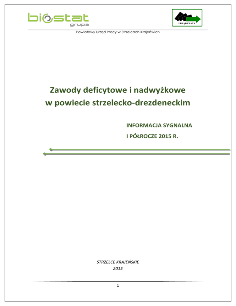 Powiatowy Urząd Pracy w Strzelcach Krajeńskich Zawody deficytowe i nadwyżkowe w powiecie strzelecko-drezdeneckim INFORMACJA SYGNALNA I PÓŁROCZE 2015 R. STRZELCE KRAJEŃSKIE 2015 1 Powiatowy Urząd Pracy w Strzelcach Krajeńskich Wstęp Niniejsze opracowanie dostarcza informacji na temat zawodów deficytowych i nadwyżkowych występujących na poziomie powiatu strzelecko-drezdeneckiego w I półroczu 2015 roku. Zawody deficytowe charakteryzują się większą liczbą dostępnych ofert pracy niż wynosi średni stan bezrobotnych w danym okresie. W ramach zawodów deficytowych wyróżnia się także zawody maksymalnie deficytowe, które charakteryzuje brak bezrobotnych. Zawody nadwyżkowe cechuje z kolei przewaga liczebności osób bezrobotnych nad dostępnymi ofertami pracy w danym okresie, przy czym zawody maksymalnie nadwyżkowe to takie, dla których nie pojawiły się żadne oferty pracy. W opracowaniu zaprezentowane zostały także zawody zrównoważone, w których liczba bezrobotnych i liczba dostępnych ofert pracy kształtowały się w okresie sprawozdawczym na zbliżonym poziomie.1 Zawody deficytowe, czterocyfrowych nadwyżkowe i zrównoważone według kodów W I półroczu 2015 roku na liście zawodów deficytowych według kodu czterocyfrowego wyróżniono operatorów maszyn do produkcji wyrobów papierniczych, natomiast na liście zawodów maksymalnie deficytowych uplasowali się: trenerzy, instruktorzy i działacze sportowi, kierownicy w handlu detalicznym i hurtowym, kierownicy w instytucjach finansowych i ubezpieczeniowych, rzeczoznawcy (z wyłączeniem majątkowych) oraz windykatorzy i pokrewni. Wśród zawodów nadwyżkowych w analizowanym okresie wyróżnia się: kasjerów i sprzedawców biletów, średni personel do spraw zdrowia gdzie indziej niesklasyfikowany, sekretarki (ogólne), robotników wykonujących prace proste w hodowli zwierząt oraz mechaników maszyn i urządzeń rolniczych i przemysłowych. Lista zawodów maksymalnie nadwyżkowych jest dłuższa i znalazły się na niej następujące zawody: wyprawiacze skór, garbarze i pokrewni, rolnicy produkcji roślinnej i zwierzęcej, listonosze i pokrewni, dyżurni ruchu, manewrowi i pokrewni, technicy technologii żywności, pracownicy do spraw rachunkowości i księgowości, dietetycy i żywieniowcy, monterzy i serwisanci urządzeń elektronicznych, opiekunowie dziecięcy, pracownicy przy pracach przygotowawczych do druku, technicy elektrycy, funkcjonariusze celni i ochrony granic, monterzy linii elektrycznych, rybacy i zbieracze pracujący na własne potrzeby. 1 http://www.mpips.gov.pl 2 Powiatowy Urząd Pracy w Strzelcach Krajeńskich Pełna lista zawodów deficytowych, nadwyżkowych i zrównoważonych według kodów czterocyfrowych została zaprezentowana w tabeli 1. Tabela 1. Lista zawodów deficytowych, nadwyżkowych i zrównoważonych według kodów czterocyfrowych Sekcja DEFICYT RÓWNOWAGA Zaklasyfikowanie Kod Grupa elementarna 3422 Trenerzy, instruktorzy i działacze sportowi 1420 Kierownicy w handlu detalicznym i hurtowym 1346 Kierownicy w instytucjach finansowych i ubezpieczeniowych 3315 Rzeczoznawcy (z wyłączeniem majątkowych) 4214 Windykatorzy i pokrewni zawód deficytowy 8143 Operatorzy maszyn do produkcji wyrobów papierniczych zawód zrównoważony 1324 Kierownicy do spraw logistyki i dziedzin pokrewnych 5230 Kasjerzy i sprzedawcy biletów 3259 Średni personel do spraw zdrowia gdzie indziej niesklasyfikowany 4120 Sekretarki (ogólne) 9212 Robotnicy wykonujący prace proste w hodowli zwierząt 7233 Mechanicy maszyn i urządzeń rolniczych i przemysłowych 7535 Wyprawiacze skór, garbarze i pokrewni 6130 Rolnicy produkcji roślinnej i zwierzęcej 4412 Listonosze i pokrewni 8312 Dyżurni ruchu, manewrowi i pokrewni 3144 Technicy technologii żywności 4311 Pracownicy do spraw rachunkowości i księgowości 3220 Dietetycy i żywieniowcy 7421 Monterzy i serwisanci urządzeń elektronicznych 5311 Opiekunowie dziecięcy 7321 Pracownicy przy pracach przygotowawczych do druku 3113 Technicy elektrycy 3351 Funkcjonariusze celni i ochrony granic 7413 Monterzy linii elektrycznych 6340 Rybacy i zbieracze pracujący na własne potrzeby zawód maksymalnie deficytowy zawód nadwyżkowy NADWYŻKA zawód maksymalnie nadwyżkowy 3 Powiatowy Urząd Pracy w Strzelcach Krajeńskich Zawody deficytowe, sześciocyfrowych nadwyżkowe i zrównoważone według W poniższej tabeli zaprezentowana została lista zawodów nadwyżkowych i zrównoważonych według kodów sześciocyfrowych. kodów deficytowych, Tabela 2. Lista zawodów deficytowych, nadwyżkowych i zrównoważonych według kodów sześciocyfrowych Sekcja Zaklasyfikowanie zawód maksymalnie deficytowy DEFICYT zawód deficytowy RÓWNOWAGA zawód zrównoważony zawód nadwyżkowy NADWYŻKA zawód maksymalnie nadwyżkowy Grupa elementarna Kod 134602 Kierownik agencji ubezpieczeniowej 142004 Kierownik sklepu / supermarketu 243303 Przedstawiciel medyczny 331502 Likwidator szkód 332201 Ekspozytor towarów (merchandiser) 342201 Instruktor sportu 421401 Inkasent 711902 Monter reklam 817105 Operator maszyny tekturniczej 821390 Pozostali monterzy sprzętu elektronicznego 611303 Ogrodnik* 814302 Operator maszyn do produkcji opakowań z papieru i tektury 331203 Pracownik obsługi klienta instytucji finansowej 412001 Sekretarka 523002 Kasjer handlowy 611308 Ogrodnik - uprawa roślin ozdobnych 621001 Drwal / pilarz drzew 723307 Mechanik maszyn i urządzeń przemysłowych 741101 Elektromonter instalacji elektrycznych 921201 Pomocniczy robotnik w hodowli zwierząt 932990 Pozostali robotnicy wykonujący prace proste w przemyśle 242108 Specjalista do spraw logistyki 242217 Specjalista administracji publicznej 311303 Technik elektryk* 311504 Technik mechanik* 314404 Technik technologii żywności - cukrownictwo 4 Powiatowy Urząd Pracy w Strzelcach Krajeńskich Sekcja Zaklasyfikowanie Grupa elementarna Kod 322002 Technik żywienia i gospodarstwa domowego 333906 Technik organiz