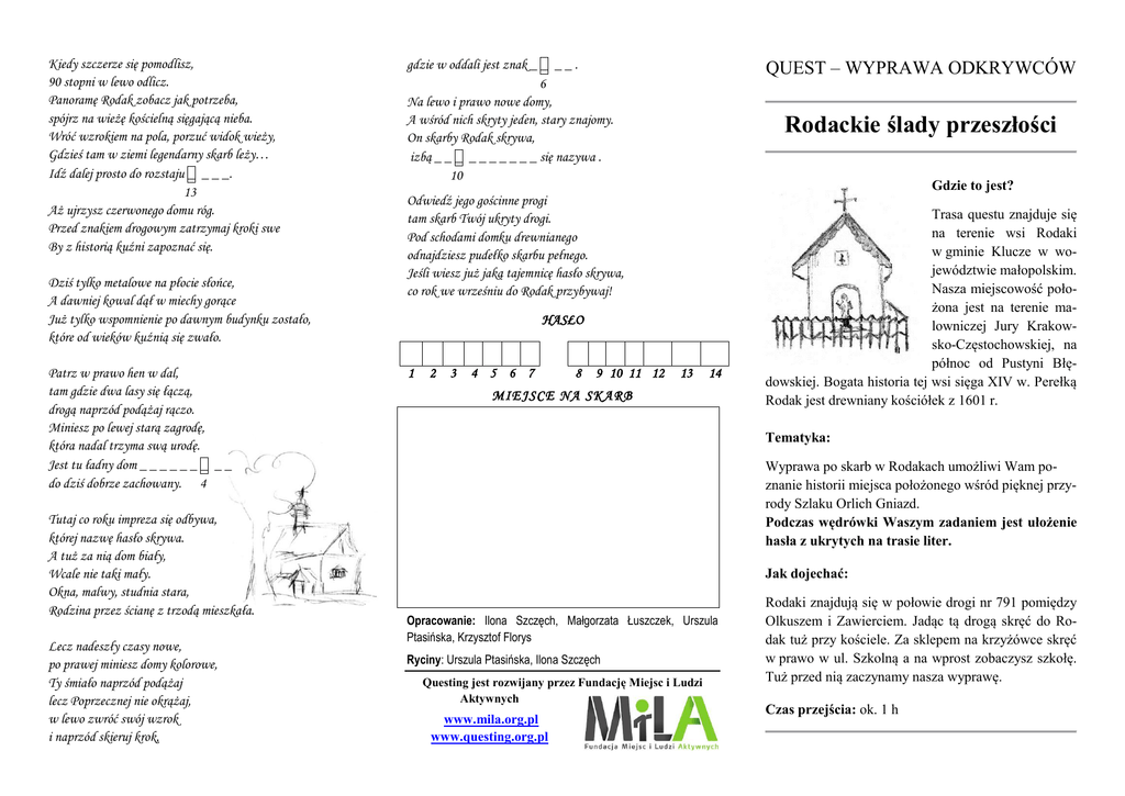 Kiedy szczerze się pomodlisz, 90 stopni w lewo odlicz. Panoramę Rodak zobacz jak potrzeba, spójrz na wieżę kościelną sięgającą nieba. Wróć wzrokiem na pola, porzuć widok wieży, Gdzieś tam w ziemi legendarny skarb leży… Idź dalej prosto do rozstaju _ _ _ _. 13 Aż ujrzysz czerwonego domu róg. Przed znakiem drogowym zatrzymaj kroki swe By z historią kuźni zapoznać się. Dziś tylko metalowe na płocie słońce, A dawniej kowal dął w miechy gorące Już tylko wspomnienie po dawnym budynku zostało, które od wieków kuźnią się zwało. Patrz w prawo hen w dal, tam gdzie dwa lasy się łączą, drogą naprzód podążaj rączo. Miniesz po lewej starą zagrodę, która nadal trzyma swą urodę. Jest tu ładny dom _ _ _ _ _ _ _ _ _ do dziś dobrze zachowany. 4 Tutaj co roku impreza się odbywa, której nazwę hasło skrywa. A tuż za nią dom biały, Wcale nie taki mały. Okna, malwy, studnia stara, Rodzina przez ścianę z trzodą mieszkała. Lecz nadeszły czasy nowe, po prawej miniesz domy kolorowe, Ty śmiało naprzód podążaj lecz Poprzecznej nie okrążaj, w lewo zwróć swój wzrok i naprzód skieruj krok, QUEST – WYPRAWA ODKRYWCÓW gdzie w oddali jest znak _ _ _ _ . 6 Na lewo i prawo nowe domy, A wśród nich skryty jeden, stary znajomy. On skarby Rodak skrywa, izbą _ _ _ _ _ _ _ _ _ _ się nazywa . 10 Rodackie ślady przeszłości Gdzie to jest? Odwiedź jego gościnne progi tam skarb Twój ukryty drogi. Pod schodami domku drewnianego odnajdziesz pudełko skarbu pełnego. Jeśli wiesz już jaką tajemnicę hasło skrywa, co rok we wrześniu do Rodak przybywaj! HASŁO 1 2 3 4 5 6 7 8 9 10 11 12 13 14 MIEJSCE NA SKARB Trasa questu znajduje się na terenie wsi Rodaki w gminie Klucze w województwie małopolskim. Nasza miejscowość położona jest na terenie malowniczej Jury Krakowsko-Częstochowskiej, na północ od Pustyni Błędowskiej. Bogata historia tej wsi sięga XIV w. Perełką Rodak jest drewniany kościółek z 1601 r. Tematyka: Wyprawa po skarb w Rodakach umożliwi Wam poznanie historii miejsca położonego wśród pięknej przyrody Szlaku Orlich Gniazd. Podczas wędrówki Waszym zadaniem jest ułożenie hasła z ukrytych na trasie liter. Jak dojechać: Opracowanie: Ilona Szczęch, Małgorzata Łuszczek, Urszula Ptasińska, Krzysztof Florys Ryciny: Urszula Ptasińska, Ilona Szczęch Questing jest rozwijany przez Fundację Miejsc i Ludzi Aktywnych www.mila.org.pl www.questing.org.pl Rodaki znajdują się w połowie drogi nr 791 pomiędzy Olkuszem i Zawierciem. Jadąc tą drogą skręć do Rodak tuż przy kościele. Za sklepem na krzyżówce skręć w prawo w ul. Szkolną a na wprost zobaczysz szkołę. Tuż przed nią zaczynamy nasza wyprawę. Czas przejścia: ok. 1 h Każde małe dziecko wie, że do szkoły chodzi się, więc my naszą podroż z tego miejsca zacząć chcemy i do skarbu drogę wskazujemy. Przy szkole piękne _ _ _ _ _ _ _ nas witają, 3 14 I na trasę questu wszystkich zapraszają. Gdy wpiszesz już literkę, stań tyłem do szkoły, a teraz w prawą stronę podążaj wesoły. Na wysokim drzewie znajdź gniazdo bocianie, Tam latem ptasia rodzina ćwiczy klekotanie. Idź dalej przed siebie, szukaj muru z kamienia. Za nim w starej zagrodzie czeka czar wspomnienia. To domek pięknymi malwami obsadzany. Pierwszy na trasie budynek drewniany. Mijasz chatę drewnianą po sąsiedzku z kościółkiem zbudowaną. Jeszcze tylko kilka kroków i już widzisz krzyż z boku. Wejdź śmiało na placyk mały, Tam kiedyś kurczaki gdakały. Zobaczysz tu inne ciekawe przeszłości ślady: korbową studnię skąd wodę czerpały nasze dziady, oborę z kamienia murowaną, gdzie krówki trzymano, a pachnące sianko dla nich w _ _ _ _ _ _ _ składano. 12 7 Gdy wyjdziesz z zagrody w lewo się kieruj, a później główną drogą do przystanku steruj. Za nim idź prosto, rondo i kapliczkę mijając, dojdziesz do świątyni na samochody zważając! Przeczytaj, z którego jest roku, wytęż wzrok jak sokół, aż zobaczysz cokół. Na nim fundator jest zapisany, Jego nazwisko wpisz, kochany. (_ _ _ _ _ _ ) 11 Przed nami kościół otwiera swe wrota, to siedemnastowieczna robota. Nad kościołem wieżyczka góruje, Święty Marek jej patronuje. Frontem do drogi kapliczka się uśmiecha cenna dla mieszkańców, na turystów czeka. Nad nią na nas dwa okienka zerkają, Wpisz po ile szybek mają? (_ _ _ _ _ _ ) 2 Za lipą się chowa drewniana dzwonnica, jej dostojność turystów zachwyca. A przed lipą tablica stoi, Zapiszcie mili moi „_ _ _ _ _ architektury drewnianej”. 4 Wychodząc z kościoła mijasz bramę i wszystkie tuje kłaniają się same. Teraz asfaltem w dół idziemy, tam się właśnie kierujemy. Z krzyżem się żegnamy, prawą ręką mu machamy i w tę stronę wyruszamy. Teraz 300 kroków zrobisz, wcale się więc nie nachodzisz. Przed Tobą przydrożna kapliczka murowana, Przy której Rodaczanie modlili się nie tylko z rana. W południe, gdy z pól schodzili, na _ _ _ _ _ Pański też się gromadzili. 1 Podążaj dalej aż do rozstaju dróg. Gdy miniesz piąty drewniany slup, wśród kasztanowców strzelających wzwyż, zobaczysz betonowy _ _ _ _ _ 5 8 Inicjały swe dawny sołtys wyrył tam, By pamięć po sobie pozostawić nam.