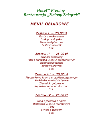 Hotel** Pieniny Restauracja „Zielony Zakątek” MENU OBIA DO W E Zestaw I -- 25,00 zł Rosół z makaronem Stek po chłopsku Ziemniaki pieczone Zestaw surówek Sok Zestaw II -- 25,00 zł Krupnik zabielany Filet z kurczaka w sosie pieczarkowym Ziemniaki pieczone Zestaw surówek Sok Zestaw II I -- 25,00 zł Pieczarkowa krem z groszkiem ptysiowym Karkówka w miodzie i piwie Ziemniaki gotowane Kapusta czerwona duszona Sok Zestaw IV -- 25,00 zł Zupa ogórkowa z ryżem Wołowina w sosie morelowym Pyzy Ćwikła z jabłkiem Sok Zestaw V -- 25,00 zł Zupa pietruszkowa z grzankami Schab z brzoskwinią Ziemniaki puree Sałata lodowa z sosem vinegrette Sok Zestaw V I-- 25,00 zł Żurek z jajkiem i kiełbasą Schab ze śliwkami Ziemniaki purre Zestaw surówek Sok Zestaw VII - 25,00 zł Barszcz z krokietem Filet z kurczaka w parmezanie Frytki Zestaw surówek Sok Zestaw VII I -- 26,00 zł Pomidorowa czysta z grzanką Stek po chłopsku Ziemniaki pieczone Fasolka zielona z masłem i bułeczką Rolada z masą czekoladową Sok Wino czerwone Zestaw IX -- 28,00 zł Cebulowa z grzanką Roladki zbójnickie Ziemniaki pieczone Sałata lodowa z majonezem Szarlotka Sok Wino czerwone Zestaw X -- 27,50 zł Zupa krem z brokułów z łososiem Karkówka w miodzie i piwie Ziemniaki gotowane Kapusta czerwona zasmażana Lody z owocami i bitą śmietaną Sok Wino czerwone Zestaw XI - 26,50 zł Czosnkowa krem z żółtkiem Sznycel wieprzowy z mozarellą i suszonymi pomidorami Ziemniaki opiekane Surówka z marchewki i jabłka Surówka z selera z rodzynkami Sok Wino czerwone