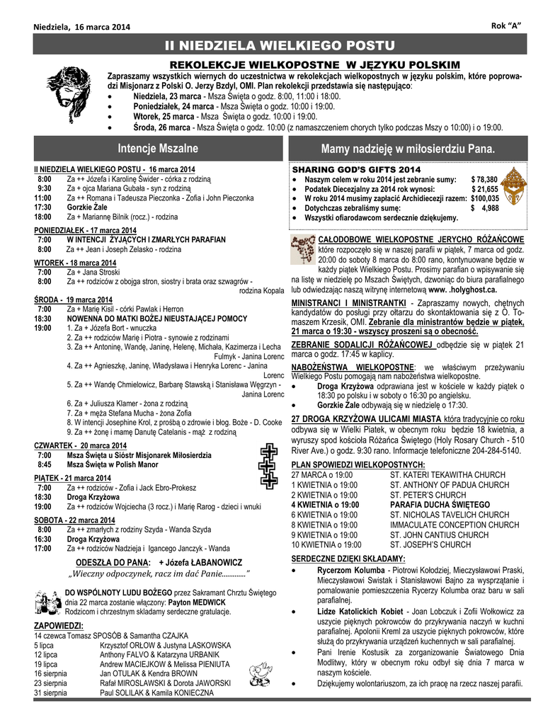 Rok “A” Niedziela, 16 marca 2014 II NIEDZIELA WIELKIEGO POSTU REKOLEKCJE WIELKOPOSTNE W JĘZYKU POLSKIM Zapraszamy wszystkich wiernych do uczestnictwa w rekolekcjach wielkopostnych w języku polskim, które poprowadzi Misjonarz z Polski O. Jerzy Bzdyl, OMI. Plan rekolekcji przedstawia się następująco: Niedziela, 23 marca - Msza Święta o godz. 8:00, 11:00 i 18:00. Poniedziałek, 24 marca - Msza Święta o godz. 10:00 i 19:00. Wtorek, 25 marca - Msza Święta o godz. 10:00 i 19:00. Środa, 26 marca - Msza Święta o godz. 10:00 (z namaszczeniem chorych tylko podczas Mszy o 10:00) i o 19:00. Intencje Mszalne II NIEDZIELA WIELKIEGO POSTU - 16 marca 2014 8:00 Za ++ Józefa i Karolinę Świder - córka z rodziną 9:30 Za + ojca Mariana Gubała - syn z rodziną 11:00 Za ++ Romana i Tadeusza Pieczonka - Zofia i John Pieczonka 17:30 Gorzkie Żale 18:00 Za + Mariannę Bilnik (rocz.) - rodzina Mamy nadzieję w miłosierdziu Pana. SHARING GOD’S GIFTS 2014 Naszym celem w roku 2014 jest zebranie sumy: Podatek Diecezjalny za 2014 rok wynosi: W roku 2014 musimy zapłacić Archidiecezji razem: Dotychczas zebraliśmy sumę: Wszystki ofiarodawcom serdecznie dziękujemy. $ 78,380 $ 21,655 $100,035 $ 4,988 PONIEDZIAŁEK - 17 marca 2014 7:00 W INTENCJI ŻYJĄCYCH I ZMARŁYCH PARAFIAN 8:00 Za ++ Jean i Joseph Zelasko - rodzina CAŁODOBOWE WIELKOPOSTNE JERYCHO RÓŻAŃCOWE które rozpoczęło się w naszej parafii w piątek, 7 marca od godz. 20:00 do soboty 8 marca do 8:00 rano, kontynuowane będzie w WTOREK - 18 marca 2014 każdy piątek Wielkiego Postu. Prosimy parafian o wpisywanie się 7:00 Za + Jana Stroski na listę w niedzielę po Mszach Świętych, dzwoniąc do biura parafialnego 8:00 Za ++ rodziców z obojga stron, siostry i brata oraz szwagrów rodzina Kopala lub odwiedzając naszą witrynę internetową www. .holyghost.ca. ŚRODA 7:00 18:30 19:00 19 marca 2014 Za + Marię Kisil - córki Pawlak i Herron NOWENNA DO MATKI BOŻEJ NIEUSTAJĄCEJ POMOCY 1. Za + Józefa Bort - wnuczka 2. Za ++ rodziców Marię i Piotra - synowie z rodzinami 3. Za ++ Antoninę, Wandę, Janinę, Helenę, Michała, Kazimerza i Lecha Fulmyk - Janina Lorenc 4. Za ++ Agnieszkę, Janinę, Władysława i Henryka Lorenc - Janina Lorenc 5. Za ++ Wandę Chmielowicz, Barbarę Stawską i Stanisława Węgrzyn Janina Lorenc 6. Za + Juliusza Klamer - żona z rodziną 7. Za + męża Stefana Mucha - żona Zofia 8. W intencji Josephine Krol, z prośbą o zdrowie i błog. Boże - D. Cooke 9. Za ++ żonę i mamę Danutę Catelanis - mąż z rodziną CZWARTEK - 20 marca 2014 7:00 Msza Święta u Sióstr Misjonarek Miłosierdzia 8:45 Msza Święta w Polish Manor PIĄTEK - 21 marca 2014 7:00 Za ++ rodziców - Zofia i Jack Ebro-Prokesz 18:30 Droga Krzyżowa 19:00 Za ++ rodziców Wojciecha (3 rocz.) i Marię Rarog - dzieci i wnuki SOBOTA - 22 marca 2014 8:00 Za ++ zmarłych z rodziny Szyda - Wanda Szyda 16:30 Droga Krzyżowa 17:00 Za ++ rodziców Nadzieja i Igancego Janczyk - Wanda ODESZŁA DO PANA: + Józefa ŁABANOWICZ „Wieczny odpoczynek, racz im dać Panie.............” DO WSPÓLNOTY LUDU BOŻEGO przez Sakramant Chrztu Świętego dnia 22 marca zostanie włączony: Payton MEDWICK Rodzicom i chrzestnym skladamy serdeczne gratulacje. ZAPOWIEDZI: 14 czewca Tomasz SPOSÓB & Samantha CZAJKA 5 lipca Krzysztof ORŁOW & Justyna LASKOWSKA 12 lipca Anthony FALVO & Katarzyna URBANIK 19 lipca Andrew MACIEJKOW & Melissa PIENIUTA 16 sierpnia Jan OTULAK & Kendra BROWN 23 sierpnia Rafał MIROSLAWSKI & Dorota JAWORSKI 31 sierpnia Paul SOLILAK & Kamila KONIECZNA MINISTRANCI I MINISTRANTKI - Zapraszamy nowych, chętnych kandydatów do posługi przy ołtarzu do skontaktowania się z O. Tomaszem Krzesik, OMI. Zebranie dla ministrantów będzie w piątek, 21 marca o 19:30 - wszyscy proszeni są o obecność. ZEBRANIE SODALICJI RÓŻAŃCOWEJ odbędzie się w piątek 21 marca o godz. 17:45 w kaplicy. NABOŻEŃSTWA WIELKOPOSTNE: we właściwym przeżywaniu Wielkiego Postu pomogają nam nabożeństwa wielkopostne. Droga Krzyżowa odprawiana jest w kościele w każdy piątek o 18:30 po polsku i w soboty o 16:30 po angielsku. Gorzkie Żale odbywają się w niedzielę o 17:30. 27 DROGA KRZYŻOWA ULICAMI MIASTA która tradycyjnie co roku odbywa się w Wielki Piatek, w obecnym roku będzie 18 kwietnia, a wyruszy spod kościoła Różańca Świętego (Holy Rosary Church - 510 River Ave.) o godz. 9:30 rano. Informacje telefoniczne 204-284-5140. PLAN SPOWIEDZI WIELKOPOSTNYCH: 27 MARCA o 19:00 ST. KATERI TEKAWITHA CHURCH 1 KWIETNIA o 19:00 ST. ANTHONY OF PADUA CHURCH 2 KWIETNIA o 19:00 ST. PETER’S CHURCH 4 KWIETNIA o 19:00 PARAFIA DUCHA ŚWIĘTEGO 6 KWIETNIA o 19:00 ST. NICHOLAS TAVELICH CHURCH 8 KWIETNIA o 19:00 IMMACULATE CONCEPTION CHURCH 9 KWIETNIA o 19:00 ST. JOHN CANTIUS CHURCH 10 KWIETNIA o 19:00 ST. JOSEPH’S CHURCH SERDECZNE DZIĘKI SKŁADAMY: Rycerzom Kolumba - Piotrowi Kołodziej, Mieczysławowi Praski, Mieczysławowi Swistak i Stanisławowi Bajno za wysprzątanie i pomalowanie pomieszczenia Rycerzy Kolumba oraz baru w sali parafialnej. Lidze Katolickich Kobiet - Joan Lobczuk i Zofii Wołkowicz za uszycie pięknych pokrowców do przykrywania naczyń w kuchni parafialnej. Apolonii Kreml za uszycie pięknych pokrowców, które służą do przykrywania urządzeń kuchennych w sali parafialnej. Pani Irenie Kostusik za zorganizowanie Światowego Dnia Modlitwy, który w obecnym roku odbył się dnia 7 marca w naszym kościele. Dziękujemy wolontariuszom, za ich pracę na rzecz naszej parafii. Niedziela, 23 marca 2014 Rok “A” III NIEDZIELA WIELKIEGO POSTU REKOLEKCJE WIELKOPOSTNE W JĘZYKU ANGIELSKIM Zapraszamy wszystkich do uczestnictwa w rekolekcjach wielkopostnych, które przygotują nas do obchodów Triduum Paschalnego i Świąt Zmartwychwstania Pańskiego. Bardzo serdecznie witamy w naszej wspólnocie Fr. Msgr. D. Ward Jamieson, który w obecnym roku poprowadzi rekolekcje. Wielu z nas pamięta Msgr. Jamieson, który pomagał w naszej parafii w 1990 r. 