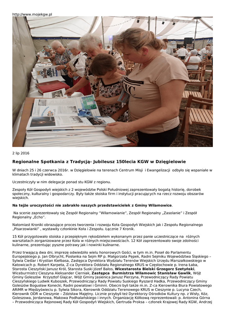 http://www.mojekgw.pl 2 lip 2016 Regionalne Spotkania z Tradycją- Jubileusz 150lecia KGW w Dzięgielowie W dniach 25 i 26 czerwca 2016r. w Dzięgielowie na terenach Centrum Misji i Ewangelizacji odbyło się wspaniałe w klimatach tradycji widowisko. Uczestniczyły w nim delegacje ponad stu KGW z regionu. Zespoły Kół Gospodyń wiejskich z 2 województw Polski Południowej zaprezentowały bogatą historię, dorobek społeczny, kulturalny i gospodarczy. Były także stoiska firm i instytucji pracujących na rzecz rozwoju obszarów wiejskich. Na tejże uroczystości nie zabrakło naszych przedstawicielek z Gminy Wilamowice. Na scenie zaprezentowały się Zespół Regionalny ”Wilamowianie”, Zespół Regionalny „Zasolanie” i Zespół Regionalny „Echo”. Natomiast Kroniki obrazujące proces tworzenia i rozwoju Koła Gospodyń Wiejskich jak i Zespołu Regionalnego „Pisarzowianki” , wystawiły członkinie Koła i Zespołu. Łącznie 7 Kronik. 15 Kół przygotowało stoiska z przepięknym rękodziełem wykonanym przez panie uczestniczące na różnych warsztatach zorganizowane przez Koła w różnych miejscowościach. 12 Kół zaprezentowało swoje zdolności kulinarne, prezentując pyszne potrawy jak i nowinki kulinarne. Przez trwającą dwa dni, imprezę odwiedziło wielu honorowych Gości, w tym m.in. Poseł do Parlamentu Europejskiego p. Jan Olbrycht, Posłanka na Sejm RP p. Małgorzata Pępek, Radni Sejmiku Województwa Śląskiego – Sylwia Cieślar i Krystian Kiełbasa, Zastępca Dyrektora Wydziału Terenów Wiejskich Urzędu Marszałkowskiego w Katowicach p. Robert Karpeta, Z-ca Dyrektora Oddziału Regionalnego KRUS w Częstochowie p. Irena Łaba, Starosta Cieszyński Janusz Król, Starosta Suski Józef Bałos, Wicestarosta Bielski Grzegorz Szetyński, Wiceburmistrz Cieszyna Aleksander Cierniak, Zastępca Burmistrza Wilamowic Stanisław Gawlik, Wójt Gminy Goleszów Krzysztof Glajcar, Wójt Gminy Jasienica Janusz Pierzyna, Przewodniczący Rady Powiatu Cieszyńskiego Ludwik Kuboszek, Przewodniczący Rady Powiatu Suskiego Ryszard Hadka, Przewodniczący Gminy Goleszów Bogusław Konecki, Radni powiatowi i Gminni. Obecni byli także m.in. Z-ca Kierownika Biura Powiatowego ARiMR w Międzyświeciu p. Sylwia Sikora, Kierownik Oddziału Terenowego KRUS w Cieszynie p. Lucyna Czech, Kierownik ODR w Cieszynie – Zdzisław Majętny. Licznie przybyli też Dyrektorzy Ośrodków Kultury np. z Wisły, Kóz, Goleszowa, Jordanowa, Makowa Podhalańskiego i innych. Organizację Kółkową reprezentowali: p. Antonina Górna – Przewodnicząca Rejonowej Rady Kół Gospodyń Wiejskich, Gertruda Proksa – członek Krajowej Rady KGW, Andrzej Wrona – Członek Zarządu Krajowego Związku RKiOR, Waldemar Pieczara – Przewodniczący Rady Rejonowego Związku Rolników, Kółek i Organizacji Rolniczych w Bielsku-Białej, Edward Korczyk – Honorowy Przewodniczący Rady RZRKiOR, Zofia Dwornik – Honorowy Członek Rady, Stanisława Kasperczyk i Agnieszka Szczotka – członkinie Prezydium Rady RZRKiOR oraz Danuta Kożusznik – Prezes Zarządu RZRKiOR i Jadwiga Gębala – W-ce Prezes Zarządu RZRKiOR. Organizatorami Jubileuszu byli: Rejonowy Związek Rolników, Kółek i Organizacji Rolniczych w Bielsku-Białej, Województwo Śląskie, Gmina Goleszów, Centrum Misji i Ewangelizacji w Dzięgielowie, KGW Dzięgielów na czele z Przewodniczącą Panią Gertrudą Proksa, Stowarzyszenie Miłośników Dzięgielowa, Ochotnicze Straże Pożarne, Rada Sołecka, Szkoła Podstawowa w Dzięgielowie, Śląski Ośrodek Doradztwa Rolniczego Patronat honorowy objęli: Wicemarszałek Województwa Śląskiego- Pan Stanisław Dąbrowa Przewodnicząca Rejonowej Rady Kół Gospodyń Wiejskich- Pani Antonina Górna Starosta Cieszyński- Pan Janusz Król Wójt Gminy Goleszów- Pan Krzysztof Glajcar Patronat medialny pełniły: TVS, MojeKGW.pl, CCM, Radio Fest, Radio Bielsko, Kurier Radia Bielsko, Kronika Beskidzka, Beskidzka24.pl, Głos Ziemi Cieszyńskiej, Portal Internetowy OX, Panorama Goleszowska, Halo Cieszyn.pl, Głos Ludu. Całej imprezie towarzyszyła wspaniała atmosfera i dobra zabawa łącznie ze wspólnym śpiewem i tańcami nie tylko na scenie. Na zakończenie każdy zespół otrzymał pamiątkowy dyplom, jubileuszową statuetkę, książkę obrazującą historię KGW w Polsce i na Podbeskidziu oraz upominki i gorące podziękowania za udział w przeglądzie. Wszystkie te upominki pozostaną trwałą pamiątką tegoż Przeglądu Zespołów KGW jak i wspaniałego Jubileuszu 150-lecia KGW w Dzięgielowie. Wszystkim organizatorom należą się słowa uznania za trud pracy włożony, by ta wspaniała uroczystość mogła odbyć się z naszym udziałem. Przewodnicząca KGW Pisarzowice C.Puzoń Cecylia P. z Koło Gospodyń Wiejskich Pisarzowice