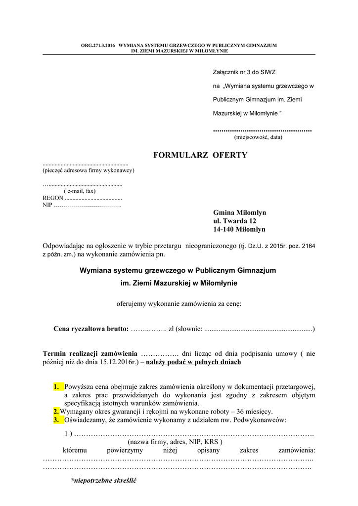 ORG.271.3.2016 WYMIANA SYSTEMU GRZEWCZEGO W PUBLICZNYM GIMNAZJUM IM. ZIEMI MAZURSKIEJ W MIŁOMŁYNIE Załącznik nr 3 do SIWZ na „Wymiana systemu grzewczego w Publicznym Gimnazjum im. Ziemi Mazurskiej w Miłomłynie ” ............................................... (miejscowość, data) FORMULARZ OFERTY ......................................................... (pieczęć adresowa firmy wykonawcy) …................................................. ( e-mail, fax) REGON ...................................... NIP ……………………………. Gmina Miłomłyn ul. Twarda 12 14-140 Miłomlyn Odpowiadając na ogłoszenie w trybie przetargu nieograniczonego (tj. Dz.U. z 2015r. poz. 2164 z późn. zm.) na wykonanie zamówienia pn. Wymiana systemu grzewczego w Publicznym Gimnazjum im. Ziemi Mazurskiej w Miłomłynie oferujemy wykonanie zamówienia za cenę: Cena ryczałtowa brutto: ……..…….. zł (słownie: ............................................................) Termin realizacji zamówienia ……………. dni licząc od dnia podpisania umowy ( nie później niż do dnia 15.12.2016r.) – należy podać w pełnych dniach 1. Powyższa cena obejmuje zakres zamówienia określony w dokumentacji przetargowej, a zakres prac przewidzianych do wykonania jest zgodny z zakresem objętym specyfikacją istotnych warunków zamówienia. 2. Wymagany okres gwarancji i rękojmi na wykonane roboty – 36 miesięcy. 3. Oświadczamy, że zamówienie wykonamy z udziałem nw. Podwykonawców: 1 ) ………………………………………………………………………………………. (nazwa firmy, adres, NIP, KRS ) któremu powierzymy niżej opisany zakres zamówienia: ………………………………………………………………………………………………….. …………………………………………………………………………………………………. *niepotrzebne skreślić ORG.271.3.2016 WYMIANA SYSTEMU GRZEWCZEGO W PUBLICZNYM GIMNAZJUM IM. ZIEMI MAZURSKIEJ W MIŁOMŁYNIE 4. Oświadczamy, że zapoznaliśmy się ze specyfikacją istotnych warunków zamówienia i nie wnosimy do niej zastrzeżeń oraz zdobyliśmy konieczne informacje, potrzebne do właściwego wykonania zamówienia. 5. Oświadczamy, że uważamy się za związanych niniejszą ofertą na czas wskazany w specyfikacji istotnych warunków zamówienia, tj. 30 dni, licząc od upływu składania ofert. 6. Oświadczamy, że zawarty w specyfikacji istotnych warunków zamówienia wzór umowy został przez nas zaakceptowany i zobowiązujemy się w przypadku wybrania naszej oferty do zawarcia umowy na wymienionych w nim warunkach , w miejscu i terminie wyznaczonym przez zamawiającego. 7. Akceptujemy termin płatności określony w warunkach umowy. 8. Upoważniamy Zamawiającego do przeprowadzenia wszelkich badań mających na celu sprawdzenie oświadczeń, dokumentów i przedłożonych informacji oraz do wyjaśnienia finansowych i technicznych aspektów tego zgłoszenia. Dla tych celów upoważniamy każdą osobę fizyczną oraz prawną lub inną jednostkę organizacyjną, a także każdy podmiot prawa publicznego, w szczególności wymienione w naszym "FORMULARZU OFERTOWYM" do dostarczenia stosownej informacji uznanej przez Zamawiającego za konieczną i wymaganą w celu sprawdzenia oświadczeń i informacji zawartych w naszej ofercie. 9. Oświadczamy, że oferta nie zawiera/ zawiera* informacji stanowiących tajemnicę przedsiębiorstwa w rozumieniu przepisów o zwalczaniu nieuczciwej konkurencji. Informacje takie zawarte są w następujących dokumentach (podać str.): ….................................................................................................................. 10. Wadium w kwocie 6.000,00zł ( sześć tysięcy złotych) zostało wniesione w formie ………………………....................................................................................................... 11. Nasze dane (zarejestrowana nazwa i adres Wykonawcy z tel., fax-em, e-mail, NIP, Regon, …..................................................................................................................................... .............................................................................................................................................. 12. Integralną częścią oferty są załączniki: ................................................................................................................................................ ................................................................................................................................................ ................................................................................................................................................ .................................................... pieczęć firmowa *niepotrzebne skreślić ............................................................................. ( data, podpisy i pieczęcie osób uprawnionych do reprezentowania wykonawcy w obrocie prawnym )