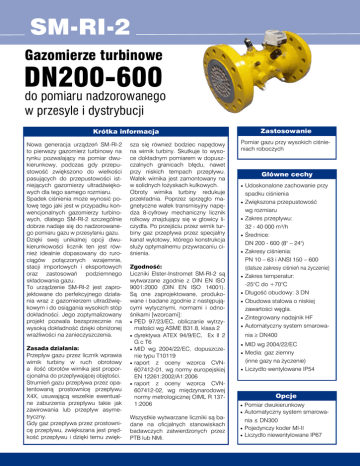 SM-RI-2 Gazomierze turbinowe DN200-600 do pomiaru nadzorowanego w przesyle i dystrybucji Zastosowanie Krótka informacja Nowa generacja urządzeń SM-RI-2 to pierwszy gazomierz turbinowy na rynku pozwalający na pomiar dwukierunkowy, podczas gdy przepustowość zwiększono do wielkości pasujących do przepustowości istniejących gazomierzy ultradźwiękowych dla tego samego rozmiaru. Spadek ciśnienia może wynosić połowę tego jaki jest w przypadku konwencjonalnych gazomierzy turbinowych, dlatego SM-RI-2 szczególnie dobrze nadaje się do nadzorowanego pomiaru gazu w przesyłaniu gazu. Dzięki swej unikalnej opcji dwukierunkowości licznik ten jest również idealnie dopasowany do rurociągów połączonych wzajemnie, stacji importowych i eksportowych oraz zastosowań podziemnego składowania gazu. To urządzenie SM-RI-2 jest zaprojektowane do perfekcyjnego działania wraz z gazomierzem ultradźwiękowym i do osiągania wysokich stóp dokładności. Jego zoptymalizowany projekt pozwala bezsprzecznie na wysoką dokładność dzięki obniżonej wrażliwości na zanieczyszczenia. Zasada działania: Przepływ gazu przez licznik wprawia wirnik turbiny w ruch obrotowy a ilość obrotów wirnika jest proporcjonalna do przepływającej objętości. Strumień gazu przepływa przez opatentowaną prostownicę przepływu X4X, usuwającą wszelkie ewentualne zaburzenia przepływu takie jak zawirowania lub przepływ asymetryczny. Gdy gaz przepływa przez prostownicę przepływu, zwiększana jest prędkość przepływu i dzięki temu zwięk- sza się również bodziec napędowy na wirnik turbiny. Skutkuje to wysoce dokładnym pomiarem w dopuszczalnych granicach błędu, nawet przy niskich tempach przepływu. Wałek wirnika jest zamontowany na w solidnych łożyskach kulkowych. Obroty wirnika turbiny redukuje przekładnia. Poprzez sprzęgło magnetyczne wałek transmisyjny napędza 8-cyfrowy mechaniczny licznik rolkowy znajdujący się w głowicy liczydła. Po przejściu przez wirnik turbiny gaz przepływa przez specjalny kanał wylotowy, którego konstrukcja służy optymalnemu przywracaniu ciśnienia. Zgodność: Liczniki Elster-Instromet SM-RI-2 są wytwarzane zgodnie z DIN EN ISO 9001:2000 (DIN EN ISO 14001). Są one zaprojektowane, produkowane i badane zgodnie z następującymi wytycznymi, normami i odnośnikami [wzorcami]: PED 97/23/EC, obliczanie wytrzymałości wg ASME B31.8, klasa 2 dyrektywa ATEX 94/9/EC, Ex II 2 G c T6 MID wg 2004/22/EC, dopuszczenie typu T10119 raport z oceny wzorca CVN607412-01, wg normy europejskiej EN 12261:2002/A1:2006 raport z oceny wzorca CVN607412-02, wg międzynarodowej normy metrologicznej OIML R 1371:2006 Wszystkie wytwarzane liczniki są badane na oficjalnych stanowiskach badawczych zatwierdzonych przez PTB lub NMi. Pomiar gazu przy wysokich ciśnieniach roboczych Główne cechy Udoskonalone zachowanie przy spadku ciśnienia Zwiększona przepustowość wg rozmiaru Zakres przepływu: 32 - 40 000 m³/h Średnice: DN 200 - 600 (8" – 24") Zakresy ciśnienia: PN 10 – 63 i ANSI 150 – 600 (dalsze zakresy ciśnień na życzenie) Zakres temperatur: -25°C do +70°C Długość obudowy: 3 DN Obudowa stalowa o niskiej zawartości węgla. Zintegrowany nadajnik HF Automatyczny system smarowania DN400 MID wg 2004/22/EC Media: gaz ziemny (inne gazy na życzenie) Liczydło wentylowane IP54 Opcje Pomiar dwukierunkowy Automatyczny system smarowa- nia ≤ DN300 Pojedynczy koder MI-II Liczydło niewentylowane IP67 Liczydło Liczydło wielofunkcyjne Multi-Index: Solidne i wentylowane metalowe liczydło o klasie ochronności IP54. Standardowo wyposażone w zewnętrzny zestyk hermetyczny IN– S11 (wtyk Binder) obejmujący ochronę przed manipulacją. Podwójne liczydło standardowe dla wersji dwu-kierunkowej. Opcje: podwójny czujnik MF (osobny wtyk Binder) napęd mechaniczny 25H7 wg EN 12261, klasa ochronności IP54 wersja nie-wentylowana o klasie ochronności IP67 (w połączeniu z filtrem pochłaniającym wilgoć) Liczydło wielofunk. 2 z napędem mechanicznym Liczydło wielofunk. 2 bez napędu mechanicznego Metrologia Dokładność, metrologia: Wielkość 200 - lekka konstrukcja Wielkość 00 - lekka konstrukcja powietrze atm 20 barg gaz ziemny powietrze atm 20 barg gaz ziemny 8 barg gaz ziemny 50 barg gaz ziemny 2 Błąd wskazania [%] Typowe granice błędów wg OIML R137-1:2006 (klasa 1) oraz MID 2004/22/EC (klasa 1): 2 Błąd wskazania [%] Gazomierze turbinowe SM-RI-2 w swym zachowaniu metrologicznym spełniają specyfikacje międzynarodowe normy dla gazomierzy turbinowych. 1 0 -1 -2 ± 2,0% dla Qmin do Qt ± 1,0% dla Qt do Qmax 0 320 640 960 1280 Q 1 0 -1 -2 1600 0 powietrze atm 20 barg gaz ziemny 0 -1 0 800 1600 2400 3200 Qmax 3900 5200 6500 Wielkość 00 - FLÚĝND konstrukcja 8 barg gaz ziemny 50 barg gaz ziemny 1 -2 2600 Q [m3/h] powietrze atm 20 barg gaz ziemny 2 Błąd wskazania [%] Błąd wskazania [%] 2 1300 [m3/h] Wielkość 200 - FLÚĝND konstrukcja Mniejsze granice na życzenie. 8 barg gaz ziemny 50 barg gaz ziemny 1 0 -1 -2 4000 8 barg gaz ziemny 50 barg gaz ziemny 0 3200 6400 9600 12800 16000 Qmax [m3/h] [m3/h] Spadek ciśnienia: Standard 16 14 12 10 8 6 4 2 0 0 SM-RI-2 Bidi Standard SM-RI-2 Mono SM-RI-2 Bidi SM-RI-2 Mono 16 Błąd wskazania [%] Poszczególne wartości spadku ciśnienia podane są w zestawieniu (str. 3). Wielkość 400 Wielkość 200 Błąd wskazania [%] Średnia utrata ciśnienia gazomierza turbinowego SM-RI-2 przy użyciu powietrza i gazu ziemnego o gęstości 0,8 jest mierzona na 1 x DN przed licznikiem do 1 x DN za licznikiem na prostej rurze tego samego rozmiaru co licznik. 1000 1600 2500 4000 Q [m3/h] 14 12 10 8 6 4 2 0 0 4000 6500 10000 16000 Q [m3/h] Zakres pomiarowy wysokiego ciśnienia Charakterystyka błędów Każdy licznik SM-RI-2 jest badany powietrzem atmosferycznym w stosunku do identyfikowalnych kalibrowanych wzorców. Opcjonalnie liczniki można kalibrować powietrzem lub gazem ziemnym na urządzeniach testowych identyf