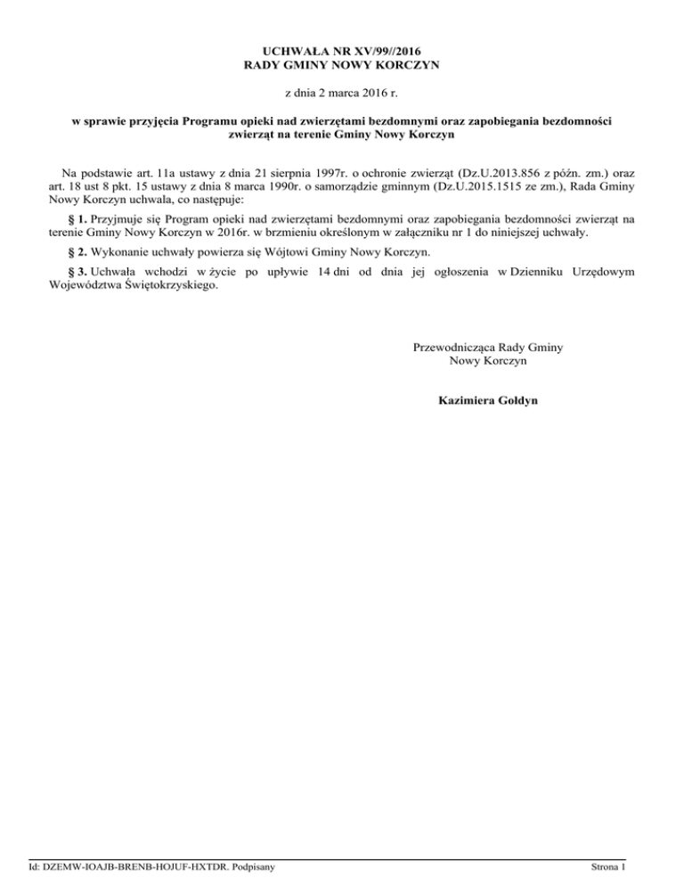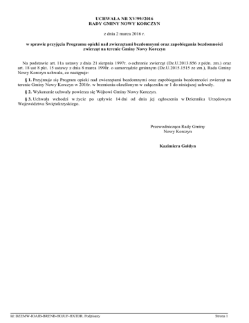 UCHWAŁA NR XV/99//2016 RADY GMINY NOWY KORCZYN z dnia 2 marca 2016 r. w sprawie przyjęcia Programu opieki nad zwierzętami bezdomnymi oraz zapobiegania bezdomności zwierząt na terenie Gminy Nowy Korczyn Na podstawie art. 11a ustawy z dnia 21 sierpnia 1997r. o ochronie zwierząt (Dz.U.2013.856 z późn. zm.) oraz art. 18 ust 8 pkt. 15 ustawy z dnia 8 marca 1990r. o samorządzie gminnym (Dz.U.2015.1515 ze zm.), Rada Gminy Nowy Korczyn uchwala, co następuje: § 1. Przyjmuje się Program opieki nad zwierzętami bezdomnymi oraz zapobiegania bezdomności zwierząt na terenie Gminy Nowy Korczyn w 2016r. w brzmieniu określonym w załączniku nr 1 do niniejszej uchwały. § 2. Wykonanie uchwały powierza się Wójtowi Gminy Nowy Korczyn. § 3. Uchwała wchodzi w życie po upływie 14 dni od dnia jej ogłoszenia w Dzienniku Urzędowym Województwa Świętokrzyskiego. Przewodnicząca Rady Gminy Nowy Korczyn Kazimiera Gołdyn Id: DZEMW-IOAJB-BRENB-HOJUF-HXTDR. Podpisany Strona 1 Uzasadnienie Zgodnie z art.11a ustawy o ochronie zwierząt z dnia 21 sierpnia 1997r. (Dz.U.2013.856) Rada Gminy zobowiązana jest do przyjęcia w drodze uchwały corocznie do 31 marca Programu opieki nad zwierzętami bezdomnymi oraz zapobiegania bezdomności zwierząt. W związku z powyższym został opracowany Program opieki nad zwierzętami bezdomnymi oraz zapobiegania bezdomności zwierząt na terenie Gminy Nowy Korczyn, który stanowi załącznik do niniejszej uchwały. Projekt Programu został pozytywnie zaopiniowany przez Powiatowego Lekarza Weterynarii w Busku- Zdroju oraz przez zarządców obwodów łowieckich działających na terenie Gminy Nowy Korczyn. Id: DZEMW-IOAJB-BRENB-HOJUF-HXTDR. Podpisany Strona 1 Załącznik do uchwały nr XV/99/2016 Rady Gminy Nowy Korczyn z dnia 2 marca 2016 r. Program opieki nad zwierzętami bezdomnymi oraz zapobiegania bezdomności zwierząt na terenie Gminy Nowy Korczyn Rozdział I CEL PROGRAMU Podstawa prawna do działań Gminy: Ustawa z dn. 8.03.1990r. o samorządzie gminnym (Dz.U. z 2015r,poz.1515 z późn. zm.) Ustawa z dn. 21.08.1997 r. o ochronie zwierząt (Dz.U. z 2013r., poz. 856) Rozporządzenia Ministra Spraw Wewnętrznych i Administracji z dn.26.08.1998 r. w sprawie zasad i warunków wyłapywania bezdomnych zwierząt (Dz. U. Nr 116, poz. 753) Rozporządzenia Ministra Rolnictwa i Rozwoju Wsi z dn. 04.01.2008 r. w sprawie szczegółowych wymagań weterynaryjnych dla prowadzenia działalności w zakresie organizowania targów, wystaw, pokazów lub konkursów zwierząt. (Dz.U. z 2008 Nr 11, poz.67 ) Ustawa z dn. 13.09.1996 r. o utrzymaniu czystości i porządku w gminach (Dz.U. z 2016r poz. 250 z późń. zm ) §1 Celem Programu jest zapobieganie bezdomności zwierząt na terenie Gminy Nowy Korczyn oraz opieka nad zwierzętami bezdomnymi. Zadanie to będzie realizowane poprzez: 1. Zapewnienie bezdomnym zwierzętom opieki 2. Zmniejszenie populacji bezdomnych zwierząt 3. Zwiększenie liczby adopcji zwierząt bezdomnych 4. Edukację mieszkańców na temat humanitarnego traktowania zwierząt i obowiązków spoczywających na właścicielach psów i kotów, 5. Promowanie prawidłowych postaw i zachowań człowieka w stosunku do zwierząt. Rozdział II REALIZACJA ZADAŃ Id: DZEMW-IOAJB-BRENB-HOJUF-HXTDR. Podpisany Strona 1 §2 Zapewnienie opieki bezdomnym zwierzętom z terenu Gminy Nowy Korczyn realizują: 1. Schronisko poprzez wyłapanie oraz przyjmowanie zwierząt bezdomnych dostarczanych do Schroniska przez Straż Gminną lub mieszkańców, po uprzednim uzgodnieniu z Wójtem Gminy, 2. Wójt Gminy poprzez wskazanie gospodarstwa rolnego zapewniającego miejsce dla zwierząt gospodarskich 3. Organizacje pozarządowe poprzez realizację zadań publicznych, obejmujących opiekę nad zwierzętami bezdomnymi. §3 Sprawowanie opieki nad kotami wolnożyjącymi, w tym ich dokarmianie realizują: 1. Wójt Gminy poprzez: a. Zakup i wydawanie karmy społecznym opiekunom kotów wolnożyjących, b. Podejmowanie interwencji w sprawach kotów wolnożyjących przy udziale organizacji pozarządowych lub przedstawiciela Urzędu, c. Podejmowanie interwencji w sprawach kotów wolnożyjących. 2. Organizacje pozarządowe poprzez realizację zadań publicznych obejmujących opiekę nad kotami wolnożyjącymi oraz podejmowanie interwencji w prawach kotów wolnożyjących. §4 Odławianie bezdomnych zwierząt z terenu Gminy Nowy Korczyn realizują: 1. Schronisko „BAROS”- Maciej Glijer ul. Berezów 76D, 26-130 Suchedniów, tel. 41 25 44 220 od godz. 8:00 do 15:00 oraz 607 596 920 cała dobę na podstawie zawartej umowy w tym zakresie, 2. Organizacje pozarządowe, które posiadają przedstawicieli przeszkolonych w zakresie odławiania zwierząt domowych, a także odpowiedni sprzęt. Odłowione zwierzęta pozostają pod opieką organizacji lub przekazywane są do Schroniska, po wcześniejszym uzgodnieniu z tym podmiotem. §5 Obligatoryjną sterylizacją albo kastrację realizują: 1. Schronisko poprzez przeprowadzenie zabiegów sterylizacji i kastracji zwierząt przyjętych do schroniska z wyjątkiem zwierząt u których istnieją przeciwskazania do wykonania tych zabiegów z uwagi na stan zdrowia lub wiek, 2. Organizacje pozarządowe poprzez realizację zadań publicznych obejmujących zabiegi sterylizacji i kastracji zwierząt bezdomnych i kotów wolnożyjących z terenu Gminy Nowy Korczyn, Id: DZEMW-IOAJB-BRENB-HOJUF-HXTDR. Podpisany Strona 2 3. Wójt Gminy poprzez prowadzenie akcji zachęcającej właścicieli psów i kotów do wykonywania zabiegów sterylizacji i kastracji, §6 Poszukiwanie nowych właścicieli dla bezdomnych zwierząt realizują: 1. Schronisko poprzez prowadzenie działań zmierzających do pozyskiwania nowych właścicieli oddawania do adopcji bezdomnych zwierząt osobom zainteresowanym i zdolnym zapewnić im należyte warunki bytowania, 2. Wójt Gminy poprzez promocję adopcji zwierząt ze Schroniska oraz prowadzenie działań zmierzających do pozyskiwania nowych właści