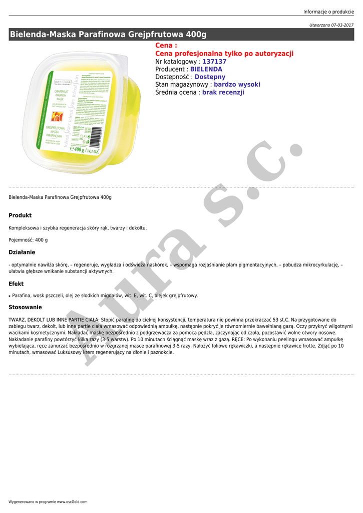 Informacje o produkcie Utworzono 07-03-2017 Bielenda-Maska Parafinowa Grejpfrutowa 400g Cena : Cena profesjonalna tylko po autoryzacji Bielenda-Maska Parafinowa Grejpfrutowa 400g Produkt Kompleksowa i szybka regeneracja skóry rąk, twarzy i dekoltu. s. c. Nr katalogowy : 137137 Producent : BIELENDA Dostępność : Dostępny Stan magazynowy : bardzo wysoki Średnia ocena : brak recenzji Działanie a Pojemność: 400 g Au r - optymalnie nawilża skórę, – regeneruje, wygładza i odświeża naskórek, – wspomaga rozjaśnianie plam pigmentacyjnych, – pobudza mikrocyrkulację, – ułatwia głębsze wnikanie substancji aktywnych. Efekt ● Parafina, wosk pszczeli, olej ze słodkich migdałów, wit. E, wit. C, olejek grejpfrutowy. Stosowanie TWARZ, DEKOLT LUB INNE PARTIE CIAŁA: Stopić parafinę do ciekłej konsystencji, temperatura nie powinna przekraczać 53 st.C. Na przygotowane do zabiegu twarz, dekolt, lub inne partie ciała wmasować odpowiednią ampułkę, następnie pokryć je równomiernie bawełnianą gazą. Oczy przykryć wilgotnymi wacikami kosmetycznymi. Nakładać maskę bezpośrednio z podgrzewacza za pomocą pędzla, zaczynając od czoła, pozostawić wolne otwory nosowe. Nakładanie parafiny powtórzyć kilka razy (3-5 warstw). Po 10 minutach ściągnąć maskę wraz z gazą. RĘCE: Po wykonaniu peelingu wmasować ampułkę wybielająca, ręce zanurzać bezpośrednio w rozgrzanej masce parafinowej 3-5 razy. Nałożyć foliowe rękawiczki, a następnie rękawice frotte. Zdjąć po 10 minutach, wmasować Luksusowy krem regenerujący na dłonie i paznokcie. Wygenerowano w programie www.oscGold.com