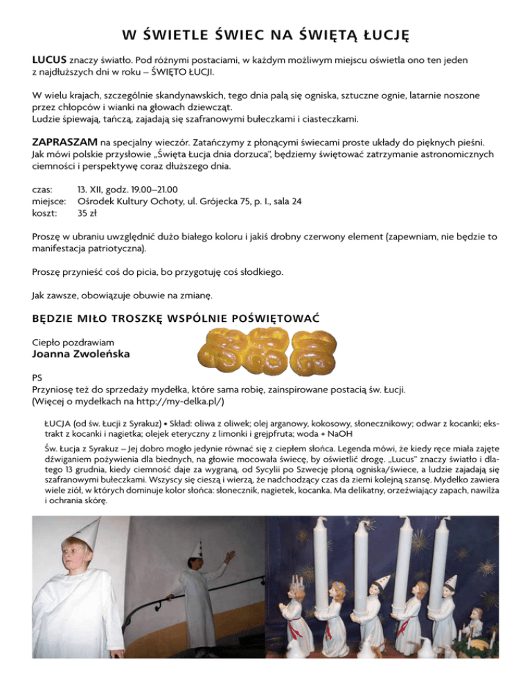 W ŚWIETLE ŚWIEC NA ŚWIĘTĄ ŁUCJĘ LUCUS znaczy światło. Pod różnymi postaciami, w każdym możliwym miejscu oświetla ono ten jeden z najdłuższych dni w roku – ŚWIĘTO ŁUCJI. W wielu krajach, szczególnie skandynawskich, tego dnia palą się ogniska, sztuczne ognie, latarnie noszone przez chłopców i wianki na głowach dziewcząt. Ludzie śpiewają, tańczą, zajadają się szafranowymi bułeczkami i ciasteczkami. ZAPRASZAM na specjalny wieczór. Zatańczymy z płonącymi świecami proste układy do pięknych pieśni. Jak mówi polskie przysłowie „Święta Łucja dnia dorzuca”, będziemy świętować zatrzymanie astronomicznych ciemności i perspektywę coraz dłuższego dnia. czas: 13. XII, godz. 19.00–21.00 miejsce: Ośrodek Kultury Ochoty, ul. Grójecka 75, p. I., sala 24 koszt: 35 zł Proszę w ubraniu uwzględnić dużo białego koloru i jakiś drobny czerwony element (zapewniam, nie będzie to manifestacja patriotyczna). Proszę przynieść coś do picia, bo przygotuję coś słodkiego. Jak zawsze, obowiązuje obuwie na zmianę. BĘDZIE MIŁO TROSZKĘ WSPÓLNIE POŚWIĘTOWAĆ Ciepło pozdrawiam Joanna Zwoleńska PS Przyniosę też do sprzedaży mydełka, które sama robię, zainspirowane postacią św. Łucji. (Więcej o mydełkach na http://my-delka.pl/) ŁUCJA (od św. Łucji z Syrakuz) • Skład: oliwa z oliwek; olej arganowy, kokosowy, słonecznikowy; odwar z kocanki; ekstrakt z kocanki i nagietka; olejek eteryczny z limonki i grejpfruta; woda + NaOH Św. Łucja z Syrakuz – Jej dobro mogło jedynie równać się z ciepłem słońca. Legenda mówi, że kiedy ręce miała zajęte dźwiganiem pożywienia dla biednych, na głowie mocowała świecę, by oświetlić drogę. „Lucus” znaczy światło i dlatego 13 grudnia, kiedy ciemność daje za wygraną, od Sycylii po Szwecję płoną ogniska/świece, a ludzie zajadają się szafranowymi bułeczkami. Wszyscy się cieszą i wierzą, że nadchodzący czas da ziemi kolejną szansę. Mydełko zawiera wiele ziół, w których dominuje kolor słońca: słonecznik, nagietek, kocanka. Ma delikatny, orzeźwiający zapach, nawilża i ochrania skórę.