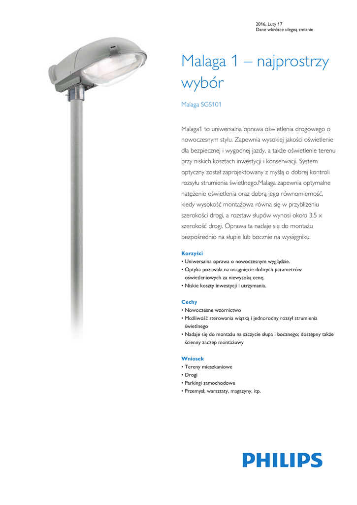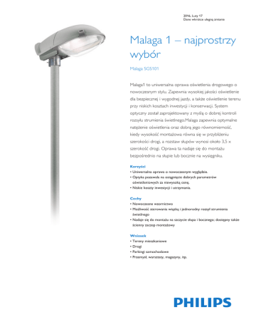 2016, Luty 17 Dane wkrótce ulegną zmianie Malaga 1 – najprostrzy wybór Malaga SGS101 Malaga1 to uniwersalna oprawa oświetlenia drogowego o nowoczesnym stylu. Zapewnia wysokiej jakości oświetlenie dla bezpiecznej i wygodnej jazdy, a także oświetlenie terenu przy niskich kosztach inwestycji i konserwacji. System optyczny został zaprojektowany z myślą o dobrej kontroli rozsyłu strumienia świetlnego.Malaga zapewnia optymalne natężenie oświetlenia oraz dobrą jego równomierność, kiedy wysokość montażowa równa się w przybliżeniu szerokości drogi, a rozstaw słupów wynosi około 3,5 x szerokość drogi. Oprawa ta nadaje się do montażu bezpośrednio na słupie lub bocznie na wysięgniku. Korzyści • Uniwersalna oprawa o nowoczesnym wyglądzie. • Optyka pozawala na osiągnięcie dobrych parametrów oświetleniowych za niewysoką cenę. • Niskie koszty inwestycji i utrzymania. Cechy • Nowoczesne wzornictwo • Możliwość sterowania wiązką i jednorodny rozsył strumienia świetlnego • Nadaje się do montażu na szczycie słupa i bocznego; dostępny także ścienny zaczep montażowy Wniosek • Tereny mieszkaniowe • Drogi • Parkingi samochodowe • Przemysł, warsztaty, magazyny, itp. Malaga SGS101 2 Specyfikacje • Typ SGS101/SGS102 • Kolor Szary RAL 7035 • Źródło światła HID: - 1 x MASTER SON-T PIA Plus / E27 / 50, 70 W (SGS101) - 1 x MASTER SON-T PIA Plus / E40 / 100, 150, 250 W (SGS102) • Instalacja • Zawiera lampę Nie • Osprzęt Elektromagnetyczny (niskostratny) 230 / 50 Hz • Napięcie 230 V • Optyka 3-częściowa optyka z wysokiej jakości aluminium młotkowanego Regulowany rozsył światła: 3 pozycje odbłyśnika (SGS101), 5 pozycji odbłyśnika (SGS102) Zamocowanie szczytowe lub boczne do każdego słupa lub wysięgnika o średnicy końcówki 42-60 mm Zintegrowany zaczep montażowy Zalecana wysokość montażowa: 6-10m Standardowy kąt nachylenia na szczycie słupa: 15° Regulowany rozsył światła: 3 pozycje odbłyśnika (SGS101), 5 pozycji odbłyśnika (SGS102) Maksymalna powierzchnia boczna: 0,09 m2 Maksymalna wartość SCx: 0,04 m2 • Konserwacja Klosz na zamki oraz łatwo demontowana płyta zamykająca • Główne zastosowania Tereny mieszkalne, drogi, parkingi, przemysł • Klosz Klosz z poliwęglanu • Zapłonnik Szeregowo-równoległy (SP) • Materiały i wykończenie Korpus: polipropylen wzmacniany włóknem szklanym, z zabezpieczeniem przeciwko promieniowaniu UV Klosz: poliwęglan Zaczep montażowy: odlew aluminiowy, niekorodujący Informacje podstawowe order code CapBase CE mark Optical cover/lens type ENEC mark Gear Lamp family code Lamp power Number of light sources Optic type Product Family Code 63644400 E27 CE FG ENEC CONV SON-TPP 50 1 ruchomy odbłyśnik SGS101 63647500 E27 CE FG ENEC CONV SON-T 70 1 ruchomy odbłyśnik SGS101 63938400 E27 CE FG ENEC E - - 1 ruchomy odbłyśnik SGS101 11859800 E27 CE PC ENEC CONV SON-T 50 1 ruchomy odbłyśnik SGS101 63456300 E27 CE PC ENEC CONV SON-I 70 1 ruchomy odbłyśnik ze śrubą imbusową SGS101 63458700 E27 CE PC ENEC CONV SON-T 70 1 ruchomy odbłyśnik SGS101 63459400 E27 CE PC ENEC CONV SON-T 70 1 ruchomy odbłyśnik ze śrubą imbusową SGS101 11977900 E27 CE PC ENEC CONV SON-TPP 70 1 ruchomy odbłyśnik SGS101 11978600 E27 CE PC ENEC CONV SON-I 70 1 ruchomy odbłyśnik SGS101 11976200 E27 CE PC ENEC CONV SON-TPP 50 1 ruchomy odbłyśnik SGS101 Dane techniczne oświetlenia order code Mechanika i korpus Standard tilt angle side entry Standard tilt angle posttop 63644400 0 0 63647500 15 15 63938400 0 0 11859800 15 15 63456300 15 15 63458700 15 15 63459400 15 15 11977900 0 0 11978600 0 0 11976200 0 0 order code Color 63644400 GR 63647500 GR 63938400 GR 11859800 GR 63456300 SA 63458700 GR 63459400 GR 11977900 GR 11978600 GR 11976200 GR 2016, Luty 17 Dane wkrótce ulegną zmianie Malaga SGS101 3 Certyfikaty i zastosowania Certyfikaty i zastosowania order code Mech. impact protection code order code Mech. impact protection code 63644400 IK08 63458700 IK08 63647500 IK08 63459400 IK08 63938400 IK08 11977900 IK08 11859800 IK08 11978600 IK08 63456300 IK08 11976200 IK08 © 2016 Philips Lighting Holding B.V. Wszelkie prawa zastrzeżone Dane mogą ulec zmianie bez uprzedniego powiadomienia. Znak towarowy jest własnością Koninklijke Philips N.V. (Royal Philips) lub odpowiednich podmiotów . www.philips.pl/lighting 2016, Luty 17 Dane wkrótce ulegną zmianie