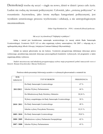 Demokracji trzeba się uczyć – ciągle na nowo, dzień w dzień i przez całe życie. Ludzie nie rodzą się istotami politycznymi. Człowiek, jako „zwierzę polityczne” w rozumieniu Arystotelesa, jako istota myśląca kategoriami politycznymi, jest wynikiem ustawicznego procesu wychowania i edukacji, a nie antropologicznym niezmiennikiem. Oskar Negt Reinhard (ur. 1934 ) niemiecki filozof społeczny . Jak uczyć się demokracji? Najlepiej w praktyce ! Jedną z metod jest kształtowane samorządu uczniowskiego (w naszej szkole Rada Samorządu Uczniowskiego). Uczniowie XLIV LO co roku organizują wybory samorządowe. Od 2007 r. włączają się w ogólnopolską akcję Młodzi Głosują ( inicjatywa Centrum Edukacji Obywatelskiej). Jednak na samym głosowaniu się nie kończy. Uczniowie przygotowują informacje dotyczące prawa wyborczego, przedstawiają statystyki dotyczące poszczególnych komitetów wyborczych, ich programów a także organizują debaty wyborcze. Nadzór merytoryczny nad młodzieżą przygotowującą wybory maja przyjemność pełnić nauczyciele wos-u i historii: Renata Graczkowska i Maciej Turkiewicz. Poniższa tabela prezentuje frekwencję uczniów w wybranych głosowaniach z ostatnich lat. ROK SZKOLNY 2011/2012 TYP WYBORÓW Do Rady Samorządu Uczniowskiego 47 % Szkolne Wybory Parlamentarne 44 % Do Młodzieżowej Rady Dzielnicy Mokotów 2010 / 2011 FREKWENCJA 20,36 % Wybory uzupełniające do Rady Samorządu Uczniowskiego 30 % Do Rady Samorządu Uczniowskiego 48 % Szkolne wybory Prezydenta Warszawy 35,31 % 2009 / 2010 Do Rady Samorządu Uczniowskiego 29,8 % 2008 / 2009 Młodzieżowe wybory Parlamentu Europejskiego 42 % 2007 / 2008 Szkolne Wybory Parlamentarne 45 %