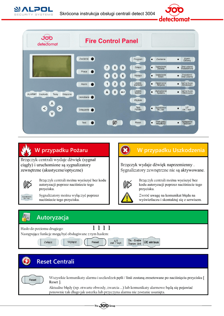 Skrócona instrukcja obsługi centrali detect 3004 W przypadku Pożaru W przypadku Uszkodzenia Brzęczyk centrali wydaje dźwięk (sygnał ciągły) i uruchomione są sygnalizatory zewnętrzne (akustyczne/optyczne) Brzęczyk wydaje dźwięk naprzemienny . Sygnalizatory zewnętrzne nie są aktywowane. Brzęczyk centrali można wyciszyć bez kodu autoryzacji poprzez naciśniecie tego przycisku. Brzęczyk centrali można wyciszyć bez kodu autoryzacji poprzez naciśniecie tego przycisku. Sygnalizatory można wyłączyć poprzez naciśniecie tego przycisku. Zwróć uwagę na komunikat błędu na wyświetlaczu i skontaktuj się z serwisem. Autoryzacja 1 1 1 1 Hasło do poziomu drugiego: Następujące funkcje mogą być obsługiwane z tym hasłem: Reset Centrali Wszystkie komunikaty alarmu i uszkodzeń pętli / linii zostaną zresetowane po naciśnięciu przycisku [ Reset ]. Aktualne błędy (np. otwarte obwody, zwarcia ...) lub komunikaty alarmowe będą się pojawiać ponownie tak długo jak usterka lub przyczyna alarmu nie zostanie usunięta. Skrócona instrukcja obsługi centrali detect 3004 Włączanie / wyłączanie czujników adresowalnych Przykład zastosowania Patrz na pierwszej stronie kod autoryzacji Wyłączenie detektorów 10-15 w strefie 2 Naciśnij 1 2 3 4 5 6 aby wyłączyć Klawisz [ 1 ] dla detektora 20-02-12 07:16:30 Wylacz detektor Wylacz strefe Sygnalizator wyl wylacz test Disable FireX Disable delay > 000 000 000 000 20-02-12 Strefa od detektor do detektor 000 000 07:16:32 : : : 000 000 Dla "Strefa:" wprowadź [ 2 ] i potwierdź Wprowadź [ 10 ] w "od Detektor" i potwierdź Wprowadź [ 15 ] w "do Detektor" i potwierdź Wszystkie odłaczone detektory zostana teraz pokazane na wyswielaczu lCD Wyłączenie całej strefy detektorów (np.: strefa czujek 5) Naciśnij 1 2 3 4 5 6 dla wyłączenia. Klawisz [ 2 ] by wybrać "Wyłącz strefę" 20-02-12 07:17:08 Wylacz detektor Wylacz strefe Sygnalizator wyl Wylacz test Wylacz Syst. Gasz. Wyłacz opoznienie> 000 000 000 000 20-02-12 07:17:09 Strefa od : do : 000 000 : 000 000 Wprowadź [ 5 ] w polu "od" I potwierdź. Wprowadź [ 5 ] w polu "do" I potwierdź . Wszystkie odłaczone strefy zostana teraz pokazane na wyswielaczu lCD Właczenie czujek i stref odbywa się za pomocą klawisza tak samo jak wyłaczenie. Włączanie i wyłączanie dalszych pozycji w menu odbywa się tak samo.