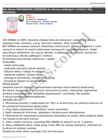 Informacje o produkcie Utworzono 07-03-2017 Bio Henna MAHONIOWA CZERWIEŃ do włosów półdługich i krótkich 50g Orientana Cena : 23.90 zł m .p l Dostępność : Dostępny Stan magazynowy : bardzo wysoki Średnia ocena : brak recenzji de es is .c o BIO HENNA to 100% naturalna ziołowa farba do koloryzacji i pielęgnacji włosów. Uzyskasz kolor czerwieni, a przy ciemnych włosach– kolor mahoniu. BIO HENNA nie zawiera żadnych składników chemicznych. Składa się jedynie z roślin znanych w Indiach ze swoich właściwości barwiących oraz pielęgnujących. Dzięki naturalnym składnikom nie niszczy włosów, a nabłyszcza je, odżywia i wzmacnia. Do koloryzacji włosów półdługich i krótkich. W zestawie jednorazowe rękawiczki i czepek. DZIAŁANIE: - trwale koloryzuje, - podkreśla naturalny odcień włosów, - odżywia włosy i nadaje im objętość, - zapewnia miękkie i lśniące włosy - pomaga w zachowniau zdrowej skóry głowy - korzystnie wpływa na porost włosów PEŁEN SKŁAD: Lawsonia Inermis (Henna) – sproszkowane barwiące liście lawsonii bezbronnej Bio Henna nie zawiera chemicznych wzmacniaczy koloru, barwników, pigmentów środków konserwujących, dodatków zapachowych i aromatów. Nie zawiera 3-nitro-p-hydroxyethylaminophenolu. SPOSÓB UŻYCIA: 1. Wymieszaj proszek z ciepłą wodą (ok. 50C) w ceramicznej lub szklanej miseczce aż do uzyskania konsystencji gęstej pasty. 2. Umyj włosy szamponem Orientana i osusz ręcznikiem. 3. Nałóż rękawiczki ochronne, zabezpiecz ubranie przed zabrudzeniem. 4. Równomiernie rozprowadź przestudzoną mieszankę na umyte, lekko wilgotne włosy (od nasady aż po same końce). 5. Załóż czepek ochronny i pozostaw BIO HENNĘ na włosach na ok. 2 godziny 6. Spłucz dokładnie włosy ciepłą wodą. Przez 48h nie używaj szamponu, odżywek ani środków do stylizacji włosów. Ostateczny kolor włosy uzyskają 2 dni od koloryzacji. Wygenerowano w programie www.oscGold.com de es is .c o m .p l UWAGA! Jeśli masz bardzo jasne, rozjaśniane chemicznie lub całkowicie siwe włosy przetestuj na jednym paśmie włosów przed pierwszym użyciem!