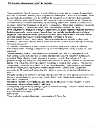 GW: Starówka otwarta przez tydzień dla cyklistów Tak zapowiedział Piotr Grzymowicz, prezydent Olsztyna. A we wtorek, podczas Europejskiego Dnia bez Samochodu, kierowcy będą mogli bezpłatnie korzystać z komunikacji miejskiej. Dzień bez samochodu obchodzony jest 22 września. To najważniejsze wydarzenie Europejskiego Tygodnia Zrównoważonego Transportu, który właśnie rozpoczął się w Olsztynie. - Cieszę się, że w końcu dosyć wcześnie zabraliśmy się za obchody tego święta - ocenia Mirosław Arczak, społeczny pełnomocnik prezydenta do spraw rowerzystów. - Dotychczas mieszkańcy nawet nie odnotowywali tego dnia w swojej świadomości, bo niewiele działo się z tej okazji. Piotr Grzymowicz, prezydent Olsztyna, zdecydował, że przez najbliższy tydzień starówka będzie otwarta dla rowerzystów. - Uzgodniłem to z miejską komisją bezpieczeństwa wyjaśnia. - Służby mundurowe będą monitorować, jak to się sprawdzi. Pomoże nam to również podjąć decyzję, czy wprowadzić takie rozwiązanie na stałe. Codziennie w bibliotekach Multicentrum i Abecadło będą odbywać się zajęcia dla dzieci i młodzieży. Chętni m.in. zbudują własny rower albo wezmą udział w warsztatach graficznych pt. "Rowerowe impresje". W niedzielę zaś urzędnicy w towarzystwie znanych olsztynian zasadzą przy ul. Sielskiej kilkadziesiąt drzew. W akcję zaangażowali się również motocykliści, którzy przyjadą na Dajtki rowerami. Jednak najwięcej atrakcji czeka na olsztynian we wtorek, podczas Europejskiego Dnia bez Samochodu. Kierowcy będą mogli wówczas podróżować za darmo wszystkimi autobusami miejskimi. Biletem będzie dowód rejestracyjny swojego pojazdu. Początkowo MPK nie przewidziało sytuacji, kiedy popularny wóz na bus zamieni np. matka z dziećmi. Za darmo miała jechać tylko rodzicielka. Swoim pociechom musiałaby więc kupić bilety ulgowe. - Nie możemy zrezygnować z opłat dla wszystkich, żeby ktoś nie próbował tego wykorzystywać - próbował tłumaczyć Przemysław Kaperzyński, rzecznik prasowy MPK. Jednak Piotr Grzymowicz zapewnia, że 22 września dzieci pod opieką rodziców-kierowców też będą mogły jeździć za darmo. Ponadto wsiadając do okolicznościowego czerwonego autobusu, który będzie krążył po ulicach Olsztyna, chętni dowiedzą się więcej o mieście. O jego historii i zabytkach opowie Andrzej Bobrowicz, przewodnik. Biblioteka Planeta 11 przygotowała zaś zabawę pod hasłem "Rower Power" , w której uhonoruje najbardziej wytrwałych cyklistów. Szczegółowy program Europejskiego Tygodnia Zrównoważonego Transportu można znaleźć na stronie Urzędu Miasta (www.olsztyn.eu). [email protected] Marta Bełza Tekst pochodzi z portalu Gazeta.pl - www.gazeta.pl © Agora SA 1/1