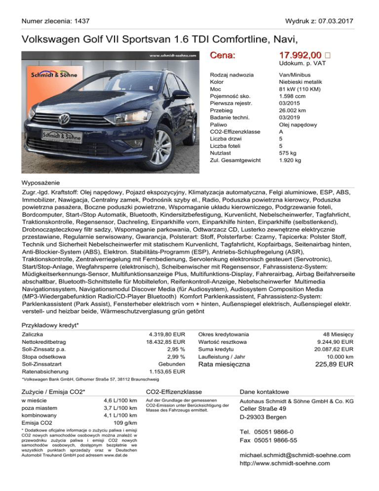 Numer zlecenia: 1437 Wydruk z: 07.03.2017 Volkswagen Golf VII Sportsvan 1.6 TDI Comfortline, Navi, Cena: 17.992,00 Rodzaj nadwozia Kolor Moc Pojemność sko. Pierwsza rejestr. Przebieg Badanie techni. Paliwo CO2-Effizenzklasse Liczba drzwi Liczba foteli Nutzlast Zul. Gesamtgewicht Van/Minibus Niebieski metalik 81 kW (110 KM) 1.598 ccm 03/2015 26.002 km 03/2019 Olej napędowy A 5 5 575 kg 1.920 kg Udokum. p. VAT Wyposażenie Zugr.-lgd. Kraftstoff: Olej napędowy, Pojazd ekspozycyjny, Klimatyzacja automatyczna, Felgi aluminiowe, ESP, ABS, Immobilizer, Nawigacja, Centralny zamek, Podnośnik szyby el., Radio, Poduszka powietrzna kierowcy, Poduszka powietrzna pasażera, Boczne poduszki powietrzne, Wspomaganie układu kierowniczego, Podgrzewanie foteli, Bordcomputer, Start-/Stop Automatik, Bluetooth, Kindersitzbefestigung, Kurvenlicht, Nebelscheinwerfer, Tagfahrlicht, Traktionskontrolle, Regensensor, Dachreling, Einparkhilfe vorn, Einparkhilfe hinten, Einparkhilfe (selbstlenkend), Drobnocząsteczkowy filtr sadzy, Wspomaganie parkowania, Odtwarzacz CD, Lusterko zewnętrzne elektrycznie przestawiane, Regularnie serwisowany, Gwarancja, Polsterart: Stoff, Polsterfarbe: Czarny, Tapicerka: Polster Stoff, Technik und Sicherheit Nebelscheinwerfer mit statischem Kurvenlicht, Tagfahrlicht, Kopfairbags, Seitenairbag hinten, Anti-Blockier-System (ABS), Elektron. Stabilitäts-Programm (ESP), Antriebs-Schlupfregelung (ASR), Traktionskontrolle, Zentralverriegelung mit Fernbedienung, Servolenkung elektronisch gesteuert (Servotronic), Start/Stop-Anlage, Wegfahrsperre (elektronisch), Scheibenwischer mit Regensensor, Fahrassistenz-System: Müdigkeitserkennungs-Sensor, Multifunktionsanzeige Plus, Multifunktions-Display, Fahrerairbag, Airbag Beifahrerseite abschaltbar, Bluetooth-Schnittstelle für Mobiltelefon, Reifenkontroll-Anzeige, Nebelscheinwerfer Multimedia Navigationssystem, Navigationsmodul Discover Media (für Audiosystem), Audiosystem Composition Media (MP3-Wiedergabefunktion Radio/CD-Player Bluetooth) Komfort Parklenkassistent, Fahrassistenz-System: Parklenkassistent (Park Assist), Fensterheber elektrisch vorn + hinten, Außenspiegel elektrisch, Außenspiegel elektr. verstell- und heizbar beide, Wärmeschutzverglasung grün getönt Przykładowy kredyt* Zaliczka Nettokreditbetrag Soll-Zinssatz p.a. Stopa odsetkowa Soll-Zinssatzart Ratenabsicherung 4.319,80 EUR 18.432,85 EUR 2,95 % 2,99 % Gebunden 1.153,65 EUR Okres kredytowania Wartość resztkowa Suma kredytu Laufleistung / Jahr 48 Miesięcy 9.244,90 EUR 20.087,62 EUR 10.000 km Rata miesięczna 225,89 EUR *Volkswagen Bank GmbH, Gifhorner Straße 57, 38112 Braunschweig Zużycie / Emisja CO2* w mieście poza miastem kombinowany Emisja CO2 4,6 L/100 km 3,7 L/100 km 4,1 L/100 km 109 g/km * Dodatkowe oficjalne informacje o zużyciu paliwa i emisji CO2 nowych samochodów osobowych można znaleźć w przewodniku zużycia paliwa i emisji CO2 nowych samochodów osobowych, dostępnym bezpłatnie we wszystkich punktach sprzedaży oraz w Deutschen Automobil Treuhand GmbH pod adresem www.dat.de CO2-Effizenzklasse Dane kontaktowe Auf der Grundlage der gemessenen CO2-Emission unter Berücksichtigung der Masse des Fahrzeugs ermittelt. Autohaus Schmidt & Söhne GmbH & Co. KG Celler Straße 49 D-29303 Bergen Tel. 05051 9866-0 Fax 05051 9866-55 [email protected] http://www.schmidt-soehne.com Numer zlecenia: 1437 Wydruk z: 07.03.2017 Volkswagen Golf VII Sportsvan 1.6 TDI Comfortline, Navi, Numer zlecenia: 1437 Wydruk z: 07.03.2017 Volkswagen Golf VII Sportsvan 1.6 TDI Comfortline, Navi,