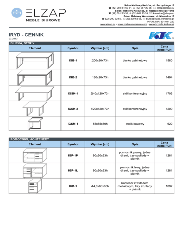 Salon Meblowy Kraków, ul. Surzyckiego 16 (12) 269 81 60-61, (12) 267 20 38, [email protected] Salon Meblowy Katowice, al. Roździeńskiego 191B (32) 601 23 33, (32) 601 23 33, [email protected] Salon Meblowy Warszawa, ul. Mineralna 16 (22) 290 62 55, (22) 290 62 55, [email protected] INFOLINIA: 801 011 220 www.elzap.eu • www.meble-metalowe.com • www.krzesla.krakow.pl IRYD - CENNIK 03.2013 BIURKA, STOŁY Element Cena netto PLN Symbol Wymiar [cm] Opis IGB-1 200x90x73h biurko gabinetowe 1580 IGB-2 180x90x73h biurko gabinetowe 1494 IGSK-1 240x120x73h stół konferencyjny 1703 IGSK-2 120x120x73h stół konferencyjny 1200 IGSM-1 55x55x50h stolik kawowy 622 Symbol Wymiar [cm] Opis IGP-1P 90x60x63h pomocnik prawy, jedne drzwi, trzy szuflady + piórnik 1281 IGP-1L 90x60x63h pomocnik lewy, jedne drzwi, trzy szuflady + piórnik 1281 IGK-1 44,8x60x63h kontener z wkładem metalowym, trzy szuflady + piórnik 1097 POMOCNIKI, KONTENERY Element Cena netto PLN SZAFY, KOMODY Element Cena netto PLN Symbol Wymiar [cm] Opis IGS-1 105x41x168,4h szafa wysoka, pełne drzwi 1580 IGS-2AL 105x41x168,4h szafa wysoka, szklane drzwi w ramce aluminiowej 1898 IGS-3G-P 71,6x41x168,4h szafa ubraniowa prawa 861 IGS-3G-L 71,6x41x168,4h szafa ubraniowa lewa 861 IGS-3P 71,6x41x168,4h szafa wysoka prawa, wąska, pełne drzwi 1086 IGS-3L 71,6x41x168,4h szafa wysoka lewa, wąska, pełne drzwi 1086 IGS-4AL-P 71,6x41x168,4h szafa wysoka prawa, wąska, szklane drzwi w ramce aluminiowej 1416 IGS-4AL-L 71,6x41x168,4h szafa wysoka lewa, wąska, szklane drzwi w ramce aluminiowej 1416 IGS-5 105x41x98h komoda wysoka, pełne drzwi 1109 IGS-6AL 105x41x98h komoda wysoka, szklane drzwi w ramce aluminiowej 1346 IGS-7 105x41x62h komoda niska, pełne drzwi 852 IGS-8 203,6x41x62h komoda niska, pełne drzwi 1091 IGS-9AL 203,6x41x62h komoda niska, szklane drzwi w ramce aluminiowej 1580 OPIS TECHNICZNY: 1. Kolorystyka zestawu legno tabac, dąb brązowy stelaż aluminium RAL 9006 gładki 2. Grubości płyt: Gr 28mm - blaty biurek, stołów konferencyjnych, korpusy szaf, kontenera, pomocnika, stopki w szafach Gr 18mm - fronty, półki, plecy w niskich szafkach 3. Obrzeże ABS ( 2mm i 1mm) 4. Szuflady w szafach i szafkach: - tandembox (pełny wysuw z cichym samoczynnym domknięciem) - wkłady szuflad - płyta czarna perlista gr. 16mm 5. Kontener, Pomocnik - metalowy wkład szuflady z piórnikiem, centralny zamek, kółka podgumowane 6. Stopki do szaf - „klocki” z płyty gr. 28mm z wpuszczonymi stopkami regulacyjnymi 7. Cechy charakterystyczne - nowoczesna forma i wysoka jakość - oryginalny design