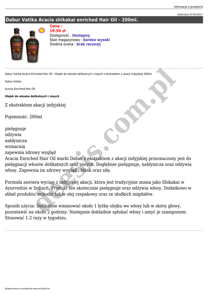 Informacje o produkcie Utworzono 07-03-2017 Dabur Vatika Acacia shikakai enriched Hair Oil - 200ml. Cena : 19.50 zł Dostępność : Dostępny Stan magazynowy : bardzo wysoki Średnia ocena : brak recenzji Dabur Vatika Acacia Enriched Hair Oil - Olejek do włosów delikatnych i siwych z ekstraktem z akacji indyjskiej 200ml m .p l Dabur Vatika Acacia Enriched Hair Oil Olejek do włosów delikatnych i siwych Z ekstraktem akacji indyjskiej .c o Pojemność: 200ml es is pielęgnuje odżywia nabłyszcza wzmacnia zapewnia zdrowy wygląd Acacia Enriched Hair Oil marki Dabur z ekstraktem z akacji indyjskiej przeznaczony jest do pielęgnacji włosów delikatnych oraz siwych. Dogłębnie pielęgnuje, nabłyszcza oraz odżywia włosy. Zapewnia im zdrowy wygląd , blask oraz siłę. de Formuła zawiera wyciąg z indyjskiej akacji, która jest tradycyjnie znana jako Shikakai w Ayurvedzie w Indiach. Produkt ten skutecznie pielęgnuje oraz odżywia włosy. Dodatkowo w skład produktu wchodzi także olej rzepakowy oraz ze słodkich migdałów. Sposób użycia: Delikatnie wmasować około 1 łyżkę olejku we włosy lub w skórę głowy, pozostawić na około 2 godziny. Następnie dokładnie spłukać włosy i umyć je szamponem. Stosować 1-2 razy w tygodniu. Wygenerowano w programie www.oscGold.com