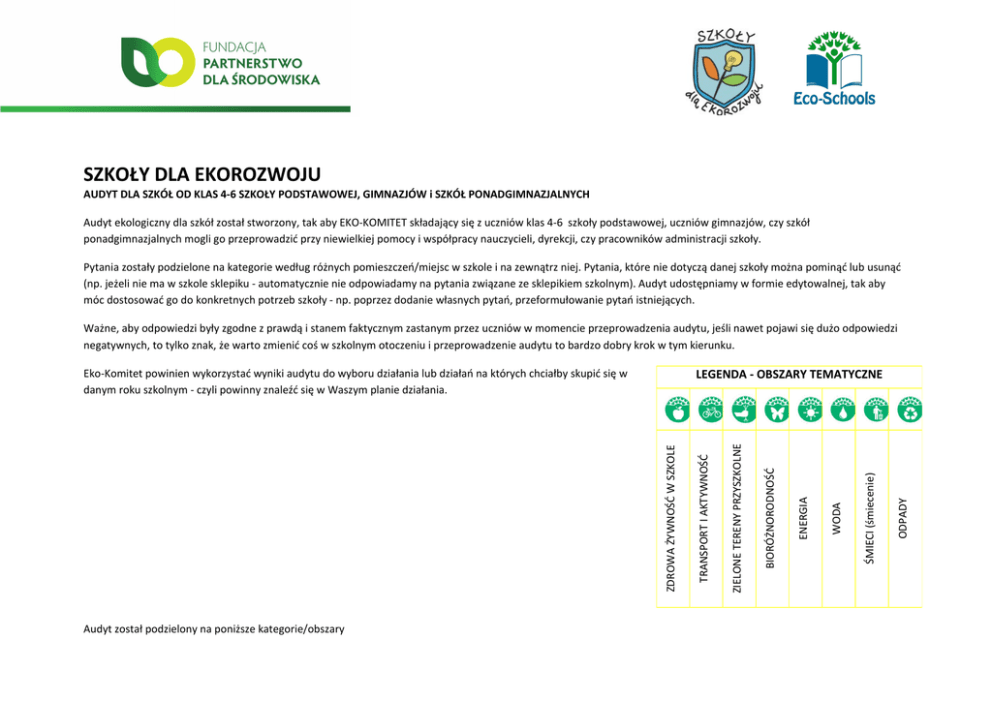 SZKOŁY DLA EKOROZWOJU AUDYT DLA SZKÓŁ OD KLAS 4-6 SZKOŁY PODSTAWOWEJ, GIMNAZJÓW i SZKÓŁ PONADGIMNAZJALNYCH Audyt ekologiczny dla szkół został stworzony, tak aby EKO-KOMITET składający się z uczniów klas 4-6 szkoły podstawowej, uczniów gimnazjów, czy szkół ponadgimnazjalnych mogli go przeprowadzić przy niewielkiej pomocy i współpracy nauczycieli, dyrekcji, czy pracowników administracji szkoły. Pytania zostały podzielone na kategorie według różnych pomieszczeń/miejsc w szkole i na zewnątrz niej. Pytania, które nie dotyczą danej szkoły można pominąć lub usunąć (np. jeżeli nie ma w szkole sklepiku - automatycznie nie odpowiadamy na pytania związane ze sklepikiem szkolnym). Audyt udostępniamy w formie edytowalnej, tak aby móc dostosować go do konkretnych potrzeb szkoły - np. poprzez dodanie własnych pytań, przeformułowanie pytań istniejących. Ważne, aby odpowiedzi były zgodne z prawdą i stanem faktycznym zastanym przez uczniów w momencie przeprowadzenia audytu, jeśli nawet pojawi się dużo odpowiedzi negatywnych, to tylko znak, że warto zmienić coś w szkolnym otoczeniu i przeprowadzenie audytu to bardzo dobry krok w tym kierunku. Eko-Komitet powinien wykorzystać wyniki audytu do wyboru działania lub działań na których chciałby skupić się w danym roku szkolnym - czyli powinny znaleźć się w Waszym planie działania. Audyt został podzielony na poniższe kategorie/obszary ODPADY ŚMIECI (śmiecenie) WODA ENERGIA BIORÓŻNORODNOŚĆ ZIELONE TERENY PRZYSZKOLNE TRANSPORT I AKTYWNOŚĆ ZDROWA ŻYWNOŚĆ W SZKOLE LEGENDA - OBSZARY TEMATYCZNE INFORMACJE OGÓLNE - podstawowe informacje o szkole KLASA SZKOLNA - zachęcamy do wybrania „typowej” klasy - takiej, jakich większość jest w szkole TOALETA/ ŁAZIENKA - w przypadku dużych szkół większość informacji wystarczy uzupełnić na podstawie wybranej/losowej łazienki/toalety KORYTARZ SZKOLNY - na korytarzu szkolnym będzie potrzebna pomoc osób dorosłych i innych uczniów SEKRETARIAT/DYREKCJA - zachęcamy, aby umożliwić swobodne sprawdzenie również tych pomieszczeń SKLEPIK i KUCHNIA SZKOLNA -jeśli uczniowie nie mogą wejść do kuchni, w odpowiedzi na pytania mogą pomóc im osoby pracujące w kuchni DOJAZDY DO SZKOŁY/AKTYWNOŚĆ RUCHOWA - odpowiedzi będą wymagały przepytania większej grupy uczniów TEREN PRZYSZKOLNY - to teren przynależny do szkoły (np. wyznaczony ogrodzeniem) można dodać INNE: np. pokój nauczycielski, kotłownia, pracownia komputerowe OBSZAR OBSZAR KLASA SZKOLNA INFORMACJE nr5 im.Marii Konopnickiej w Ełku PYTANIE OGÓLNE:Szkoła Podstawowa ODPOWIEDŹ/pytania, uwagi dodatkowe/ WSKAZÓWKI Ile lamp/źródeł światła PYTANIEznajduje się w klasie? Gdzie znajduje się Wasza szkoła? Ile okien znajduje się w klasie? Z której strony świata znajdują się okna? W którym roku budynek Waszej szkoły został zbudowany? Ile osób tworzy Waszą szkołę? Czy światła zapewniają dobre oświetlenie wszystkich miejsc pracy w klasie? Jaka jest powierzchnia Waszej Czy światło jest wyłączane jeśliszkoły? w czasie lekcji jest wystarczająco dobre oświetlenie naturalne(słoneczne)? Co otacza Waszą szkołę? do oświetlania Jakie żarówki są używane klas szkolnych? Czy po wyjściu wszystkich z klasyjest? światło Największą zaletą Waszej szkoły jest zawsze gaszone? Liczba źródeł światła: 8 Liczba ławek(miejsc pracy): 16 ODPOWIEDŹ/pytania, uwagi dodatkowe/WSKAZÓWKI Wieś Małe miasto Średnie miasto Duże miasto około 60 tys. Liczba okien:3 Strona świata: poł.- zach. Godziny wystarczającego mieszkańców dziennego nasłonecznienia w miesiącu: nasłonecznienie 2003r. Ile klas (oddziałów) liczy 30 zależy od pory roku i pogody. Wasza szkoła w bieżącym roku Duże okna umożliwiają szkolnym? korzystanie ze światła naturalnego. Liczba uczniów: 783 Liczba nauczycieli: 70 Liczba pracowników TAK Obecna norma zaleca , aby w klasie najmniejsze dopuszczalne średnie administracji, utrzymania natężenie oświetlenia wynosiło 300 Luxów w całym pomieszczeniu, szkoły:25 NIE jednak nie mając luxomierza sprawdźcie po prostu czy przy każdej ławce oświetlenie jest według Was dostateczne Ile metrów kwadratowych ma szkoła? Ile kondygnacji ma szkoła? (każde TAK Jeśli w ciągu dnia oświetlenie naturalne w klasie jestpiętro 10379 m2 wystarczające i charakter wliczającaktualnej parter topracy jednanie kondygnacja) wymaga 5 NIE dodatkowego doświetlenia, warto wyłączyć lampy, oszczędzając tym samym szkolne rachunki. Czy do szkoły przynależ teren Czy moc w pobliżu szkoły znajdujeŚwietlówki się Czy w pobliżu szkoły znajduje A) tradycyjne Jaką Ile jest energooszczędne mają zielony/boisko? (Wymień) las, park, teren zielony? się ścieżka ruchowa, basen, mają wszystkich różne formy mogą być podłużne B) halogenowe Przed szkołą jest teren zielonyTak, prawie zasięgu ręki którego możecie żarówki (ile wżarówek w mamy (liniowe)boisko i np. zspiralne C) świetlówki trawnik , rośliny zielne, krzewy i jezioro, łąkę , las -bogactwo korzystać? WAT)? klasie? (kompaktowe). Najbardziej energooszczędne drzewa. Szkoła posiada boisko, plac roślin i zwierząt. Korzystamy z boiska, ścieżki 40 W przyjazne środowisku są żarówki zabaw. rowerowej i spacerowejD) świetlówki w oprawach LED, jednak są promenada nadal drogie i nie piękna biegnąca rastrowych zawsze można je łatwo zamienić przy jeziorze wśród drzew i D) żarówki LED z poprzednimi. krzewów. TAK szkołą w Czy wNajwiększą szkole jestwadą osoba, TAK Jesteśmy najmłodszą Część młodszych klas uczy się Waszej mieście, otoczoną darami natury- któraszkoły w oddzielnym budynku. pilnuje czy gaszone jest? jeziorem, łąką,NIE lasem. jest światło? NIE Jak szkoła jest ogrzewana? Ile miesięcy zwykle trwa okres grzewczy w Waszej szkole? Mało-przyjazne środowisku: Średnio-przyjazne środowisku: Bardziej-przyjazne środo