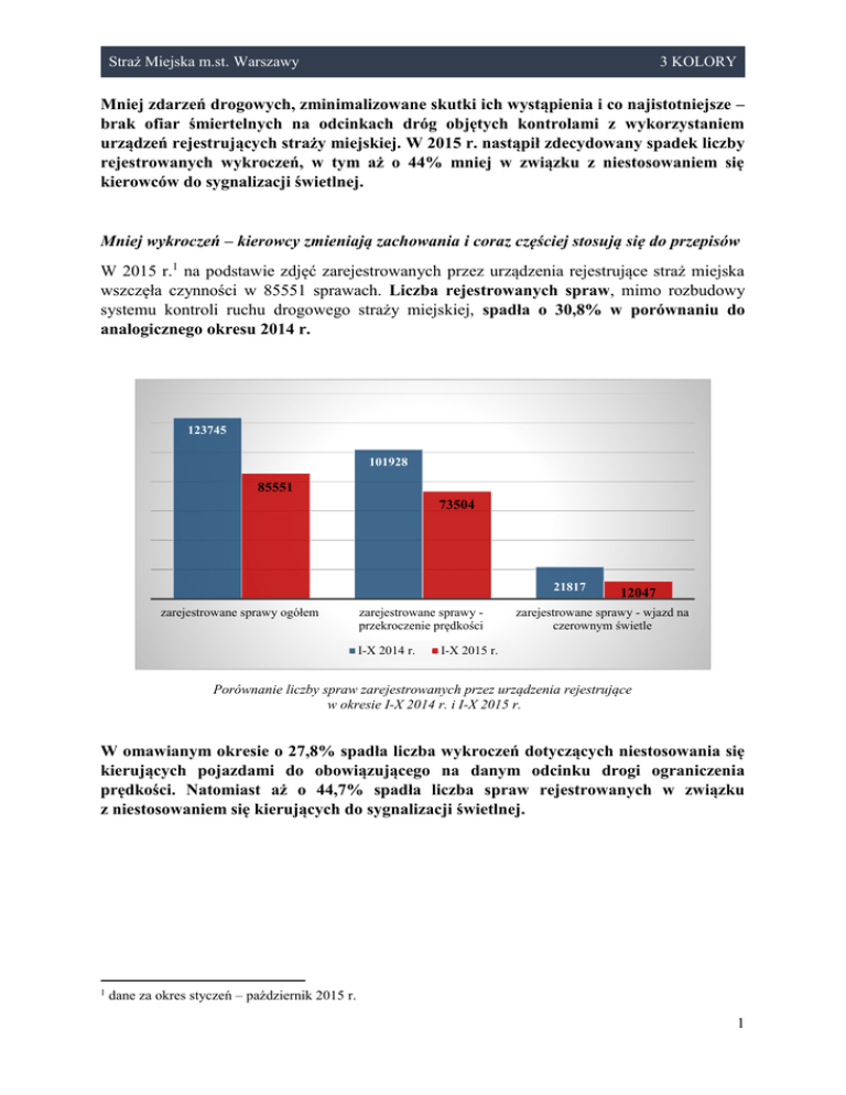Straż Miejska m.st. Warszawy 3 KOLORY Mniej zdarzeń drogowych, zminimalizowane skutki ich wystąpienia i co najistotniejsze – brak ofiar śmiertelnych na odcinkach dróg objętych kontrolami z wykorzystaniem urządzeń rejestrujących straży miejskiej. W 2015 r. nastąpił zdecydowany spadek liczby rejestrowanych wykroczeń, w tym aż o 44% mniej w związku z niestosowaniem się kierowców do sygnalizacji świetlnej. Mniej wykroczeń – kierowcy zmieniają zachowania i coraz częściej stosują się do przepisów W 2015 r.1 na podstawie zdjęć zarejestrowanych przez urządzenia rejestrujące straż miejska wszczęła czynności w 85551 sprawach. Liczba rejestrowanych spraw, mimo rozbudowy systemu kontroli ruchu drogowego straży miejskiej, spadła o 30,8% w porównaniu do analogicznego okresu 2014 r. 123745 101928 85551 73504 21817 zarejestrowane sprawy ogółem zarejestrowane sprawy przekroczenie prędkości I-X 2014 r. 12047 zarejestrowane sprawy - wjazd na czerownym świetle I-X 2015 r. Porównanie liczby spraw zarejestrowanych przez urządzenia rejestrujące w okresie I-X 2014 r. i I-X 2015 r. W omawianym okresie o 27,8% spadła liczba wykroczeń dotyczących niestosowania się kierujących pojazdami do obowiązującego na danym odcinku drogi ograniczenia prędkości. Natomiast aż o 44,7% spadła liczba spraw rejestrowanych w związku z niestosowaniem się kierujących do sygnalizacji świetlnej. 1 dane za okres styczeń – październik 2015 r. 1 Straż Miejska m.st. Warszawy 3 KOLORY Czerwone światło respektowane Urządzenia rejestrujące wjazd na czerwonym świetle w 2015 r. funkcjonowały na 7 skrzyżowaniach2 i zarejestrowały 12047 przypadków niestosowania się kierowców do sygnalizacji świetlnej. Obecnie kontrole, zarówno wjazdu na czerwonym świetle, jak i niestosowania się do prędkości, są prowadzone na 4 skrzyżowaniach: - al. Niepodległości / ul. Batorego, - ul. Grójecka / ul. Dickensa, - ul. Sobieskiego / ul. Witosa, - ul. Ostrobramska / ul. Fieldorfa. Urządzenia funkcjonujące na tych skrzyżowaniach zarejestrowały w ciągu 10 miesięcy 2015 r. – 26162 sprawy, to o 50,5% mniej niż rok wcześniej. 52895 31078 26162 21817 16214 9948 zarejestrowane sprawy ogółem zarejestrowane sprawy prędkość I-X 2014 r. zarejestrowane sprawy czerwone światło I-X 2015 r. Porównanie liczby spraw zarejestrowanych przez systemy zlokalizowane na skrzyżowaniach w okresie I-X 2014 r. i I-X 2015 r. W porównaniu do 2014 r. liczba spraw zarejestrowanych w związku z czerwonym światłem spadła na tych skrzyżowaniach o 54,4%. Na poszczególnych skrzyżowaniach spadek kształtował się od 44,2 % do 63,2%. Spadek liczby rejestrowanych wykroczeń, a co za tym idzie pozytywna zmiana zachowania kierowców, bezpośrednio wpłynął na poprawę bezpieczeństwa i oczekiwany skutek - brak ofiar śmiertelnych i ograniczenie liczby tragicznych zdarzeń drogowych. w lipcu i wrześniu 2015 r. ze względu na planowane od 01.01.2016 r. zmiany prawne wstrzymano kontrole na 3 skrzyżowaniach 2 2 Straż Miejska m.st. Warszawy 3 KOLORY Wypadki i kolizje wywołują negatywne skutki społeczne, które można przeliczyć na koszt społeczny, a ten w konsekwencji prowadzonych w Warszawie przez straż miejską kontroli, z roku na rok jest niższy. Stałe kontrole z wykorzystaniem urządzeń rejestrujących doprowadziły do znacznej poprawy bezpieczeństwa. Przykładowo w rejonie skrzyżowania ul. Grójecka / Dickensa w 2015 r. liczba odnotowanych kolizji spadła niemal o połowę. Od dwóch lat, w trakcie prowadzonych stałych kontroli, nikt nie zginął i nikt nie został ranny. Dane dotyczące skrzyżowania Grójecka / Dickensa Podobnie jest na skrzyżowaniu ul. Ostrobramska / Fieldorfa. Kiedyś jedno z bardziej niebezpiecznych. W tym roku odnotowano tu tylko dwie kolizje, a ich liczba w porównaniu do 2014 r. spadła ponad trzykrotnie. Skutki tych zdarzeń zostały również zminimalizowane. Nie odnotowano zdarzeń z udziałem osób rannych. Dane dotyczące skrzyżowania Ostrobramska / Fieldorfa Przykładowo w 2015 r. Straż Miejska m.st. Warszawy ujawniła wykroczenia polegające na niestosowaniu się do sygnalizacji świetlnej popełnione przez m.in.: - sędziów sądów powszechnych – 6 wykroczeń drogowych, - dyplomatów – 39 wykroczeń drogowych. Dodatkowo, od początku obowiązywania zmienionych w tym roku przepisów Prawa o ruchu drogowym, Straż Miejska m.st. Warszawy ujawniła 37 wykroczeń polegających na przekroczeniu w obszarze zabudowanym prędkości o ponad 50 km/h. 3 Straż Miejska m.st. Warszawy 3 KOLORY Skrzyżowanie ul. Grójecka / Dickensa Czerwone światło nadawane jest od ponad 2 s. Skrzyżowanie ul. Niepodległości / Batorego Czerwone światło nadawane jest od ponad 2 s. Skrzyżowanie ul. Sobieskiego / Witosa Czerwone światło nadawane jest od blisko 2 s. Skrzyżowanie ul. Ostrobramska / Fieldorfa Czerwone światło nadawane jest od blisko 3 s. 4
