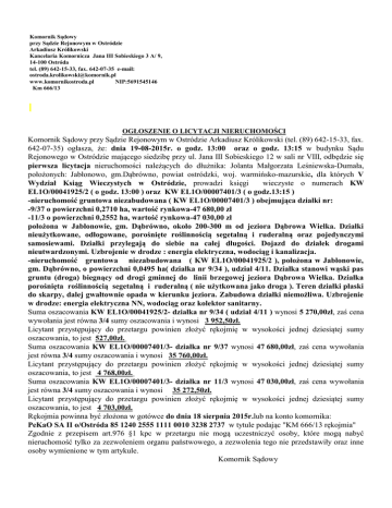 Komornik Sądowy przy Sądzie Rejonowym w Ostródzie Arkadiusz Królikowski Kancelaria Komornicza Jana III Sobieskiego 3 A/ 9, 14-100 Ostróda tel. (89) 642-15-33, fax. 642-07-35 e-mail: [email protected] www.komornikostroda.pl NIP:5691545146 Km 666/13 OGŁOSZENIE O LICYTACJI NIERUCHOMOŚCI Komornik Sądowy przy Sądzie Rejonowym w Ostródzie Arkadiusz Królikowski (tel. (89) 642-15-33, fax. 642-07-35) ogłasza, że: dnia 19-08-2015r. o godz. 13:00 oraz o godz. 13:15 w budynku Sądu Rejonowego w Ostródzie mającego siedzibę przy ul. Jana III Sobieskiego 12 w sali nr VIII, odbędzie się pierwsza licytacja nieruchomości należących do dłużnika: Jolanta Małgorzata Leśniewska-Dumała, położonych: Jabłonowo, gm.Dąbrówno, powiat ostródzki, woj. warmińsko-mazurskie, dla których V Wydział Ksiąg Wieczystych w Ostródzie, prowadzi księgi wieczyste o numerach KW EL1O/00041925/2 ( o godz. 13:00 ) oraz KW EL1O/00007401/3 ( o godz.13:15 ) -nieruchomość gruntowa niezabudowana ( KW EL1O/00007401/3 ) obejmująca działki nr: -9/37 o powierzchni 0,2710 ha, wartość rynkowa-47 680,00 zł -11/3 o powierzchni 0,2552 ha, wartość rynkowa-47 030,00 zł położona w Jabłonowie, gm. Dąbrówno, około 200-300 m od jeziora Dąbrowa Wielka. Działki nieużytkowane, odłogowane, porośnięte roślinnością segetalną i ruderalną oraz pojedynczymi samosiewami. Działki przylegają do siebie na całej długości. Dojazd do działek drogami nieutwardzonymi. Uzbrojenie w drodze : energia elektryczna, wodociąg i kanalizacja. -nieruchomość gruntowa niezabudowana ( KW EL1O/00041925/2 ), położona w Jabłonowie, gm. Dąbrówno, o powierzchni 0,0495 ha( działka nr 9/34 ), udział 4/11. Działka stanowi wąski pas gruntu (droga) biegnący od drogi gminnej do linii brzegowej jeziora Dąbrowa Wielka. Działka porośnięta roślinnością segetalną i ruderalną ( nie użytkowana jako droga ). Teren działki płaski do skarpy, dalej gwałtownie opada w kierunku jeziora. Zabudowa działki niemożliwa. Uzbrojenie w drodze: energia elektryczna NN, wodociąg oraz kolektor sanitarny. Suma oszacowania KW EL1O/00041925/2- działka nr 9/34 ( udział 4/11 ) wynosi 5 270,00zł, zaś cena wywołania jest równa 3/4 sumy oszacowania i wynosi 3 952,50zł. Licytant przystępujący do przetargu powinien złożyć rękojmię w wysokości jednej dziesiątej sumy oszacowania, to jest 527,00zł. Suma oszacowania KW EL1O/00007401/3- działka nr 9/37 wynosi 47 680,00zł, zaś cena wywołania jest równa 3/4 sumy oszacowania i wynosi 35 760,00zł. Licytant przystępujący do przetargu powinien złożyć rękojmię w wysokości jednej dziesiątej sumy oszacowania, to jest 4 768,00zł. Suma oszacowania KW EL1O/00007401/3- działka nr 11/3 wynosi 47 030,00zł, zaś cena wywołania jest równa 3/4 sumy oszacowania i wynosi 35 272,50zł. Licytant przystępujący do przetargu powinien złożyć rękojmię w wysokości jednej dziesiątej sumy oszacowania, to jest 4 703,00zł. Rękojmia powinna być złożona w gotówce do dnia 18 sierpnia 2015r.lub na konto komornika: PeKaO SA II o/Ostróda 85 1240 2555 1111 0010 3238 2737 w tytule podając "KM 666/13 rękojmia" Zgodnie z przepisem art.976 §1 kpc w przetargu nie mogą uczestniczyć osoby, które mogą nabyć nieruchomość tylko za zezwoleniem organu państwowego, a zezwolenia tego nie przedstawiły oraz inne osoby wymienione w tym artykule. Komornik Sądowy Arkadiusz Królikowski